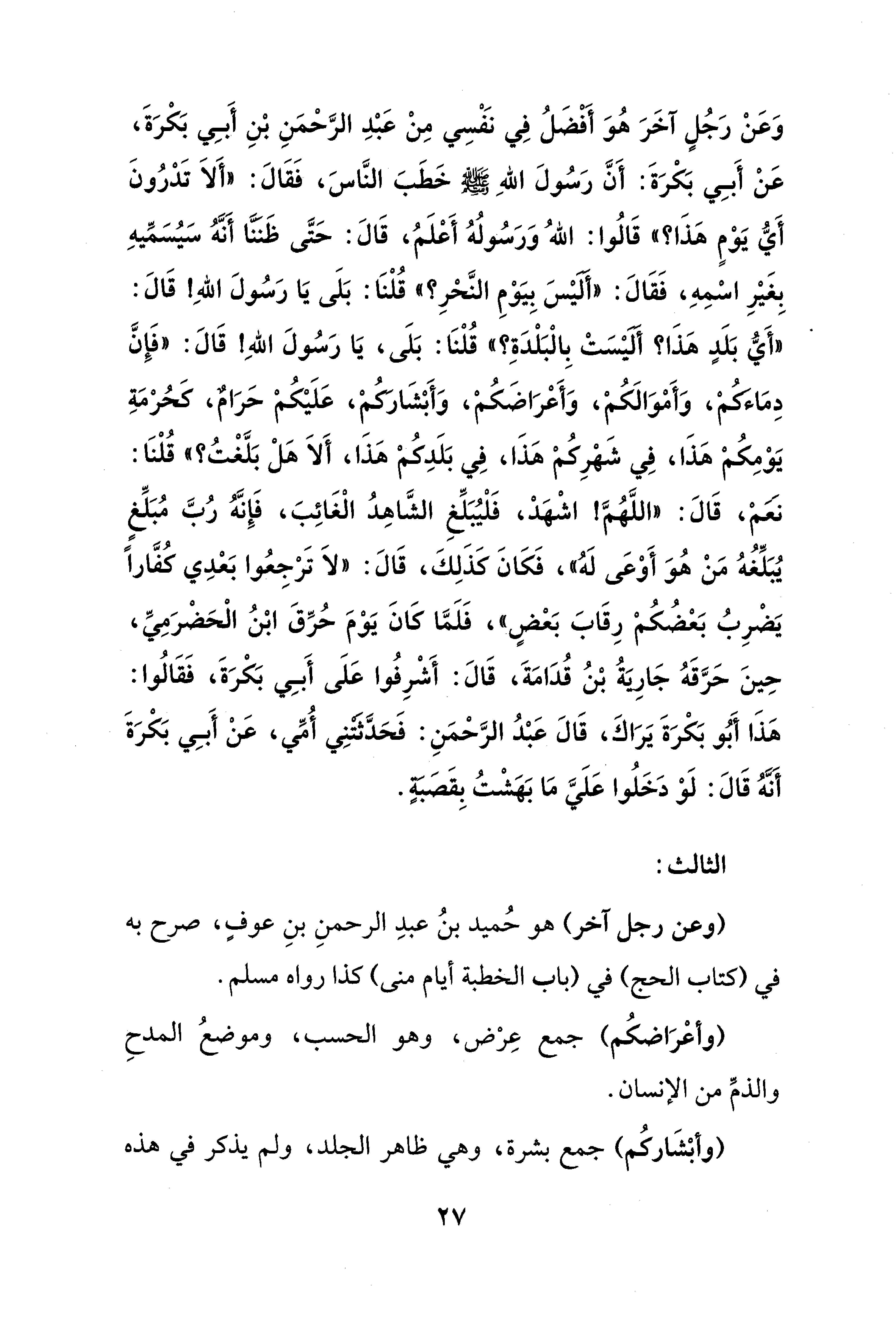 وَعَنْ رَجُلٍ آخَرَ هُوَ أَفْضَلُ فِي نَفْسِي مِنْ عَبْدِ الرحْمَنِ بنِ أَبِي بَكْرَةَ، عَنْ أَبِي بَكْرَةَ: أَنَّ رَسُولَ اللهِ - صلى الله عليه وسلم - خَطَبَ النَّاسَ، فَقَالَ: "أَلاَ تَدْرُونَ أَيُّ يَوْمٍ هَذَا؟ " قَالُوا: اللهُ وَرَسُولُهُ أَعْلَمُ، قَالَ: حَتَّى ظَنَنَّا أنَّهُ سَيُسَمِّيهِ بِغَيْرِ اسْمِهِ، فَقَالَ: "أليْسَ بِيَوْمِ النَّحْرِ؟ " قُلْنَا: بَلَى يَا رَسُولَ اللهِ قَالَ: "أَيُّ بَلَدٍ هَذَا؟ أليْسَتْ بِالْبَلْدَةِ؟ " قُلْنَا: بَلَى، يَا رَسُولَ اللهِ! قَالَ: "فَإِنَّ دِمَاءكمْ، وَأَمْوَالَكُمْ، وَأَعْرَاضَكُمْ، وَأَبْشَاركمْ، عَلَيْكُمْ حَرَام، كحُرْمَةِ يَوْمِكُمْ هَذَا، فِي شَهْرِكمْ هَذَا، فِي بَلَدِكمْ هَذَا، أَلاَ هَلْ بَلَّغْتُ؟ " قُلْنَا: نعمْ، قَالَ: "اللَّهُمَّ! اشْهَدْ، فَلْيُبَلِّغِ الشَّاهِدُ الْغَائِبَ، فَإِنَّهُ رُبَّ مُبَلِّغٍ يُبَلِّغُهُ مَنْ هُوَ أَوْعَى لَهُ"، فَكَانَ كَذَلِكَ، قَالَ: "لَا تَرْجِعُوا بَعْدِي كُفَّارًا يَضْرِبُ بَعْضُكُمْ رِقَابَ بَعْضٍ"، فَلَمَّا كَانَ يَوْمَ حُرِّقَ ابْنُ الْحَضْرَمِيِّ، حِينَ حَرَّقَهُ جَارِيَةُ بْنُ قُدَامَةَ، قَالَ: أَشْرِفُوا عَلَى أَبِي بَكْرَةَ، فَقَالُوا: هَذَا أَبُو بَكْرَةَ يَرَاكَ، قَالَ عَبْدُ الرَّحْمَنِ: فَحَدَّثتنِي أُمِّي، عَنْ أَبِي بَكْرَةَ أَنَّهُ قَالَ: لَوْ دَخَلُوا عَلَيَّ مَا بَهَشْتُ بِقَصَبَةٍ.