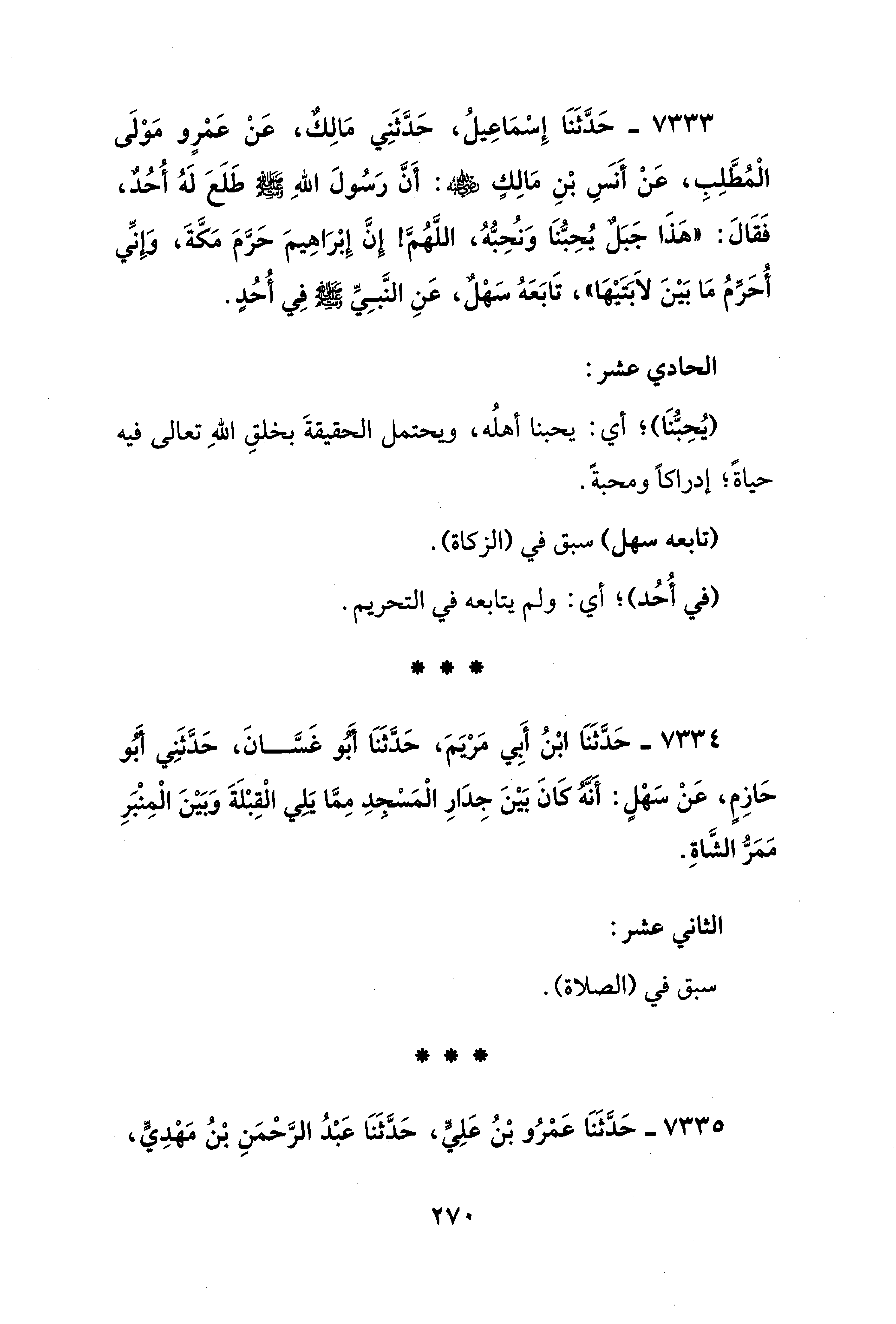 7333 - حَدَّثَنَا إِسْمَاعِيلُ، حَدَّثَنِي مَالِكٌ، عَنْ عَمْرٍو مَوْلَى الْمُطَّلِبِ، عَنْ أَنَسِ بْنِ مَالِكٍ - رضي الله عنه -: أَنَّ رَسُولَ اللهِ - صلى الله عليه وسلم - طَلَعَ لَهُ أُحُدٌ، فَقَالَ: "هَذَا جَبَلٌ يُحِبُّنَا وَنُحِبُّهُ، اللَّهُمَّ! إِنَّ إِبْرَاهِيمَ حَرَّمَ مَكَّةَ، وَإِنِّي أُحَرِّمُ مَا بَيْنَ لاَبَتَيْهَا"، تَابَعَهُ سَهْلٌ، عَنِ النَّبِيِّ - صلى الله عليه وسلم - فِي أُحُدٍ.