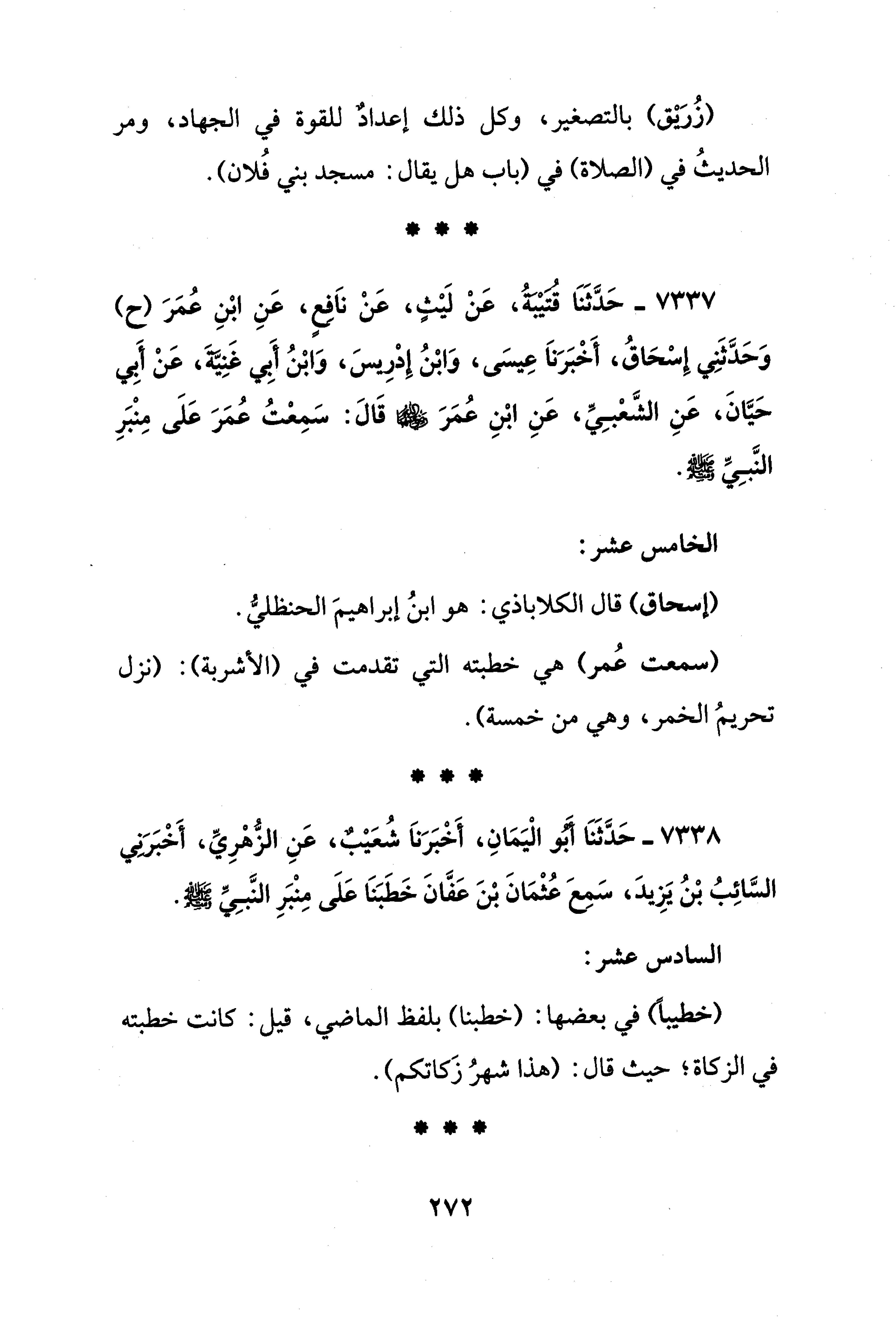 7338 - حَدَّثَنَا أَبُو الْيَمَانِ، أَخْبَرَنَا شُعَيْبٌ، عَنِ الزُّهْرِيِّ، أَخْبَرَنِي السَّائِبُ بْنُ يَزِيدَ، سَمِعَ عُثْمَانَ بْنَ عَفَّانَ خَطَبَنَا عَلَى مِنْبَرِ النَّبِيِّ - صلى الله عليه وسلم -.