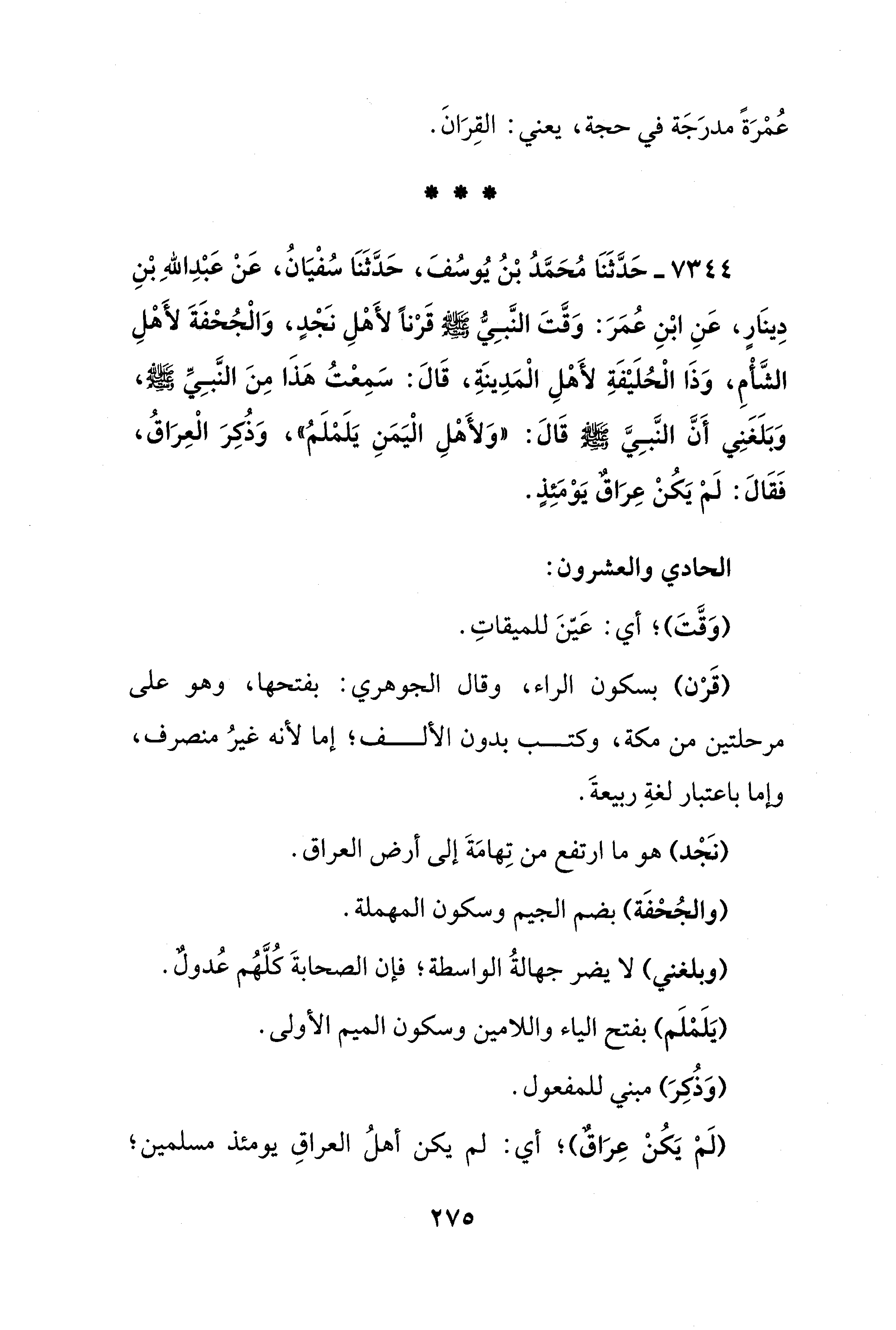 7344 - حَدَّثَنَا مُحَمَّدُ بْنُ يُوسُفَ، حَدَّثَنَا سُفْيَانُ، عَنْ عَبْدِ اللهِ بْنِ دِينَارٍ، عَنِ ابْنِ عُمَرَ: وَقَّتَ النَّبِيُّ - صلى الله عليه وسلم - قَرْنًا لَأَهْلِ نَجْدٍ، وَالْجُحْفَةَ لأَهْلِ الشَّأْمِ، وَذَا الْحُلَيْفَةِ لأَهْلِ الْمَدِينَةِ، قَالَ: سَمِعْتُ هَذَا مِنَ النَّبِيِّ - صلى الله عليه وسلم -، وَبَلَغَنِي أَنَّ النَّبِيَّ - صلى الله عليه وسلم - قَالَ: "وَلأَهْلِ الْيَمَنِ يَلَمْلَمُ"، وَذُكِرَ الْعِرَاقُ، فَقَالَ: لَمْ يَكُنْ عِرَاقٌ يَوْمَئِذٍ.