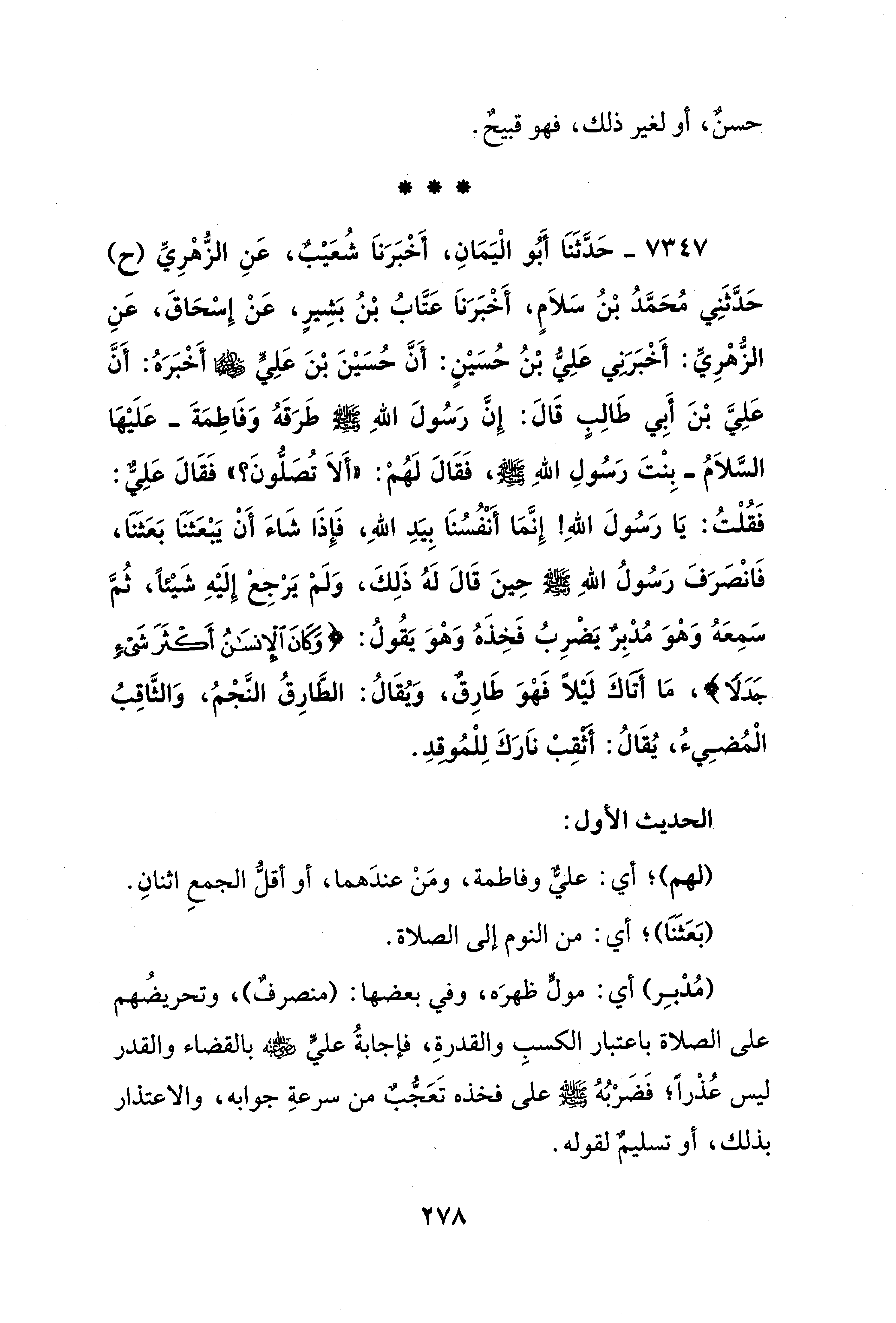 7347 - حَدَّثَنَا أَبُو الْيَمَانِ، أَخْبَرَنَا شُعَيْبٌ، عَنِ الزُّهْرِيِّ (ح) حَدَّثَنِي مُحَمَّدُ بْنُ سَلَامٍ، أَخْبَرَنَا عَتَّابُ بْنُ بَشِيرٍ، عَنْ إِسْحَاقَ، عَنِ الزُّهْرِيِّ: أَخْبَرَنِي عَلِيُّ بْنُ حُسَيْنٍ: أَنَّ حُسَيْنَ بْنَ عَلِيٍّ - رضي الله عنهما - أَخْبَرَهُ: أَنَّ عَلِيَّ بْنَ أَبِي طَالِبٍ قَالَ: إِنَّ رَسُولَ اللهِ - صلى الله عليه وسلم - طَرَقَهُ وَفَاطِمَةَ -عَلَيْهَا السَّلاَمُ- بِنْتَ رَسُولِ اللهِ - صلى الله عليه وسلم -، فَقَالَ لَهُمْ: "أَلاَ تُصَلُّونَ؟ " فَقَالَ عَلِيٌّ: فَقُلْتُ: يَا رَسُولَ اللهِ! إِنَّمَا أَنْفُسُنَا بِيَدِ اللهِ، فَإِذَا شَاءَ أَنْ يَبْعَثَنَا بَعَثَنَا، فَانْصَرَفَ رَسُولُ اللهِ - صلى الله عليه وسلم - حِينَ قَالَ لَهُ ذَلِكَ، وَلَمْ يَرْجِعْ إِلَيْهِ شَيْئًا، ثُمَّ سَمِعَهُ وَهْوَ مُدْبِرٌ يَضْرِبُ فَخِذَهُ وَهْوَ يَقُولُ: {وَكَانَ الْإِنْسَانُ أَكْثَرَ شَيْءٍ جَدَلًا}، مَا أتَاكَ لَيْلًا فَهْوَ طَارِقٌ، ويُقَالُ: الطَّارِقُ النَّجْمُ، وَالثَّاقِبُ الْمُضِيءُ، يُقَالُ: أَثْقِبْ نَارَكَ لِلْمُوقِدِ.