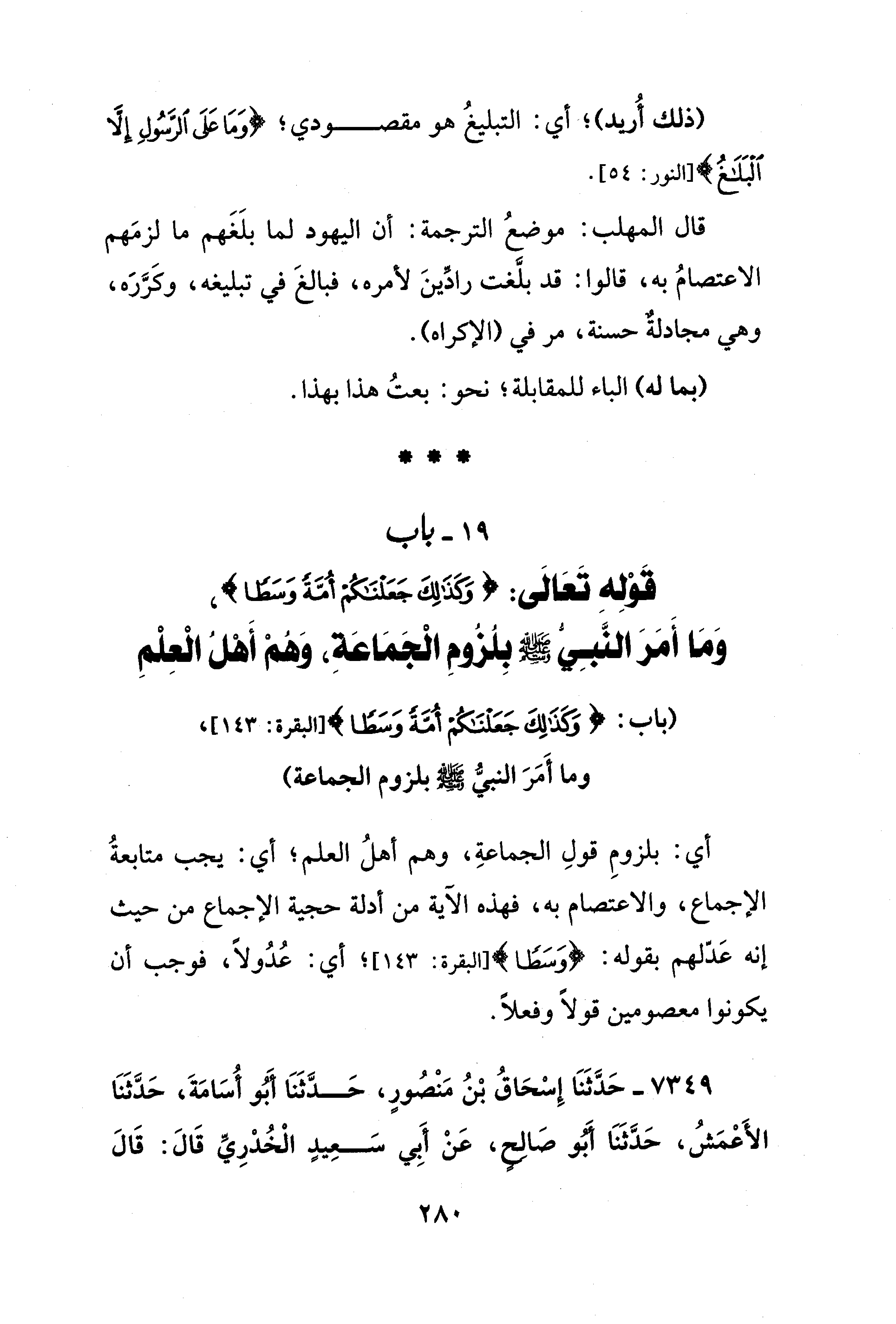 19 - باب قَوِلِهِ تَعَالَى: {وَكَذَلِكَ جَعَلْنَاكُمْ أُمَّةً وَسَطًا}، وَمَا أَمَرَ النَّبِيُّ - صلى الله عليه وسلم - بِلُزُومِ الْجَمَاعَةِ، وَهُمْ أَهْلُ الْعِلْمِ
