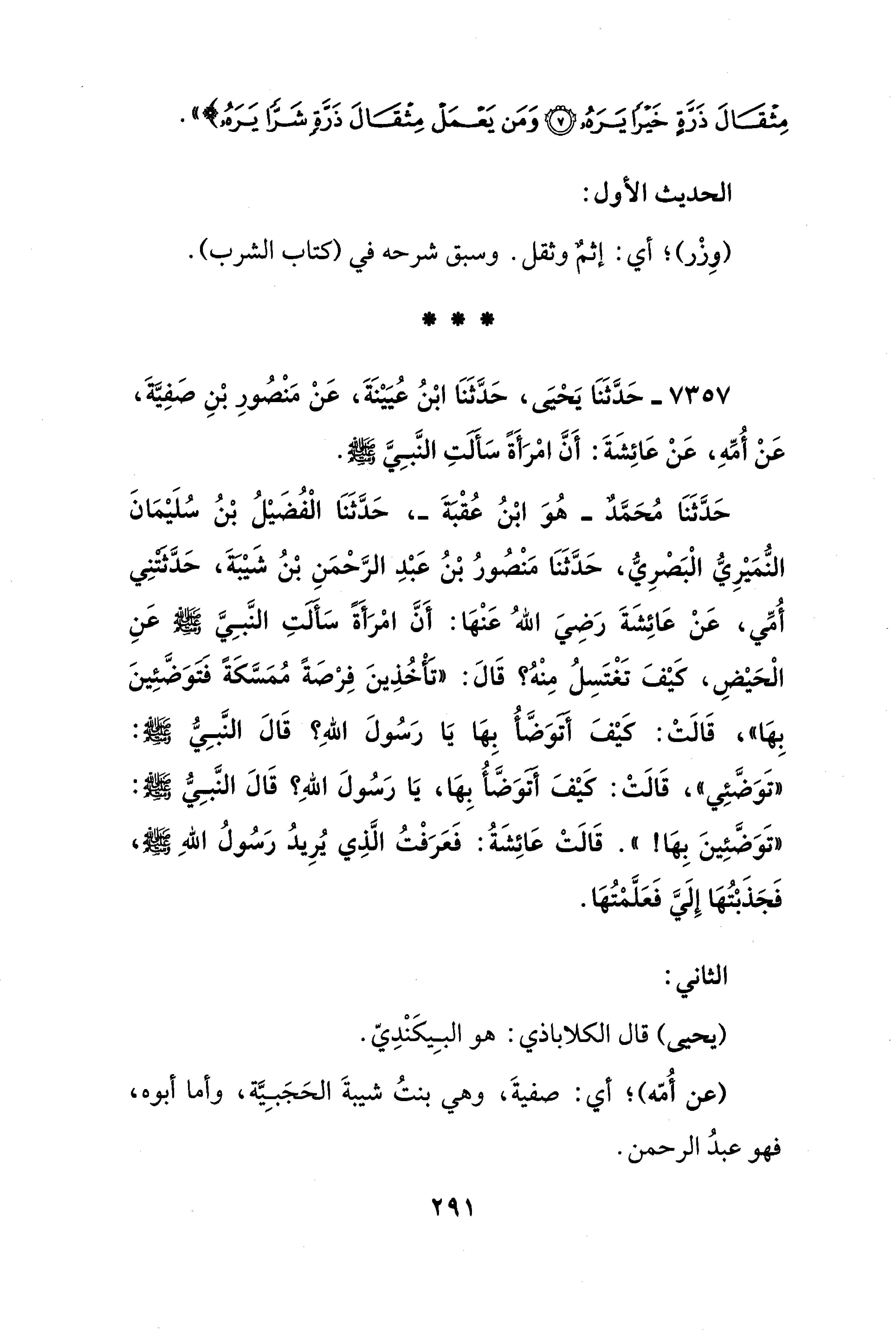 7357 - حَدَّثَنَا يَحْيَى، حَدَّثَنَا ابْنُ عُيَيْنَةَ، عَنْ مَنْصُورِ بْنِ صَفِيَّةَ، عَنْ أُمِّهِ، عَنْ عَائِشَةَ: أَنَّ امْرَأَةً سَألتِ النَّبِيَّ - صلى الله عليه وسلم -.