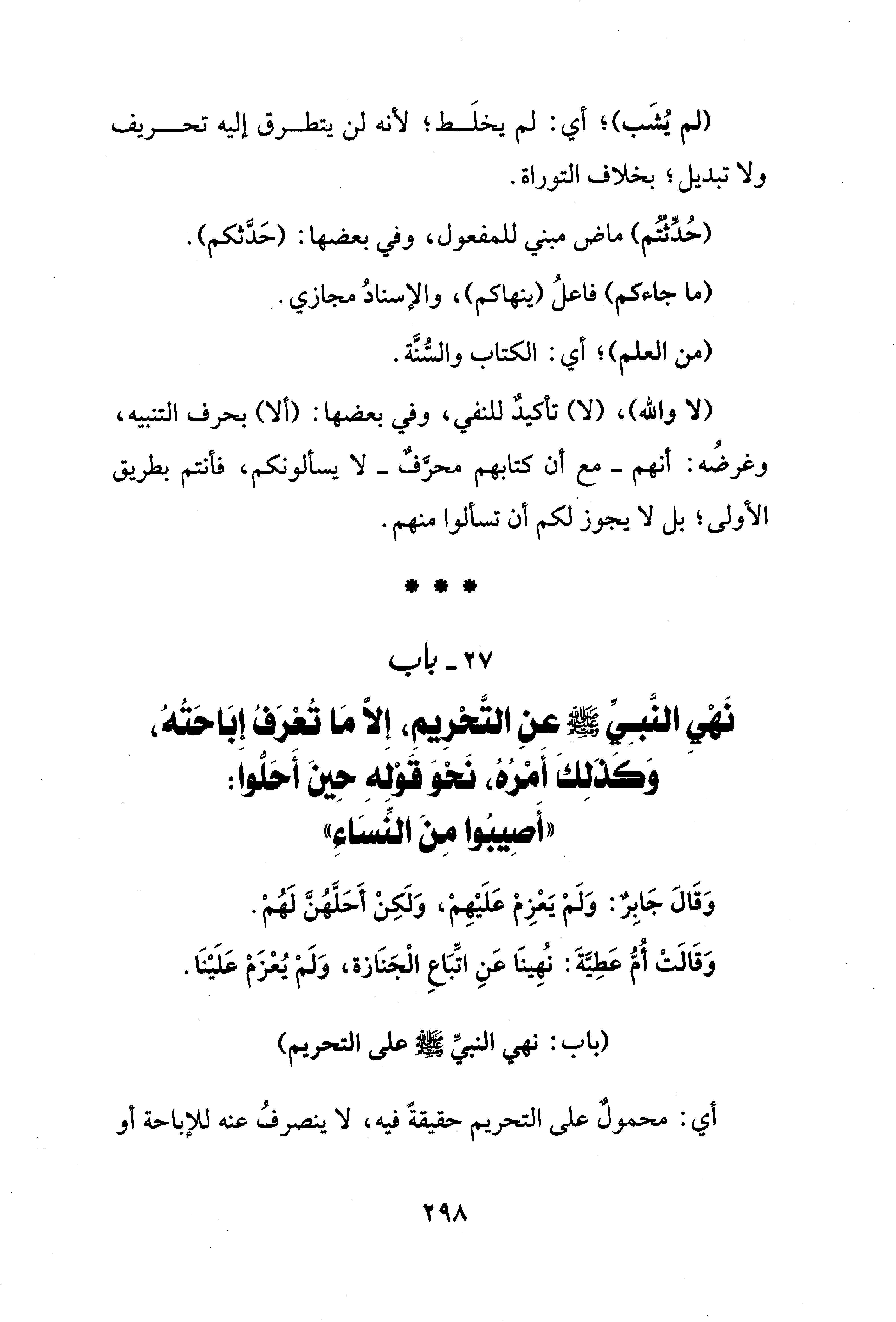 27 - باب نَهْي النَّبِيِّ - صلى الله عليه وسلم - عنِ التَّحْرِيمِ، إِلّا مَا تُعْرَفُ إِبَاحَتُهُ، وَكَذَلِكَ أَمْرُهُ، نَحْوَ قَوْلِهِ حِينَ أَحَلُّوا: "أَصِيبُوا مِنَ النِّسَاءِ"