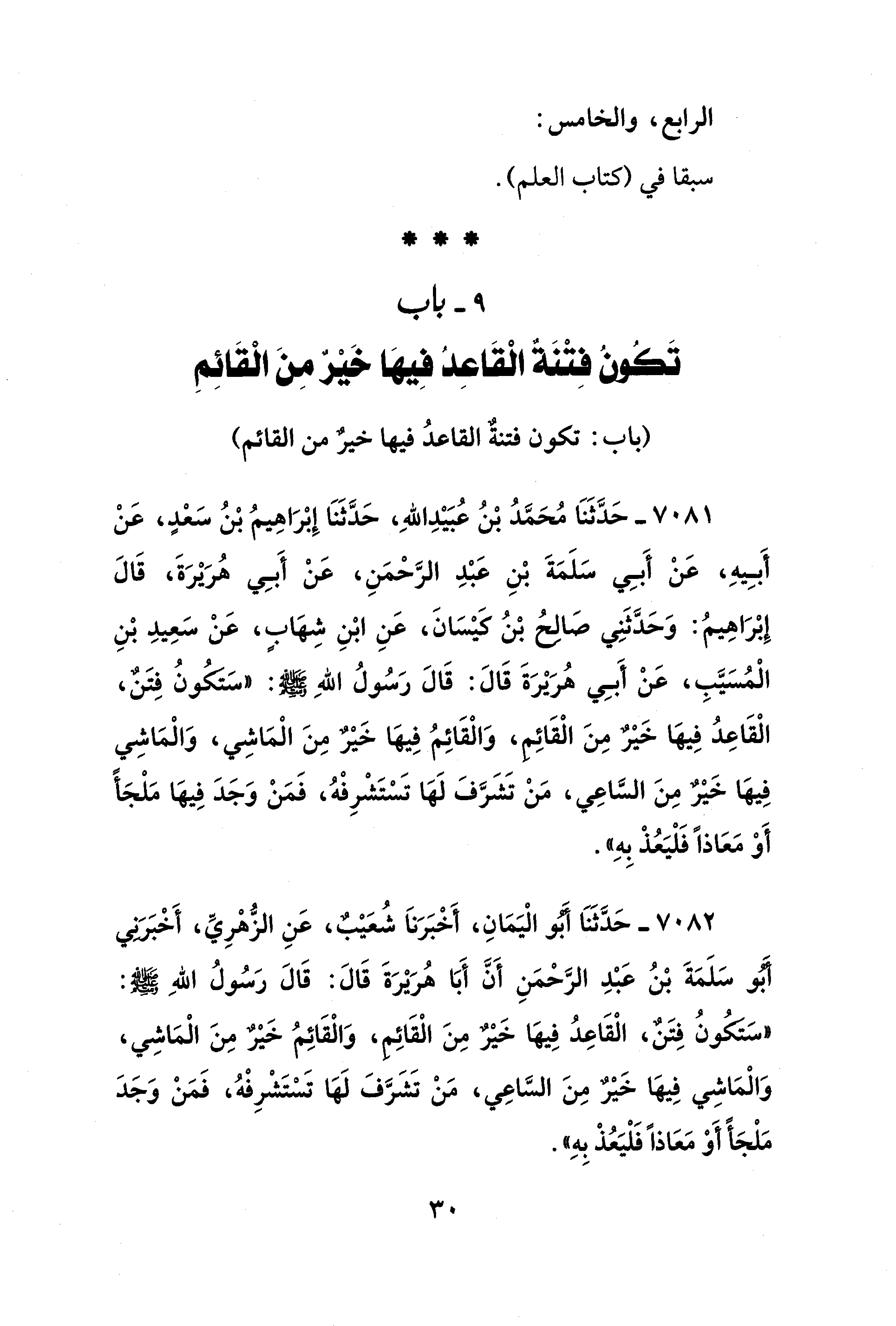 9 - باب تَكونُ فِتْنَةٌ الْقَاعِدُ فِيهَا خَيْرٌ مِنَ الْقَائِمِ