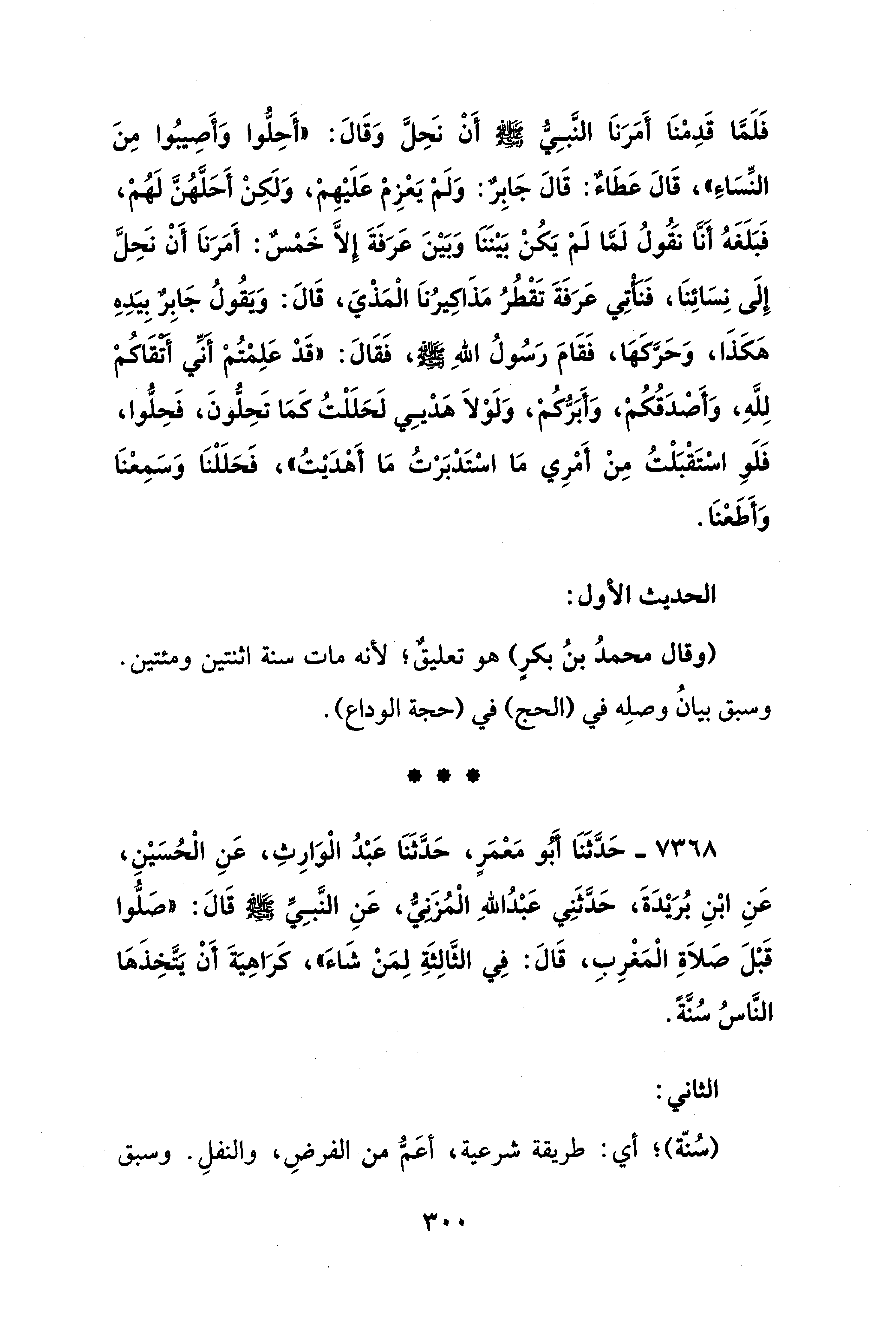 7368 - حَدَّثَنَا أَبُو مَعْمَرٍ، حَدَّثَنَا عَبْدُ الْوَارِثِ، عَنِ الْحُسَيْنِ، عَنِ ابْنِ بُرَيْدَةَ، حَدَّثَنِي عَبْدُ اللهِ الْمُزَنِيُّ، عَنِ النَّبِيِّ - صلى الله عليه وسلم - قَالَ: "صَلُّوا قَبْلَ صلاَةِ الْمَغْرِبِ، قَالَ: فِي الثَّالِثَةِ لِمَنْ شَاءَ"، كَرَاهِيةَ أَنْ يَتَّخِذَهَا النَّاسُ سُنَّةً.