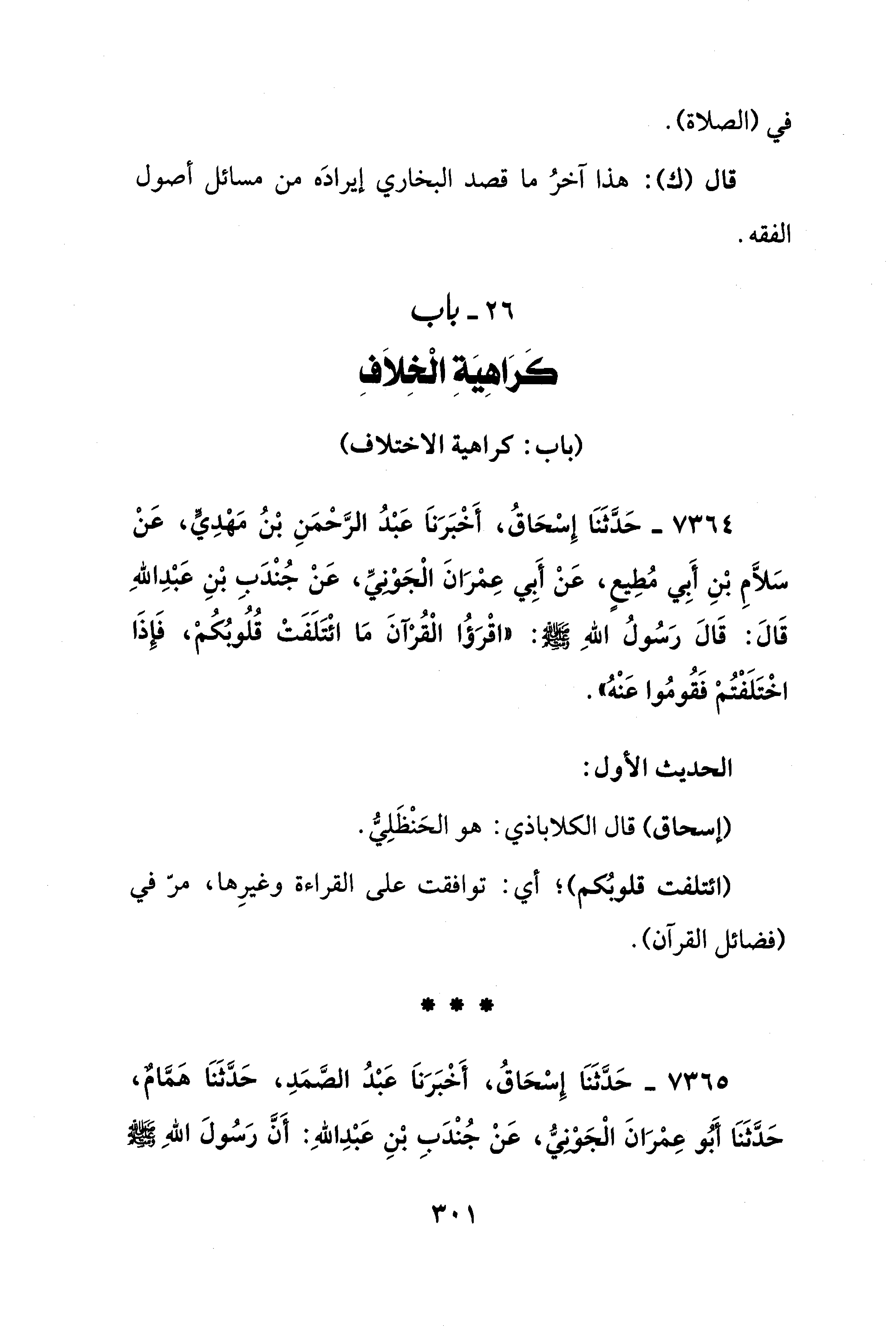 7364 - حَدَّثَنَا إِسْحَاقُ، أَخْبَرَنَا عَبْدُ الرَّحْمَنِ بْنُ مَهْدِيٍّ، عَنْ سَلَّامِ بْنِ أَبِي مُطِيعٍ، عَنْ أَبِي عِمْرَانَ الْجَوْنِيِّ، عَنْ جُنْدَبِ بْنِ عَبْدِ اللهِ قَالَ: قَالَ رَسُولُ اللهِ - صلى الله عليه وسلم -: "اقْرَؤُا الْقُرْآنَ مَا ائْتَلَفَتْ قُلُوُبكُمْ، فَإِذَا اخْتَلَفْتُمْ فَقُومُوا عَنْهُ".