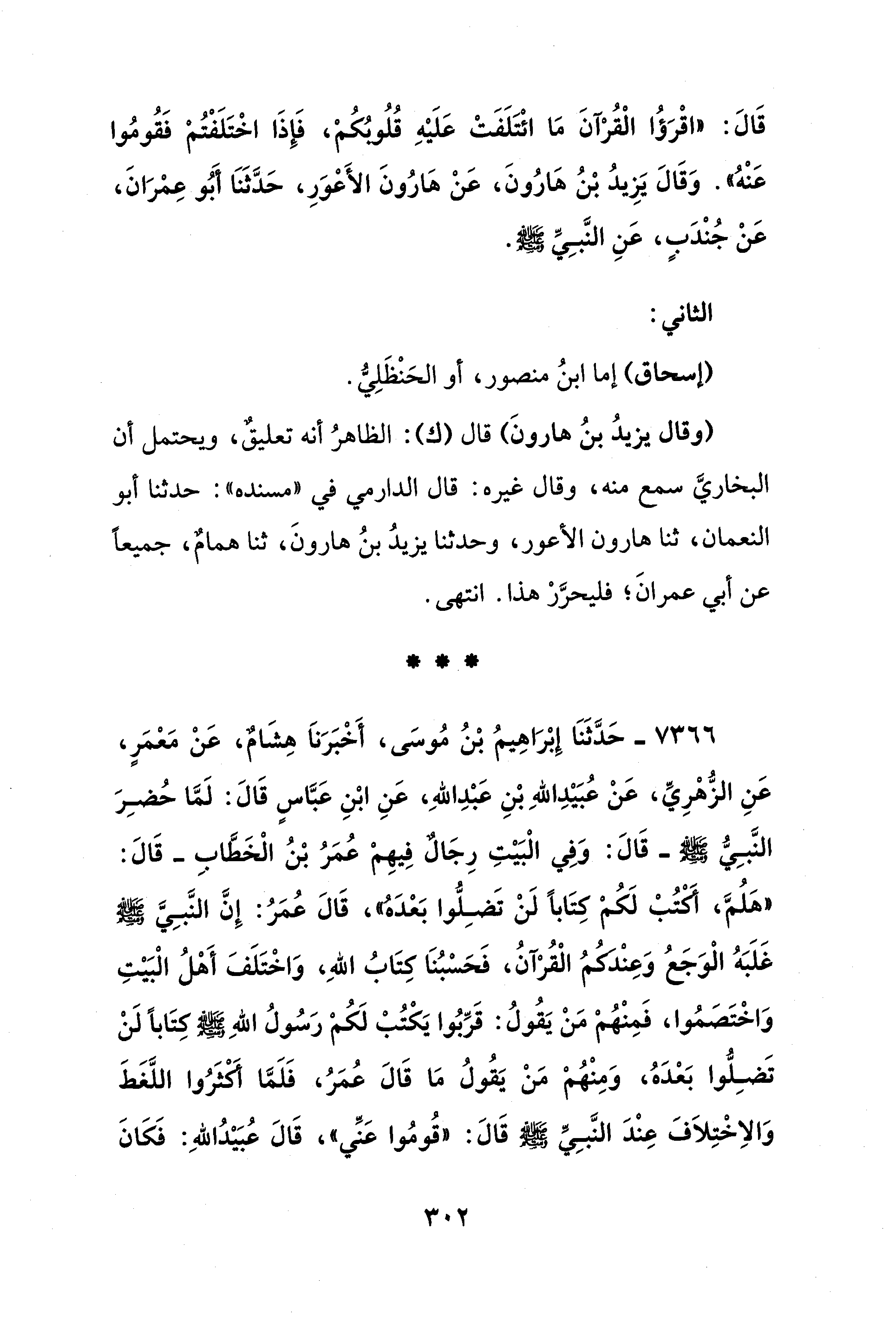 7366 - حَدَّثَنَا إِبْرَاهِيمُ بْنُ مُوسَى، أَخْبَرَنَا هِشَامٌ، عَنْ مَعْمَرٍ، عَنِ الزُّهْرِيِّ، عَنْ عُبَيْدِ اللهِ بْنِ عَبْدِ اللهِ، عَنِ ابْنِ عَبَّاسٍ قَالَ: لَمَّا حُضِرَ النَّبِيُّ - صلى الله عليه وسلم - قَالَ: وَفِي الْبَيْتِ رِجَالٌ فِيهِمْ عُمَرُ بْنُ الْخَطَّابِ -قَالَ: "هَلُمَّ، أَكْتُبْ لَكُمْ كِتَابًا لَنْ تَضِلُّوا بَعْدَهُ"، قَالَ عُمَرُ: إِنَّ النَّبِيَّ - صلى الله عليه وسلم - غَلَبَهُ الْوَجَعُ وَعِنْدَكُمُ الْقُرْآنُ، فَحَسْبُنَا كِتَابُ اللهِ، وَاخْتَلَفَ أَهْلُ الْبَيْتِ وَاخْتَصَمُوا، فَمِنْهُمْ مَنْ يَقُولُ: قَرِّبُوا يَكْتُبْ لَكُمْ رَسُولُ اللهِ - صلى الله عليه وسلم - كِتَابًا لَنْ تَضِلُّوا بَعْدَهُ، وَمِنْهُمْ مَنْ يَقُولُ مَا قَالَ عُمَرُ، فَلَمَّا أَكْثَرُوا اللَّغَطَ وَالاِخْتِلاَفَ عِنْدَ النَّبِيِّ - صلى الله عليه وسلم - قَالَ: "قُومُوا عَنِّي"، قَالَ عُبَيْدُ اللهِ: فَكَانَ