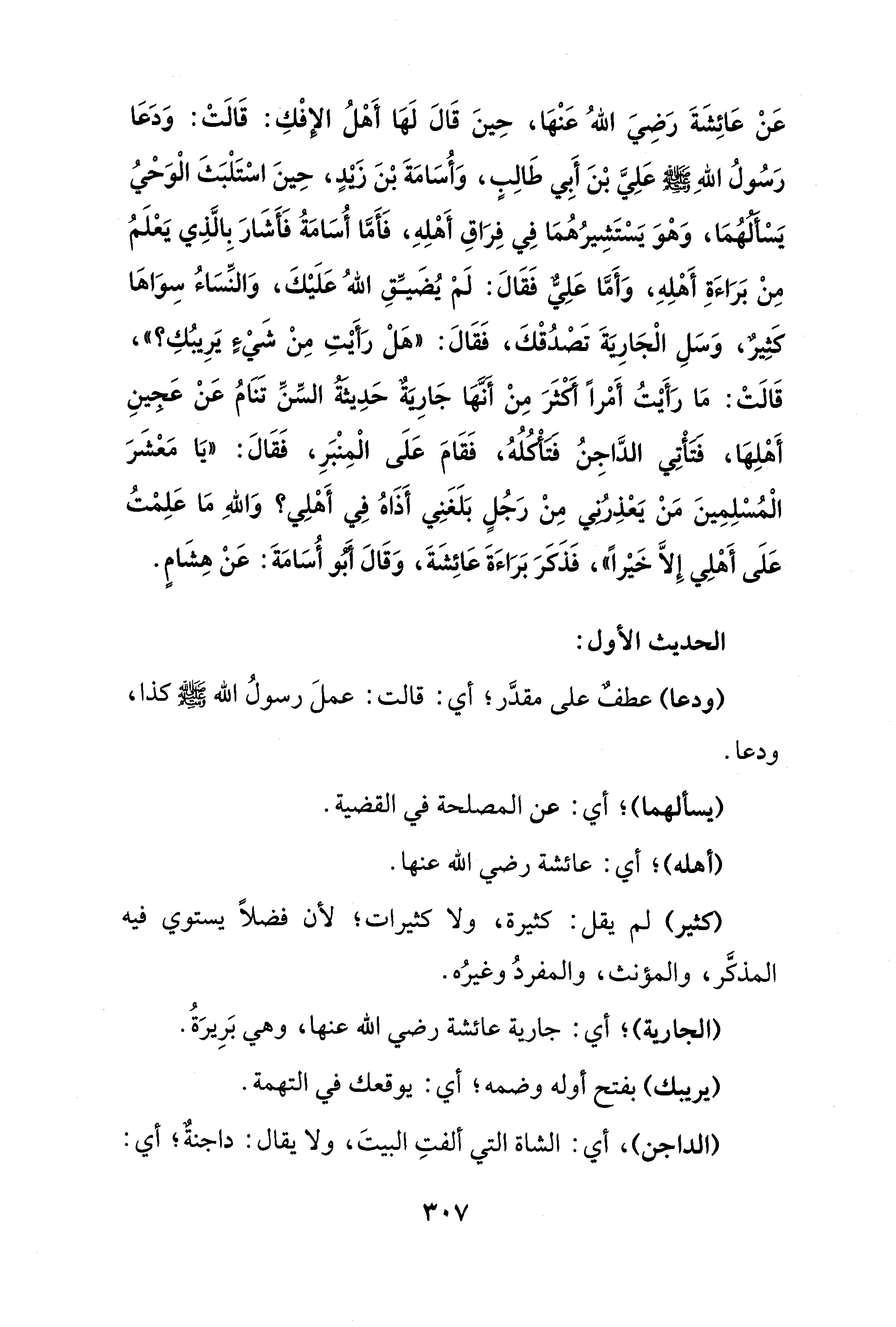 عَنْ عَائِشَةَ رَضِيَ اللهُ عَنْهَا، حِينَ قَالَ لَهَا أَهْلُ الإِفْكِ: قَالَتْ: وَدَعَا رَسُولُ اللهِ - صلى الله عليه وسلم - عَلِيَّ بْنَ أَبِي طَالِبٍ، وَأُسَامَةَ بْنَ زيدٍ، حِينَ استَلْبَثَ الْوَحْيُ يَسْأَلُهُمَا، وَهْوَ يَسْتَشِيرُهُمَا فِي فِرَاقِ أَهْلِهِ، فَأَمَّا أُسَامَةُ فَأَشَارَ بِالَّذِي يَعْلَمُ مِنْ بَرَاءَةِ أَهْلِهِ، وَأَمَّا عَلِيٌّ فَقَالَ: لَمْ يُضَيِّقِ اللهُ عَلَيْكَ، وَالنِّسَاءُ سوَاهَا كَثِيرٌ، وَسَلِ الْجَارِيَةَ تَصْدُقْكَ، فَقَالَ: "هَلْ رَأَيْتِ مِنْ شَيْءٍ يَرِيبُكِ؟ "، قَالَتْ: مَا رَأَيْتُ أَمْرًا أَكْثَرَ مِنْ أَنَّهَا جَارِيَةٌ حَدِيثَةُ السِّنِّ تَنَامُ عَنْ عَجينِ أَهْلِهَا، فَتَأْتِي الدَّاجِنُ فتَأْكُلُهُ، فَقَامَ عَلَى الْمِنْبَرِ، فَقَالَ: "يَا مَعْشَرَ الْمُسْلِمِينَ مَنْ يَعْذِرُني مِنْ رَجُلٍ بَلَغَنِي أَذَاهُ فِي أَهْلِي؟ وَاللهِ مَا عَلِمْتُ عَلَى أَهْلِي إِلَّا خَيْرًا"، فَذَكَرَ بَرَاءَةَ عَائِشَةَ، وَقَالَ أَبُو أُسَامَةَ: عَنْ هِشَامٍ.