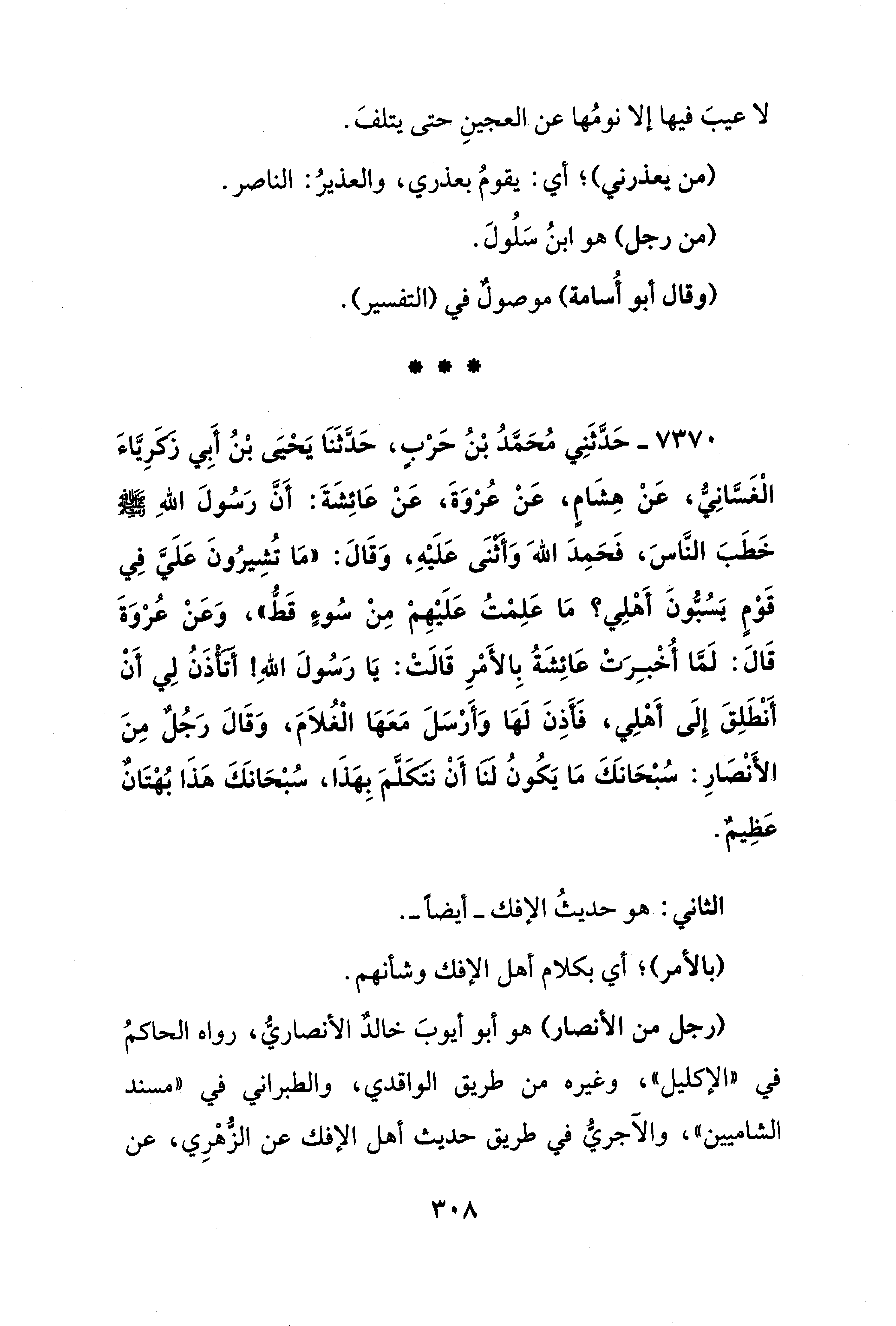 7370 - حَدَّثَنِي مُحَمَّدُ بْنُ حَرْبٍ، حَدَّثَنَا يَحْيَى بْنُ أَبِي زَكَرِيَّاءَ الْغَسَّانِيُّ، عَنْ هِشَامٍ، عَنْ عُرْوَةَ، عَنْ عَائِشَةَ: أَنَّ رَسُولَ اللهِ - صلى الله عليه وسلم - خَطَبَ النَّاسَ، فَحَمِدَ اللهَ وَأَثْنَى عَلَيْهِ، وَقَالَ: "مَا تُشِيرُونَ عَلَيَّ فِي قَوْمٍ يَسُبُّونَ أَهْلِي؟ مَا عَلِمْتُ عَلَيْهِمْ مِنْ سُوءٍ قَطُّ"، وَعَنْ عُرْوَةَ قَالَ: لَمَّا أُخْبِرَتْ عَائِشَةُ بِالأَمْرِ قَالَتْ: يَا رَسُولَ اللهِ! أَتَأْذَنُ لِي أَنْ أَنْطَلِقَ إِلَى أَهْلِي، فَأَذِنَ لَهَا وَأَرْسَلَ مَعَهَا الْغُلاَمَ، وَقَالَ رَجُلٌ مِنَ الأَنْصَارِ: سُبْحَانَكَ مَا يَكُونُ لَنَا أَنْ نتَكَلَّمَ بِهَذَا، سُبْحَانَكَ هَذَا بُهْتَانٌ عَظِيمٌ.