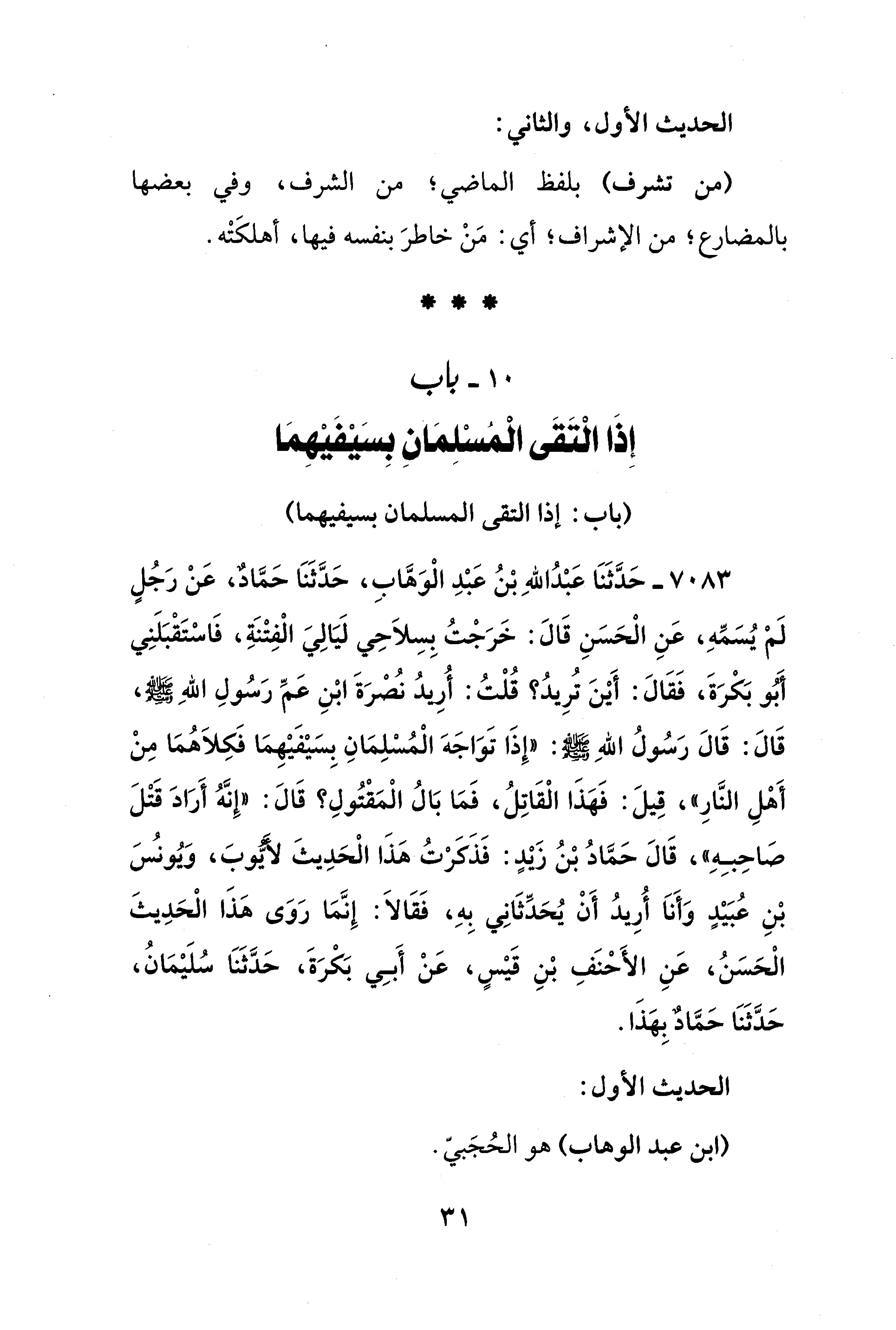 7083 - حَدَّثَنَا عَبْدُ اللهِ بْنُ عَبْدِ الْوَهَّابِ، حَدَّثَنَا حَمَّاد، عَنْ رَجُلٍ لَمْ يُسَمِّهِ، عَنِ الْحَسَنِ قَالَ: خَرَجْتُ بِسِلاَحِي لَيَالِيَ الْفِتْنَةِ، فَاسْتَقْبَلَنِي أَبُو بَكْرَةَ، فَقَالَ: أَيْنَ تُرِيدُ؟ قُلْتُ: أُرِيدُ نُصْرَةَ ابْنِ عَمِّ رَسُولِ اللهِ - صلى الله عليه وسلم -، قَالَ: قَالَ رَسُولُ اللهِ - صلى الله عليه وسلم -: "إِذَا تَوَاجَهَ الْمُسْلِمَانِ بِسَيْفَيْهِمَا فَكِلاَهُمَا مِنْ أَهْلِ النَّار"، قِيلَ: فَهَذَا الْقَاتِلُ، فَمَا بَالُ الْمَقْتُولِ؟ قَالَ: "إِنَّهُ أَرَادَ قَتْلَ صَاحِبِه"، قَالَ حَمَّادُ بْنُ زيدٍ: فَذَكرْتُ هَذَا الْحَدِيثَ لأيُّوبَ، وَيُونسُ بْنِ عُبَيْدٍ وَأَنَا أُرِيدُ أَنْ يُحَدِّثَانِي بِهِ، فَقَالَا: إِنَّمَا رَوَى هَذَا الْحَدِيثَ الْحَسَنُ، عَنِ الأَحْنَفِ بْنِ قَيْسٍ، عَنْ أَبِي بَكْرَةَ، حَدَّثَنَا سُلَيْمَانُ، حَدَّثَنَا حَمَّادٌ بِهَذَا.