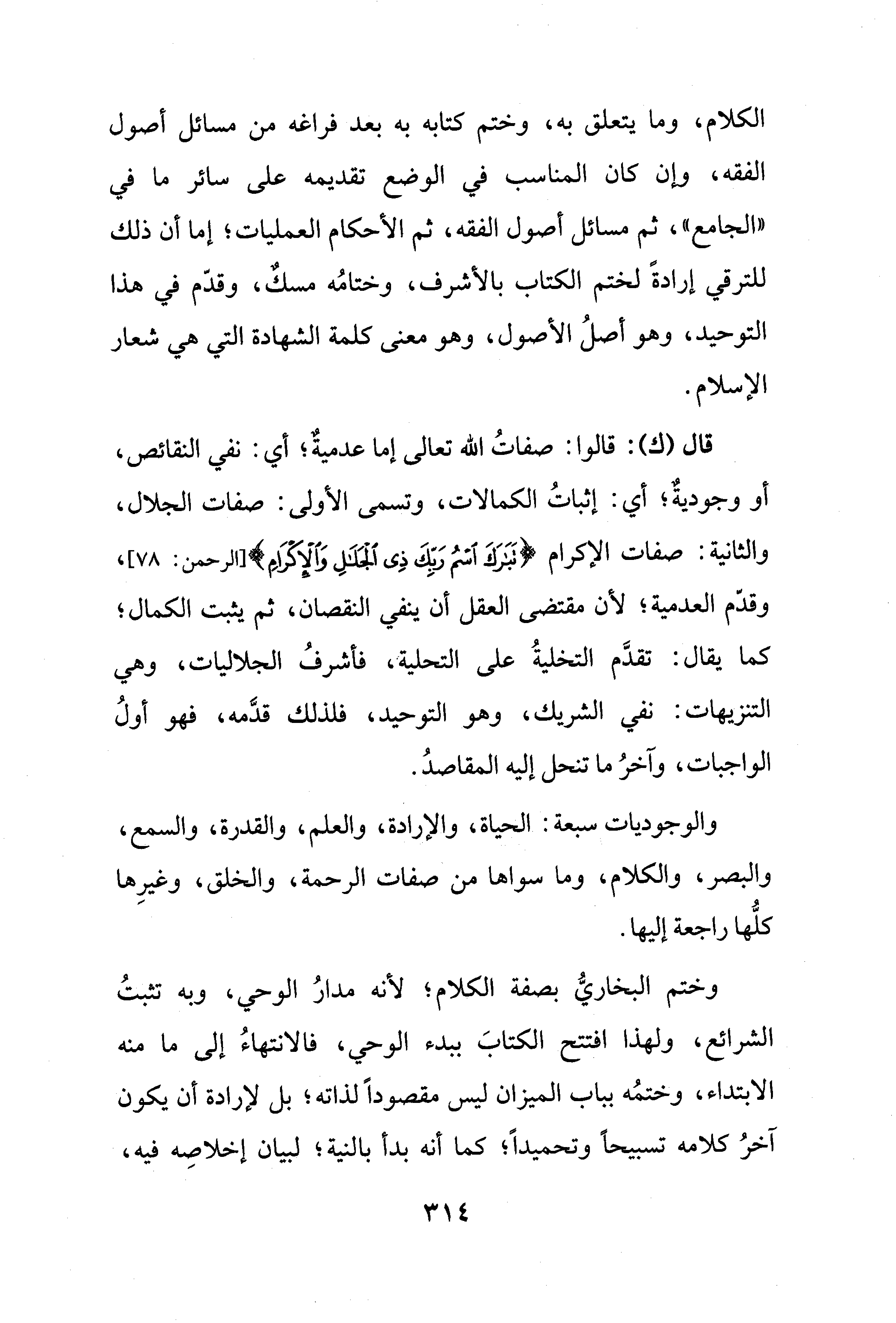 قال (ك): قالوا: صفاتُ الله تعالى إما عدميةٌ؛ أي: نفي النقائص، أو وجوديةٌ؛ أي: إثباتُ الكمالات، وتسمى الأولى: صفات الجلال، والثانية: صفات الإكرام {تَبَارَكَ اسْمُ رَبِّكَ ذِي الْجَلَالِ وَالْإِكْرَامِ} [الرحمن: 78]، وقدّم العدمية؛ لأن مقتضى العقل أن ينفي النقصان، ثم يثبت الكمال؛ كما يقال: تقدَّم التخليةُ على التحلية، فأشرفُ الجلاليات، وهي التنزيهات: نفي الشريك، وهو التوحيد، فلذلك قدَّمه، فهو أولُ الواجبات، وآخرُ ما تنحل إليه المقاصدُ.