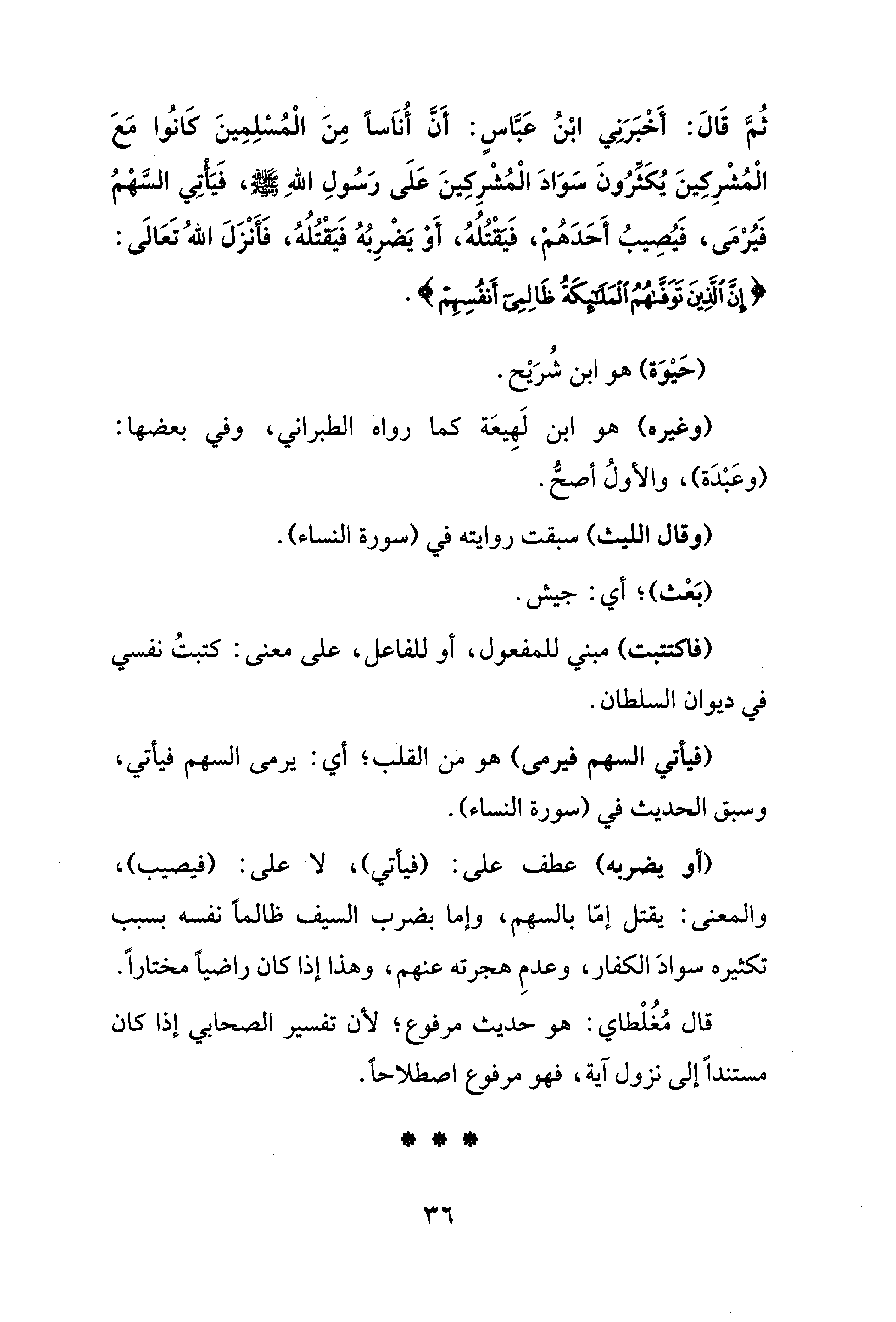 ثُمَّ قَالَ: أَخْبَرَني ابْنُ عَبَّاسٍ: أَنَّ أُنَاسًا مِنَ الْمُسْلِمِينَ كَانُوا مَعَ الْمُشْرِكينَ يُكَثِّرُونَ سَوَادَ الْمُشْرِكينَ عَلَى رَسُولِ اللهِ - صلى الله عليه وسلم -، فَيَأْتِي السَّهْمُ فَيُرْمَى، فَيُصِيبُ أَحَدَهُمْ، فَيقْتُلُهُ، أَوْ يَضْرِبُهُ فَيقْتُلُهُ، فَأنْزَلَ اللهُ تَعَالَى: {إِنَّ الَّذِينَ تَوَفَّاهُمُ الْمَلَائِكَةُ ظَالِمِي أَنْفُسِهِمْ}.