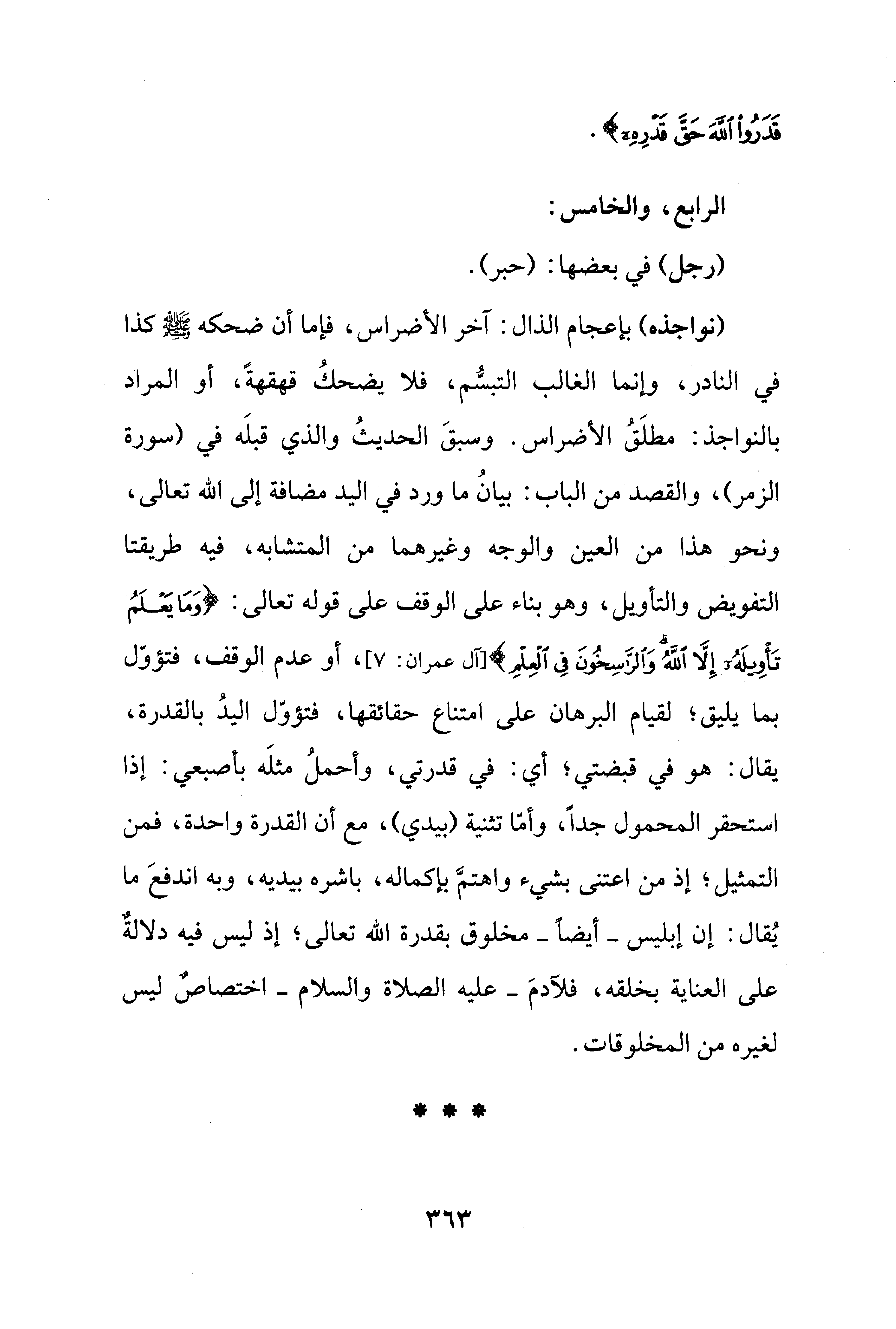 (نواجذه) بإعجام الذال: آخر الأضراس، فإما أن ضحكه - صلى الله عليه وسلم - كذا في النادر، وإنما الغالب التبسُّم، فلا يضحكُ قهقهةً، أو المراد بالنواجذ: مطلَقُ الأضراس. وسبقَ الحديثُ والذي قبلَه في (سورة الزمر)، والقصد من الباب: بيانُ ما ورد في اليد مضافة إلى الله تعالى، ونحو هذا من العين والوجه وغيرهما من المتشابه، فيه طريقتا التفويض والتأويل، وهو بناء على الوقف على قوله تعالى: {وَمَا يَعْلَمُ تَأْوِيلَهُ إلا اللَّهُ وَالرَّاسِخُونَ فِي الْعِلْمِ} [آل عمران: 7]، أو عدم الوقف، فتؤوّل بما يليق؛ لقيام البرهان على امتناع حقائقها، فتؤوّل اليدُ بالقدرة، يقال: هو في قبضتي؛ أي: في قدرتي، وأحملُ مثلَه بأصبعي: إذا استحقر المحمول جدًّا، وأمّا تثنية (بيدي)، مع أن القدرة واحدة، فمن التمثيل؛ إذ من اعتنى بشيء واهتمَّ بإكماله، باشره بيديه، وبه اندفعَ ما يُقال: إن إبليس -أيضًا- مخلوق بقدرة الله تعالى؛ إذ ليس فيه دلالةٌ على العناية بخلقه، فلآدمَ - عليه الصلاة والسلام - اختصاصٌ ليس لغيره من المخلوقات.