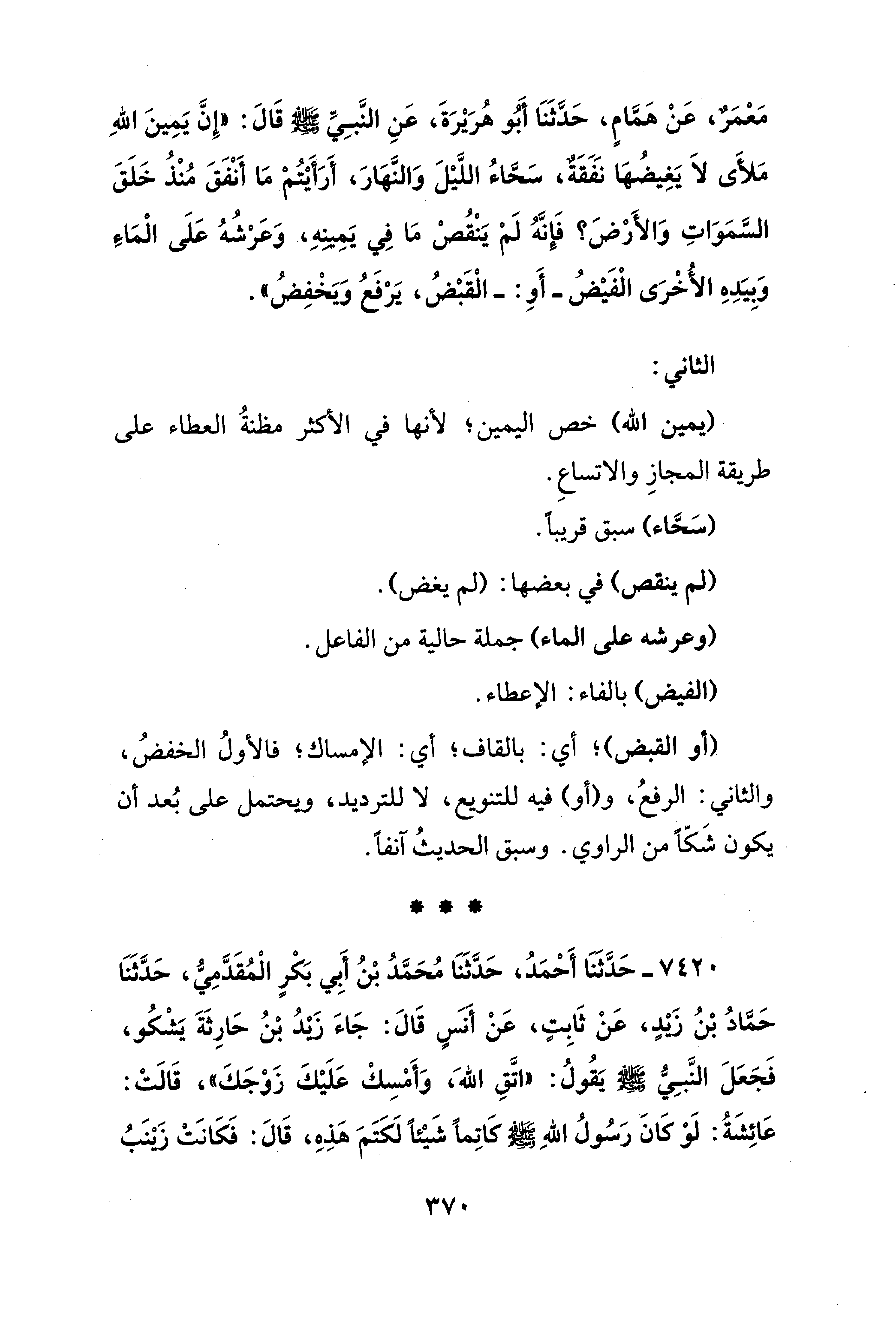 7420 - حَدَّثَنَا أَحْمَدُ، حَدَّثَنَا مُحَمَّدُ بْنُ أَبي بَكْرٍ الْمُقَدَّمِيُّ، حَدَّثَنَا حَمَّادُ بْنُ زَيْدٍ، عَنْ ثَابِتٍ، عَنْ أَنسٍ قَالَ: جَاءَ زيدُ بْنُ حَارِثَةَ يَشكُو، فَجَعَلَ النَّبِيُّ - صلى الله عليه وسلم - يَقُولُ: "اتَّقِ اللهَ، وَأَمْسِكْ عَلَيْكَ زَوْجَكَ"، قَالَتْ: عَائِشَةُ: لَوْ كَانَ رَسُولُ اللهِ - صلى الله عليه وسلم - كَاتِمًا شَيْئًا لَكَتَمَ هَذِهِ، قَالَ: فَكَانَتْ زينَبُ