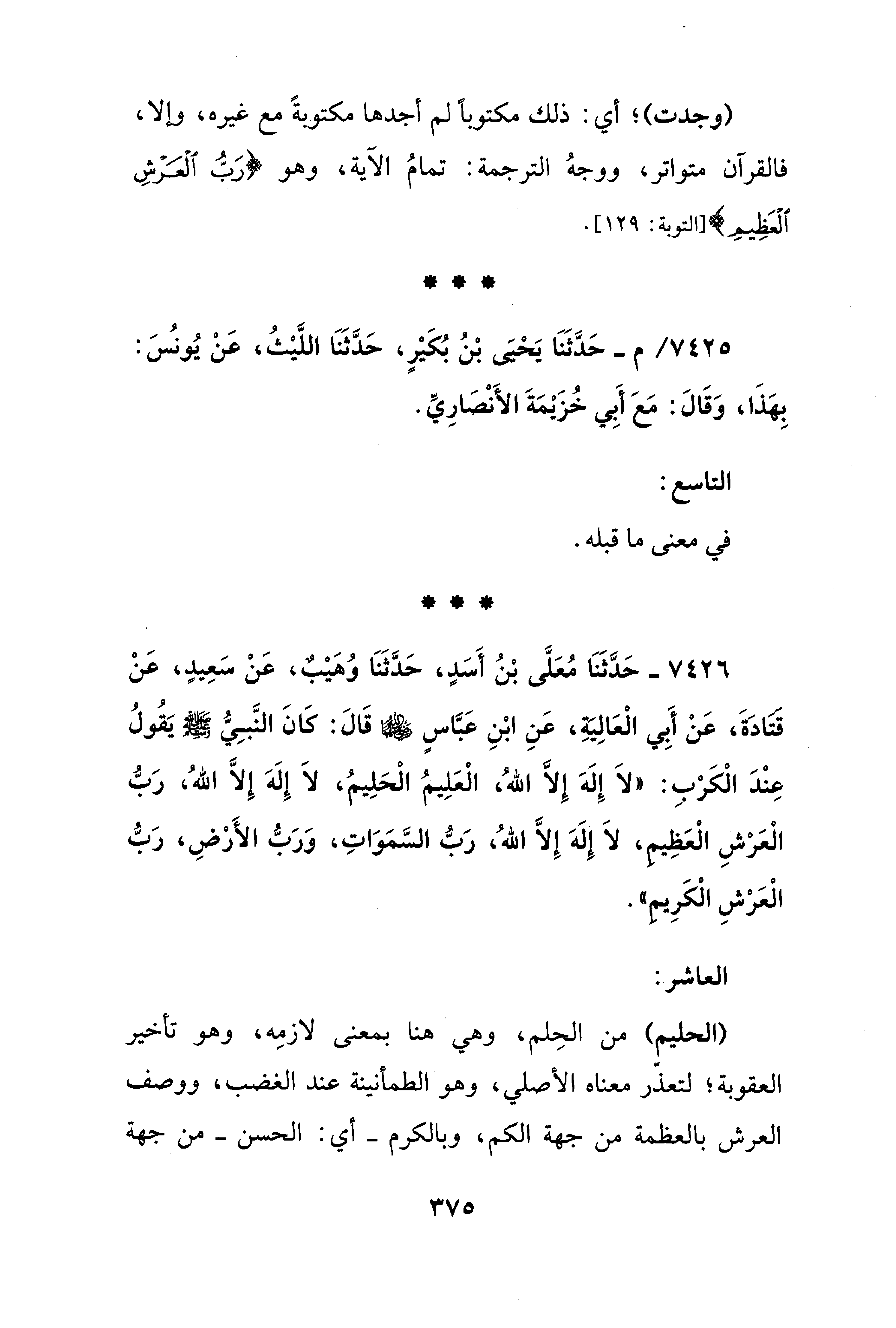 7426 - حَدَّثَنَا مُعَلَّى بْنُ أَسَدٍ، حَدَّثَنَا وُهَيْبٌ، عَنْ سَعِيدٍ، عَنْ قتادَةَ، عَنْ أَبِي الْعَالِيَةِ، عَنِ ابْنِ عَبَّاسٍ - رضي الله عنهما - قَالَ: كَانَ النَّبِيُّ - صلى الله عليه وسلم - يَقُولُ عِنْدَ الْكَرْبِ: "لَا إِلَهَ إِلَّا اللهُ، الْعَلِيمُ الْحَلِيمُ، لَا إِلَهَ إِلَّا اللهُ، رَبُّ الْعَرْشِ الْعَظِيم، لَا إِلَهَ إِلَّا اللهُ، رَبُّ السَّمَوَاتِ، وَرَبُّ الأَرْضِ، رَبُّ الْعَرْشِ الْكَرِيمِ".