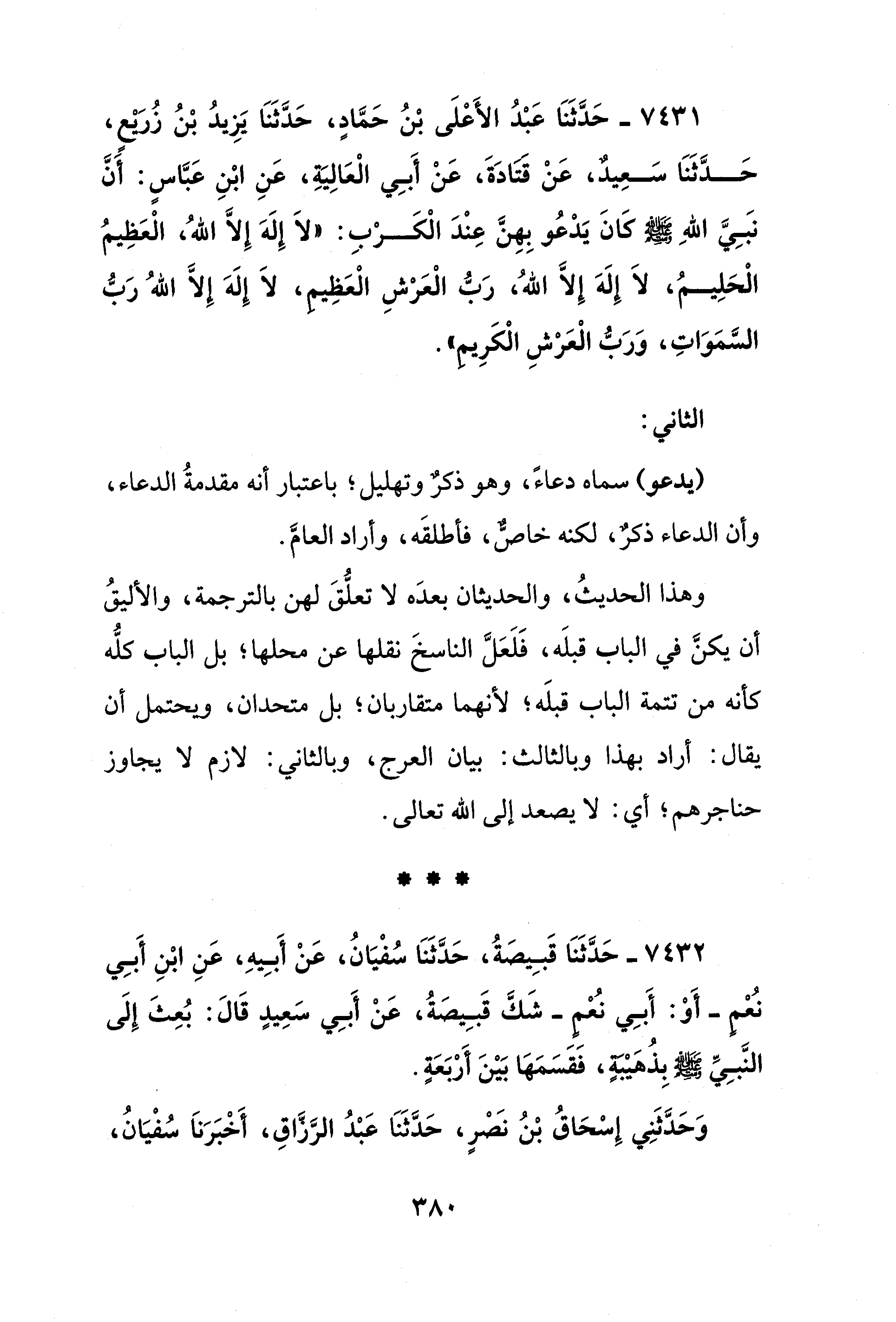 7431 - حَدَّثَنَا عَبْدُ الأَعْلَى بْنُ حَمَّادٍ، حَدَّثَنَا يَزِيدُ بْنُ زُريعٍ، حَدَّثَنَا سَعِيدٌ، عَنْ قتادَةَ، عَنْ أَبِي الْعَالِيَةِ، عَنِ ابْنِ عَبَّاسٍ: أَنَّ نبَيَّ اللهِ - صلى الله عليه وسلم - كَانَ يَدْعُو بِهِنَّ عِنْدَ الْكَرْبِ: "لَا إِلَهَ إِلَّا اللهُ، الْعَظِيمُ الْحَلِيمُ، لَا إِلَهَ إِلَّا اللهُ، رَبُّ الْعَرْشِ الْعَظِيم، لَا إِلَهَ إِلَّا اللهُ رَبُّ السَّمَوَاتِ، وَرَبُّ الْعَرْشِ الْكَرِيمِ".
