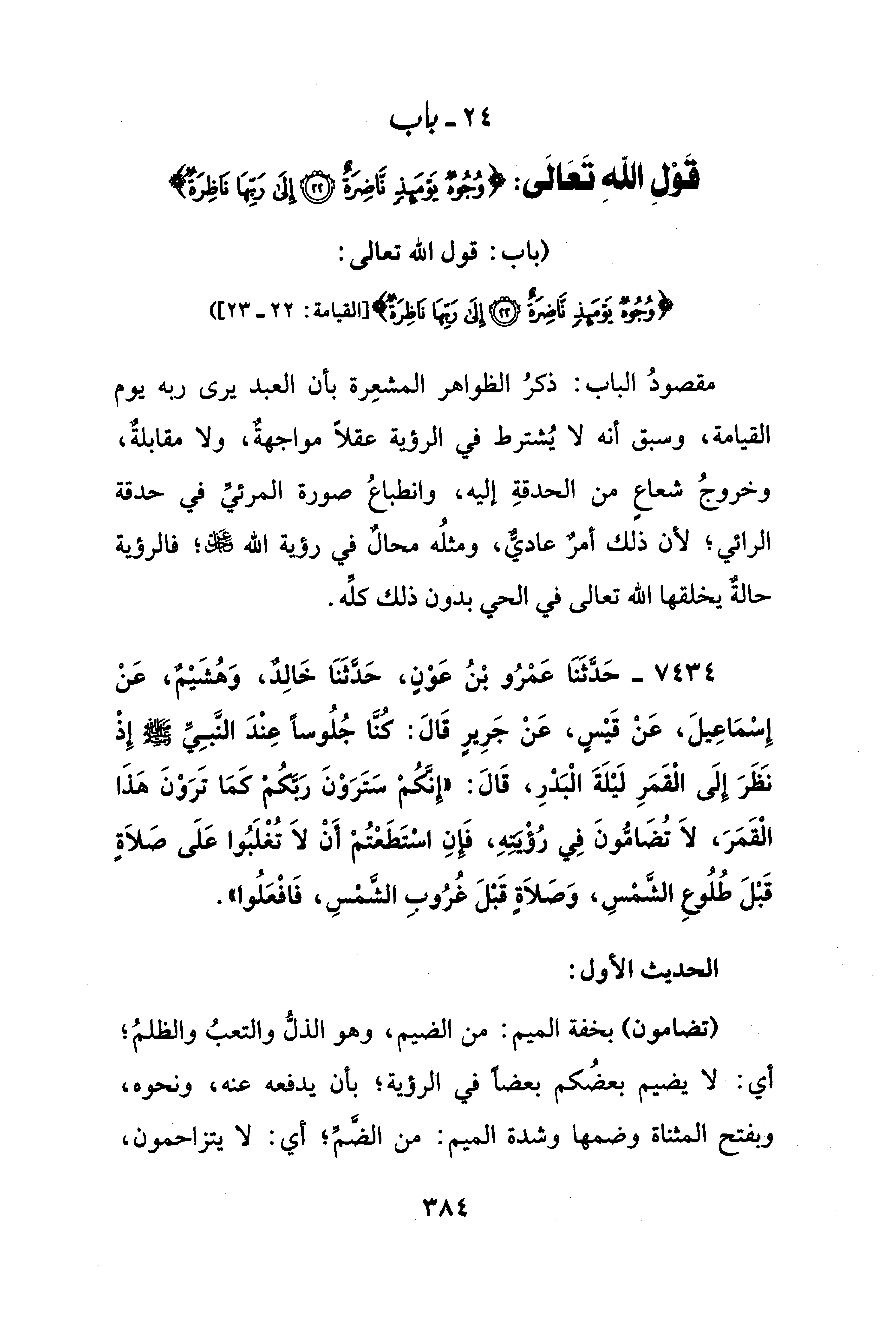 24 - باب قَوْلِ اللهِ تَعَالَى: {وُجُوهٌ يَوْمَئِذٍ نَاضِرَةٌ (22) إِلَى رَبِّهَا نَاظِرَةٌ}