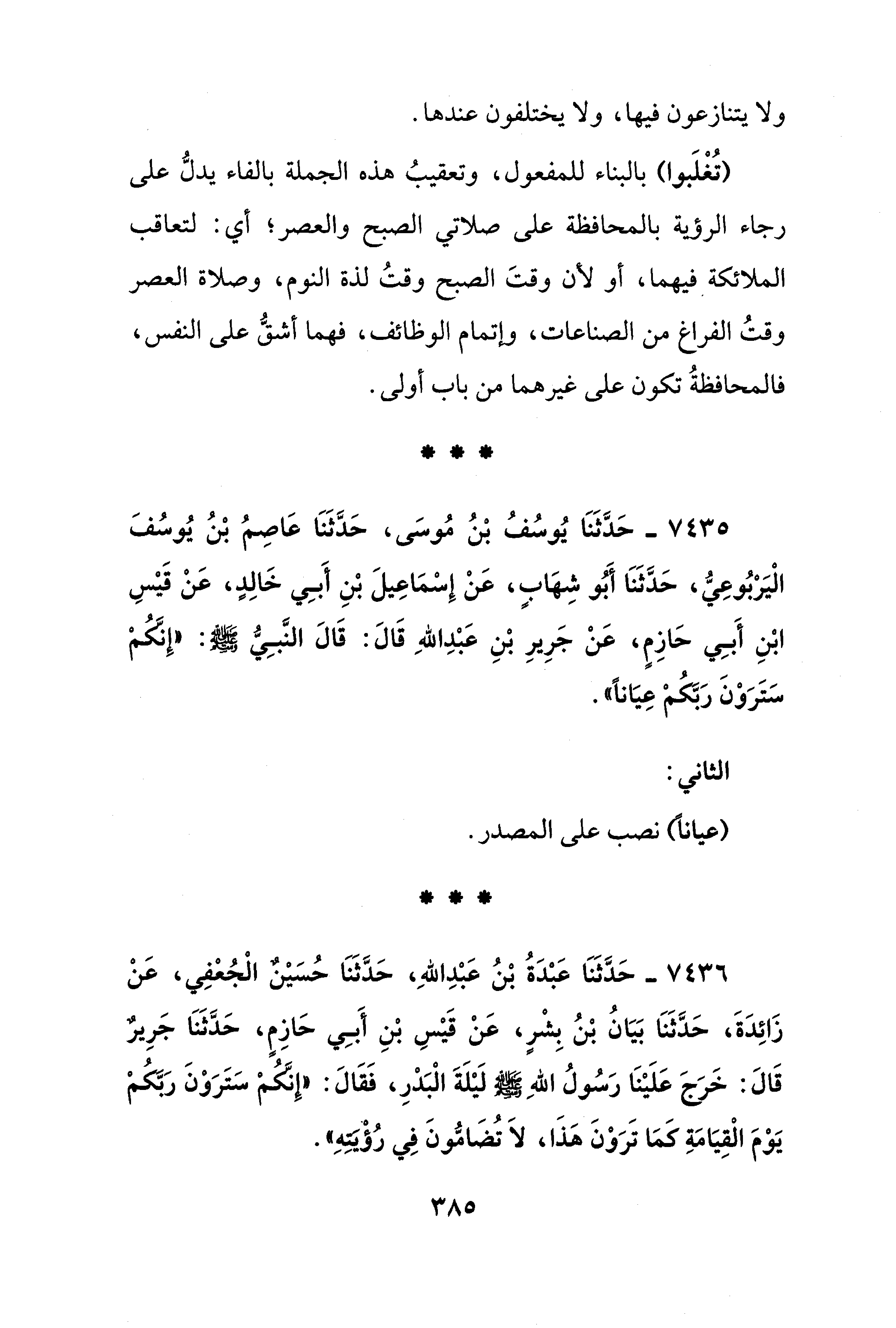 7435 - حَدَّثَنَا يُوسُفُ بْنُ مُوسَى، حَدَّثَنَا عَاصِمُ بْنُ يُوسُفَ الْيَرْبُوعِيُّ، حَدَّثَنَا أَبُو شِهَابٍ، عَنْ إِسْمَاعِيلَ بْنِ أَبِي خَالِدٍ، عَنْ قَيْسِ بْنِ أَبِي حَازِمٍ، عَنْ جَرِيرِ بْنِ عَبْدِ اللهِ قَالَ: قَالَ النَّبِيُّ - صلى الله عليه وسلم -: "إِنَّكُمْ سَتَرَوْنَ رَبَّكُمْ عِيَانًا".
