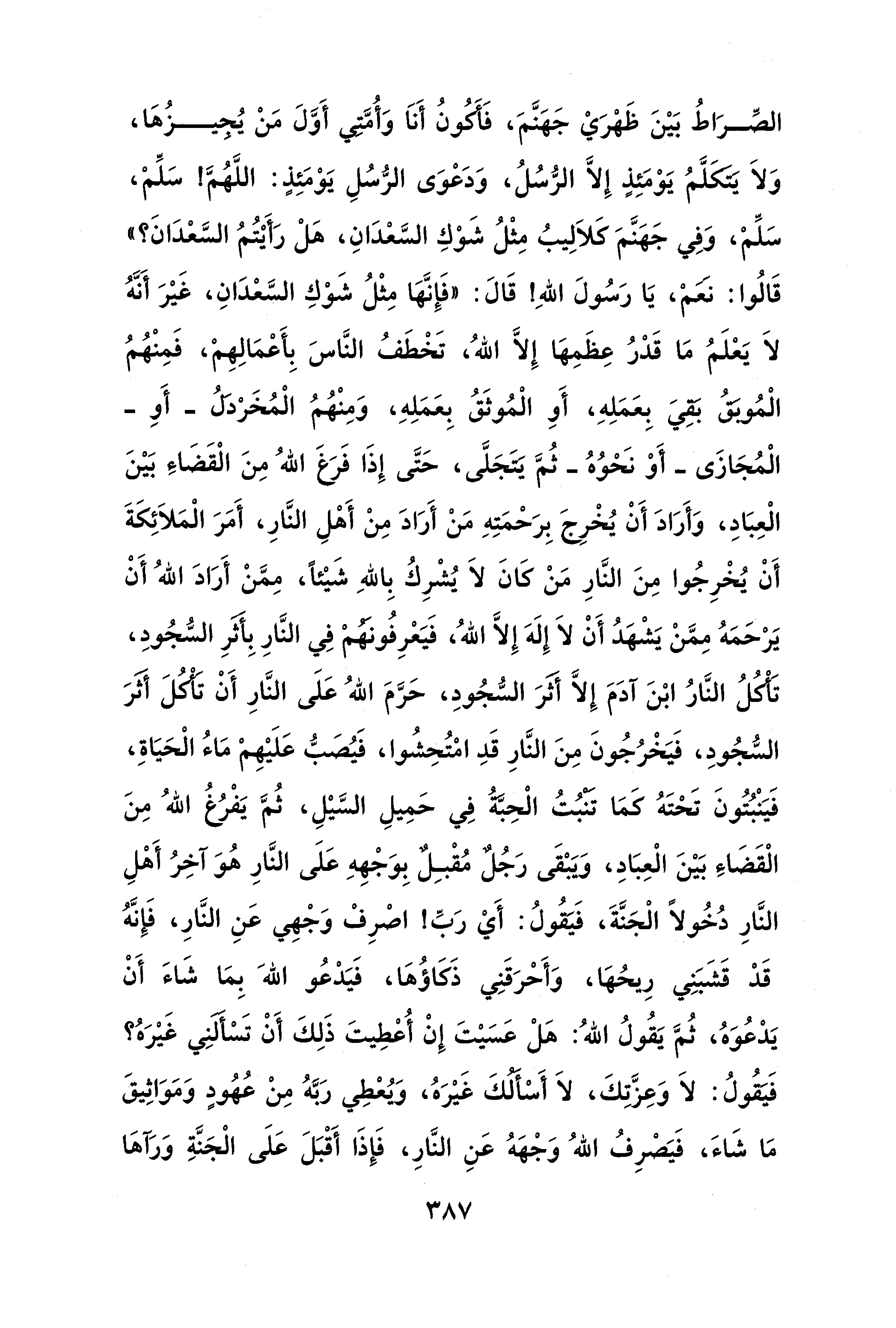 الصِّرَاطُ بَيْنَ ظَهْرَيْ جَهَنَّمَ، فَأَكُونُ أَنَا وَأُمَّتِي أَوَّلَ مَنْ يُجيزُهَا، وَلَا يَتَكَلَّمُ يَوْمَئِذٍ إِلَّا الرُّسُلُ، وَدَعْوَى الرّسُلِ يَوْمَئِذٍ: اللَّهُمَّ! سَلِّمْ، سَلِّمْ، وَفِي جَهَنَّمَ كَلاَلِيبُ مِثْلُ شَوْكِ السَّعْدَانِ، هَلْ رَأَيْتُمُ السَّعْدَانَ؟ " قَالُوا: نَعَمْ، يَا رَسُولَ اللهِ! قَالَ: "فَإِنَّهَا مِثْلُ شَوْكِ السَّعْدَانِ، غَيْرَ أَنَّهُ لَا يَعْلَمُ مَا قَدْرُ عِظَمِهَا إِلَّا اللهُ، تَخْطَفُ النَّاسَ بِأَعْمَالِهِمْ، فَمِنْهُمُ الْمُوبِقُ بَقِيَ بِعَمَلِهِ، أَوِ الْمُوثَقُ بِعَمَلِهِ، وَمِنْهُمُ الْمُخَرْدَلُ -أَوِ- الْمُجَازَى -أَوْ نَحْوُهُ- ثُمَّ يَتَجَلَّى، حَتَّى إِذَا فَرَغَ اللهُ مِنَ الْقَضَاءِ بَيْنَ الْعِبَادِ، وَأَرَادَ أَنْ يُخْرِجَ بِرَحْمَتِهِ مَنْ أَرَادَ مِنْ أَهْلِ النَّارِ، أَمَرَ الْمَلاَئِكَةَ أَنْ يُخْرِجُوا مِنَ النَّارِ مَنْ كَانَ لَا يُشْرِكُ بِاللهِ شَيْئًا، مِمَّنْ أَرَادَ اللهُ أَنْ يَرْحَمَهُ مِمَّنْ يَشْهَدُ أَنْ لَا إِلَهَ إِلَّا اللهُ، فَيَعْرِفُونَهُمْ فِي النَّارِ بِأَثَرِ السُّجُودِ، تَأْكُلُ النَّارُ ابْنَ آدَمَ إِلَّا أثَرَ السّجُودِ، حَرَّمَ اللهُ عَلَى النَّارِ أَنْ تَأْكُلَ أثَرَ السُّجُودِ، فَيَخْرُجُونَ مِنَ النَّارِ قَدِ امْتُحِشُوا، فَيُصَبُّ عَلَيْهِمْ مَاءُ الْحَيَاةِ، فَيَنْبُتُونَ تَحْتَهُ كَمَا تَنْبُتُ الْحِبَّةُ فِي حَمِيلِ السَّيْلِ، ثُمَّ يَفْرُغُ اللهُ مِنَ الْقَضَاءِ بَيْنَ الْعِبَادِ، وَيَبْقَى رَجُلٌ مُقْبِلٌ بِوَجْهِهِ عَلَى النَّارِ هُوَ آخِرُ أَهْلِ النَّارِ دُخُولًا الْجَنَّةَ، فَيقُولُ: أَيْ رَبِّ! اصْرِفْ وَجْهِي عَنِ النَّارِ، فَإِنَّهُ قَدْ قَشَبَنِي رِيحُهَا، وَأَحْرَقَنِي ذَكَاؤُهَا، فَيَدْعُو اللهَ بِمَا شَاءَ أَنْ يَدْعُوَهُ، ثُمَّ يَقُولُ اللهُ: هَلْ عَسَيْتَ إِنْ أُعْطِيتَ ذَلِكَ أَنْ تَسْأَلَنِي غَيْرَهُ؟ فَيقُولُ: لَا وَعِزَّتِكَ، لَا أَسْأَلُكَ غَيْرَهُ، وَيُعْطِي رَبَّهُ مِنْ عُهُودٍ وَمَوَاثِيقَ مَا شَاءَ، فَيَصْرِفُ اللهُ وَجْهَهُ عَنِ النَّارِ، فَإِذَا أَقْبَلَ عَلَى الْجَنَّةِ وَرَآهَا