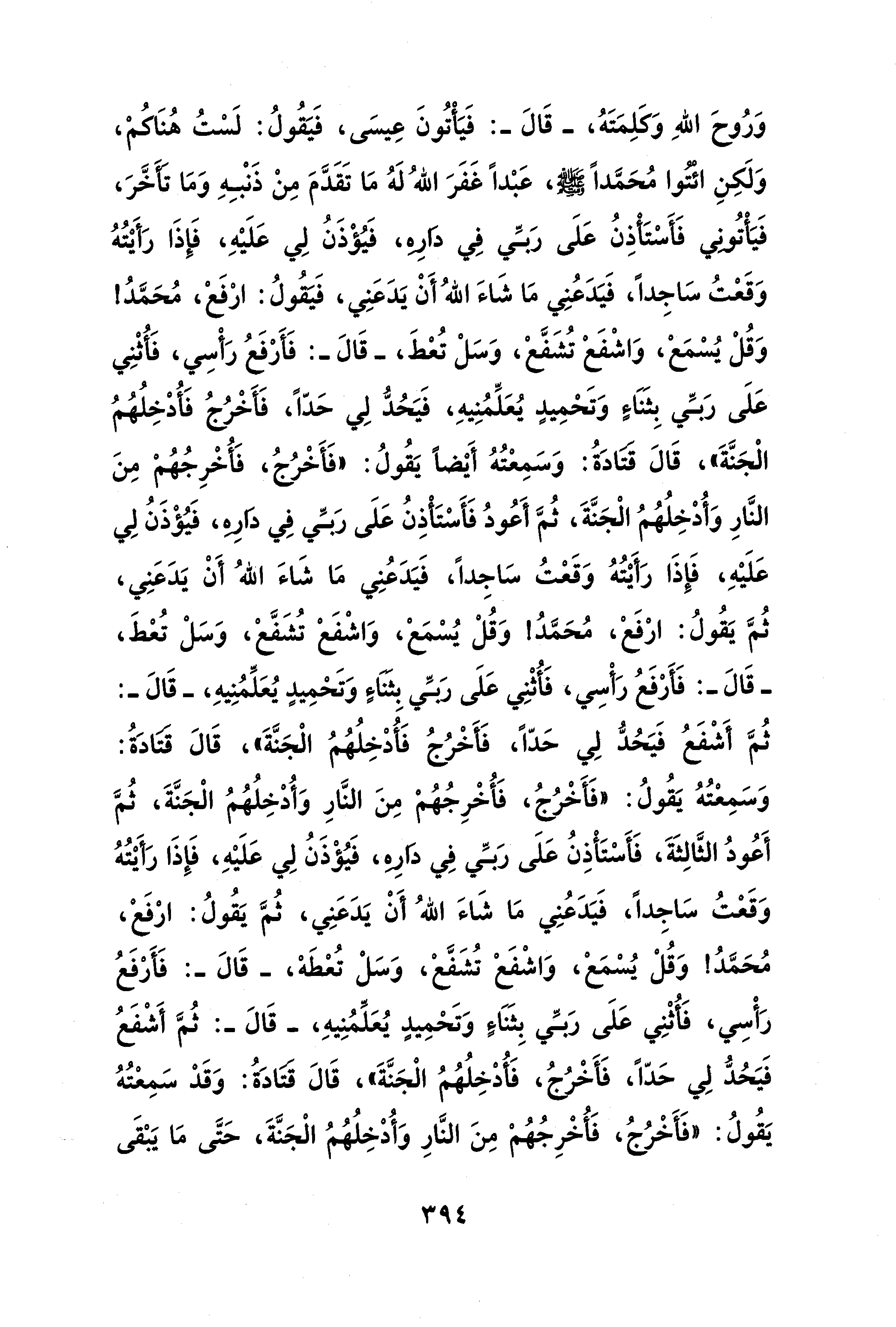 وَرُوحَ اللهِ وَكَلِمَتَهُ، -قَالَ-: فَيَأْتُونَ عِيسَى، فَيَقُولُ: لَسْتُ هُنَاكُمْ، وَلَكِنِ ائْتُوا مُحَمَّدًا - صلى الله عليه وسلم -، عَبْدًا غَفَرَ اللهُ لَهُ مَا تَقَدَّمَ مِنْ ذَنْبِهِ وَمَا تَأَخَّرَ، فَيَأْتُؤنِي فَأَسْتَأْذِنُ عَلَى رَبِّي فِي دارِهِ، فَيُؤْذَنُ لِي عَلَيْهِ، فَإِذَا رَأَيْتُهُ وَقَعْتُ سَاجِدًا، فَيَدَعُنِي مَا شَاءَ اللهُ أَنْ يَدَعَنِي، فَيَقُولُ: ارْفَعْ، مُحَمَّد! وَقُلْ يُسْمَعْ، وَاشْفَعْ تُشَفَّعْ، وَسَلْ تُعْطَ، -قَالَ-: فَأَرْفَعُ رَأْسِي، فَأُثْنِي عَلَى رَبِّي بِثَنَاءٍ وَتَحْمِيدٍ يُعَلِّمُنِيهِ، فَيَحُدُّ لِي حَدًّا، فَأَخْرُجُ فَأُدْخِلُهُمُ الْجَنَّةَ"، قَالَ قَتَادَةُ: وَسَمِعْتُهُ أَيْضًا يَقُولُ: "فَأَخْرُجُ، فَأُخْرِجُهُمْ مِنَ النَّارِ وَأُدْخِلُهُمُ الْجَنَّةَ، ثُمَّ أَعُودُ فَأَسْتَأْذِنُ عَلَى رَبِّي فِي دَارِهِ، فَيُؤْذَنُ لِي عَلَيْهِ، فَإِذَا رَأَيْتُهُ وَقَعْتُ سَاجِدًا، فَيَدَعُنِي مَا شَاءَ اللهُ أَنْ يَدَعَنِي، ثُمَّ يَقُولُ: ارْفَعْ، مُحَمَّدُ! وَقُلْ يُسْمَعْ، وَاشْفَعْ تُشَفَّعْ، وَسَلْ تُعْطَ، -قَالَ-: فَأَرْفَعُ رَأْسِي، فَأُثْنِي عَلَى رَبِّي بِثَنَاءٍ وَتَحْمِيدٍ يُعَلّمُنِيهِ، -قَالَ-: ثُمَّ أَشْفَعُ فَيَحُدُّ لِي حَدًّا، فَأَخْرُجُ فَأُدْخِلُهُمُ الْجَنَّةَ"، قَالَ قتادَةُ: وَسَمِعْتُهُ يَقُولُ: "فَأَخْرُجُ، فَأُخرِجُهُمْ مِنَ النَّارِ وَأُدْخِلُهُمُ الْجَنَّةَ، ثُمَّ أَعُودُ الثَّالِثَةَ، فَأَسْتَأْذِنُ عَلَى رَبِّي فِي دَارِهِ، فَيُؤْذَنُ لِي عَلَيْهِ، فَإِذَا رَأَيْتُهُ وَقَعْتُ سَاجِدًا، فَيَدَعُنِي مَا شَاءَ اللهُ أَنْ يَدَعَنِي، ثُمَّ يَقُولُ: ارْفَعْ، مُحَمَّدُ! وَقُلْ يُسْمَعْ، وَاشْفَعْ تُشَفَّعْ، وَسَلْ تُعْطَهْ، -قَالَ-: فَأَرْفَعُ رَأْسِي، فَأُثْنِي عَلَى رَبِّي بِثَنَاءٍ وَتَحْمِيدٍ يُعَلِّمُنِيهِ، -قَالَ-: ثُمَّ أَشْفَعُ فَيَحُدُّ لِي حَدًّا، فَأَخْرُجُ، فَأُدْخِلُهُمُ الْجَنَّةَ"، قَالَ قَتَادَةُ: وَقَدْ سَمِعْتُهُ يَقُولُ: "فَأَخْرُجُ، فَأُخْرِجُهُمْ مِنَ النَّارِ وَأُدْخِلُهُمُ الْجَنَّةَ، حَتَّى مَا يَبْقَى