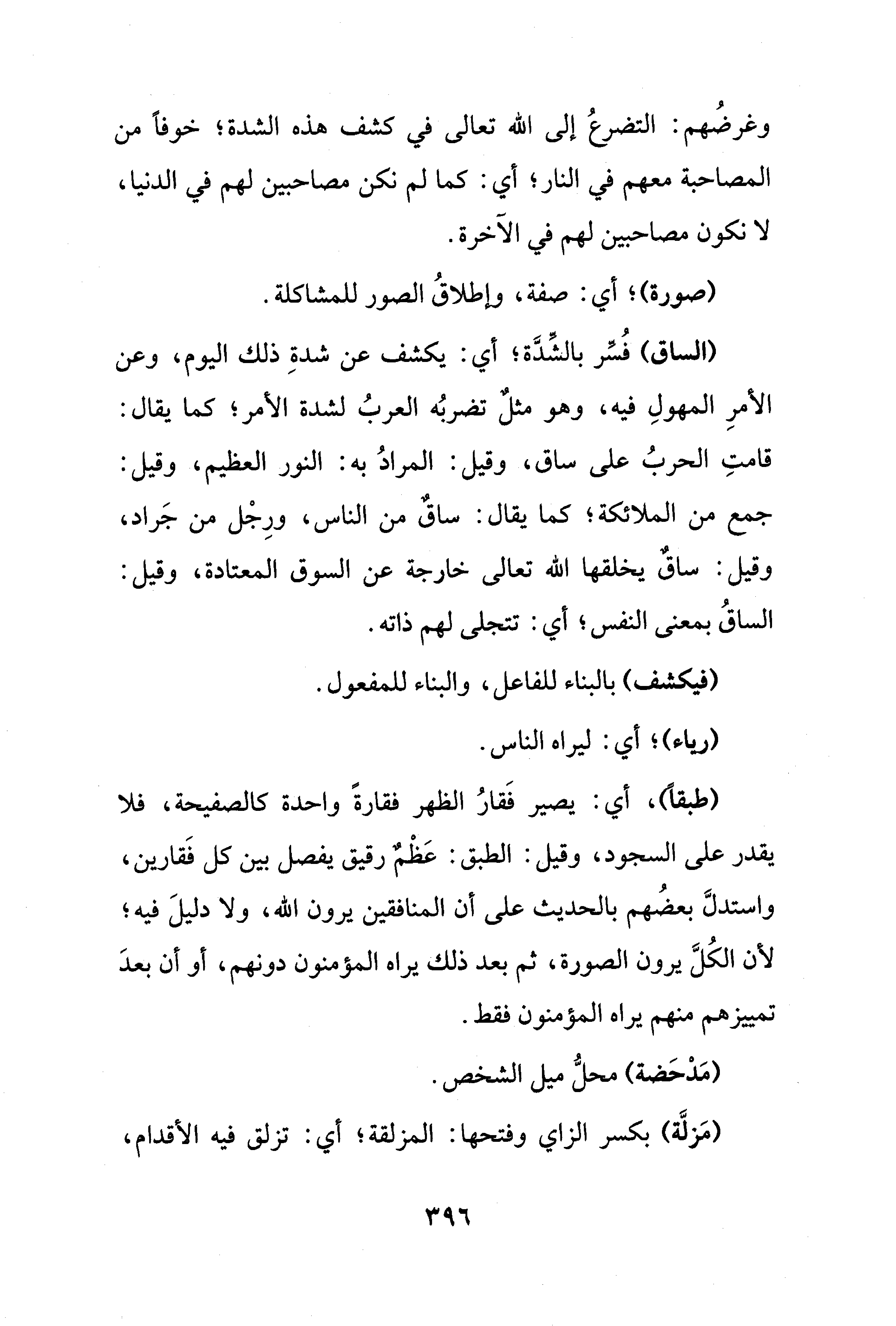 (الساق) فُسِّر بالشِّدَّة؛ أي: يكشف عن شدةِ ذلك اليوم، وعن الأمرِ المهولِ فيه، وهو مثلٌ تضربُه العربُ لشدة الأمر؛ كما يقال: قامتِ الحربُ على ساق، وقيل: المرادُ به: النور العظيم، وقيل: جمع من الملائكة؛ كما يقال: ساقٌ من الناس، ورِجْل من جَراد، وقيل: ساقٌ يخلقها الله تعالى خارجة عن السوق المعتادة، وقيل: الساقُ بمعنى النفس؛ أي: تتجلى لهم ذاته.