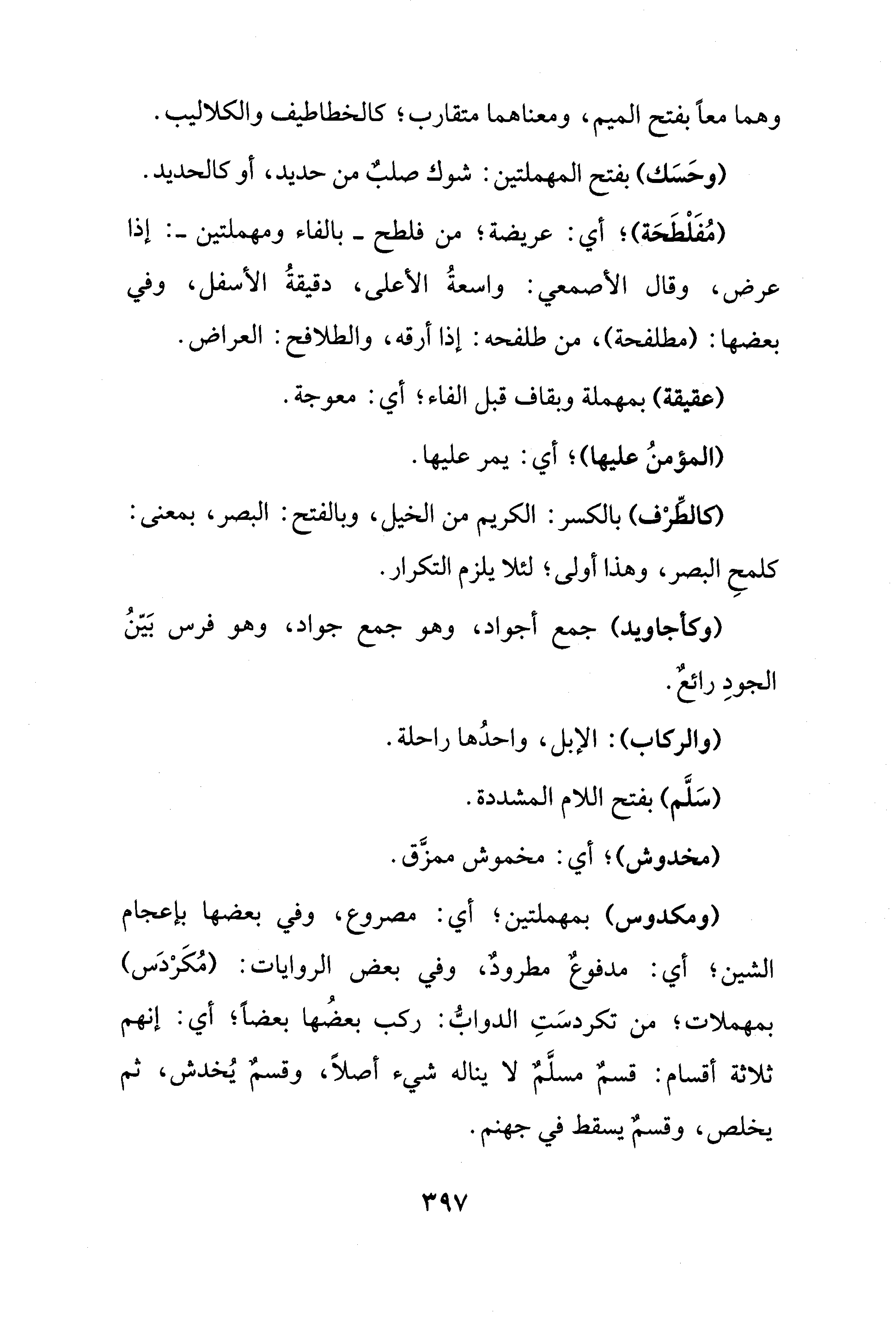 (ومكدوس) بمهملتين؛ أي: مصروع، وفي بعضها بإعجام الشين؛ أي: مدفوعٌ مطرودٌ، وفي بعض الروايات: (مُكَرْدَس) بمهملات؛ من تكردسَتِ الدوابُّ: ركب بعضُها بعضًا؛ أي: إنهم ثلاثة أقسام: قسمٌ مسلَّمٌ لا يناله شيء أصلًا، وقسمٌ يُخدش، ثم يخلص، وقسمٌ يسقط في جهنم.