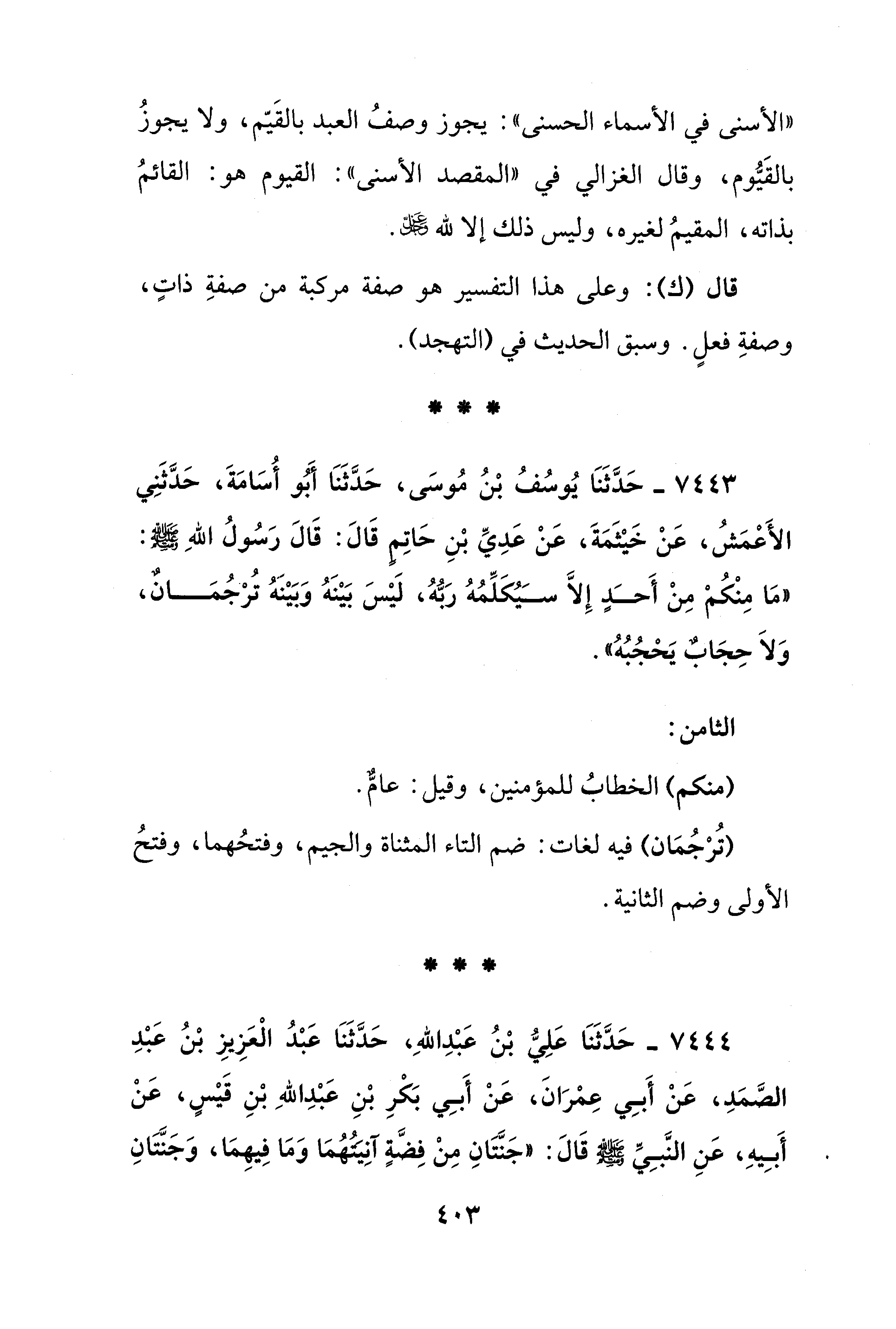 7443 - حَدَّثَنَا يُوسُفُ بْنُ مُوسَى، حَدَّثَنَا أَبُو أُسَامَةَ، حَدَّثَنِي الأَعْمَشُ، عَنْ خَيْثَمَةَ، عَنْ عَدِيِّ بْنِ حَاتِم قَالَ: قَالَ رَسُولُ اللهِ - صلى الله عليه وسلم -: "مَا مِنْكُمْ مِنْ أَحَدٍ إِلَّا سَيُكَلِّمُهُ رَبُّهُ، لَيْسَ بَيْنَهُ وَبَيْنَهُ تُرْجُمَان، وَلَا حِجَابٌ يَحْجُبُهُ".