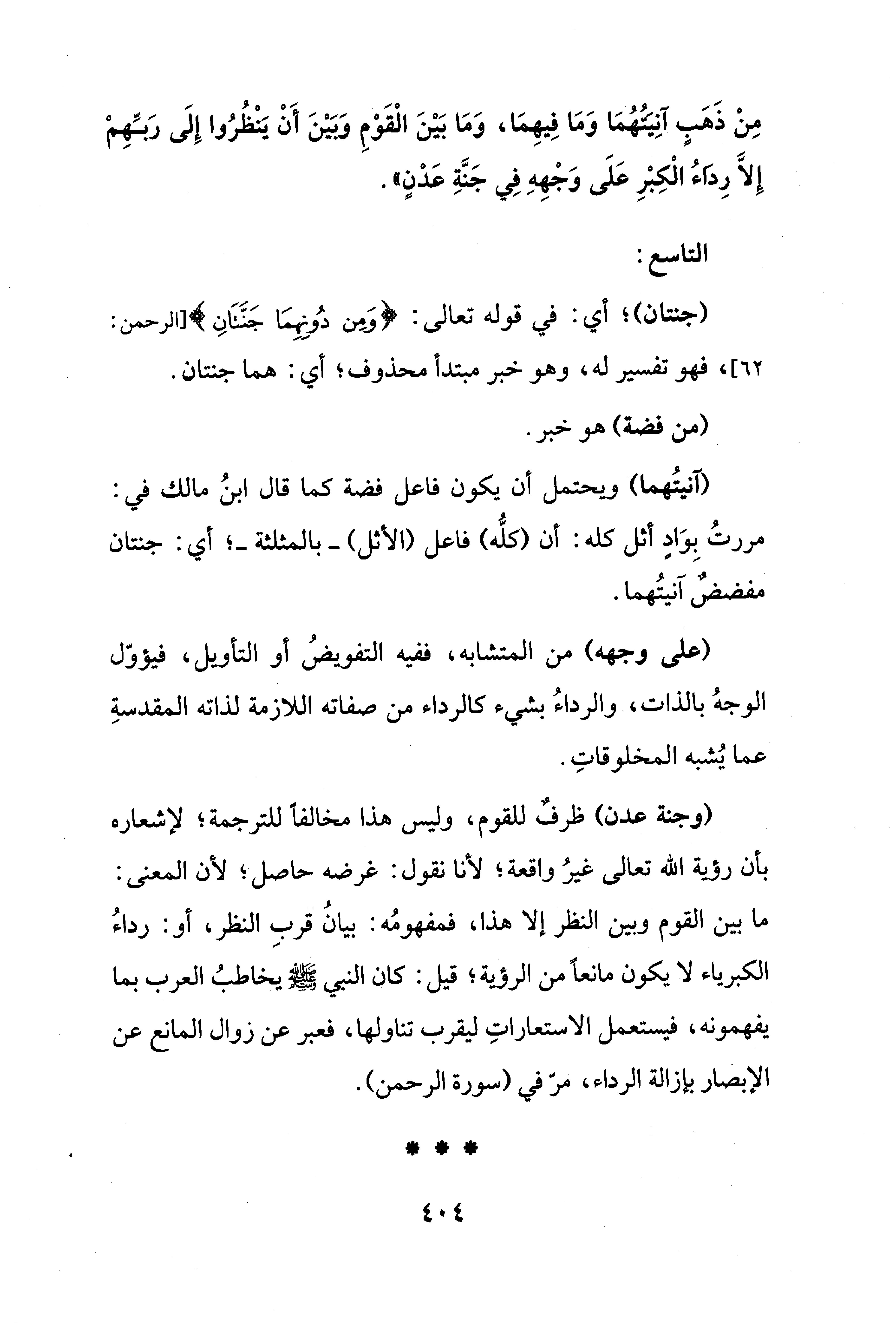 (وجنة عدن) ظرفٌ للقوم، وليس هذا مخالفًا للترجمة؛ لإشعاره بأن رؤية الله تعالى غيرُ واقعة؛ لأنا نقول: غرضه حاصل؛ لأن المعنى: ما بين القوم وبين النظر إلا هذا، فمفهومُه: بيانُ قربِ النظر، أو: رداءُ الكبرياء لا يكون مانعًا من الرؤية؛ قيل: كان النبي - صلى الله عليه وسلم - يخاطبُ العرب بما يفهمونه، فيستعمل الاستعاراتِ ليقرب تناولها، فعبر عن زوال المانع عن الإبصار بإزالة الرداء، مرّ في (سورة الرحمن).