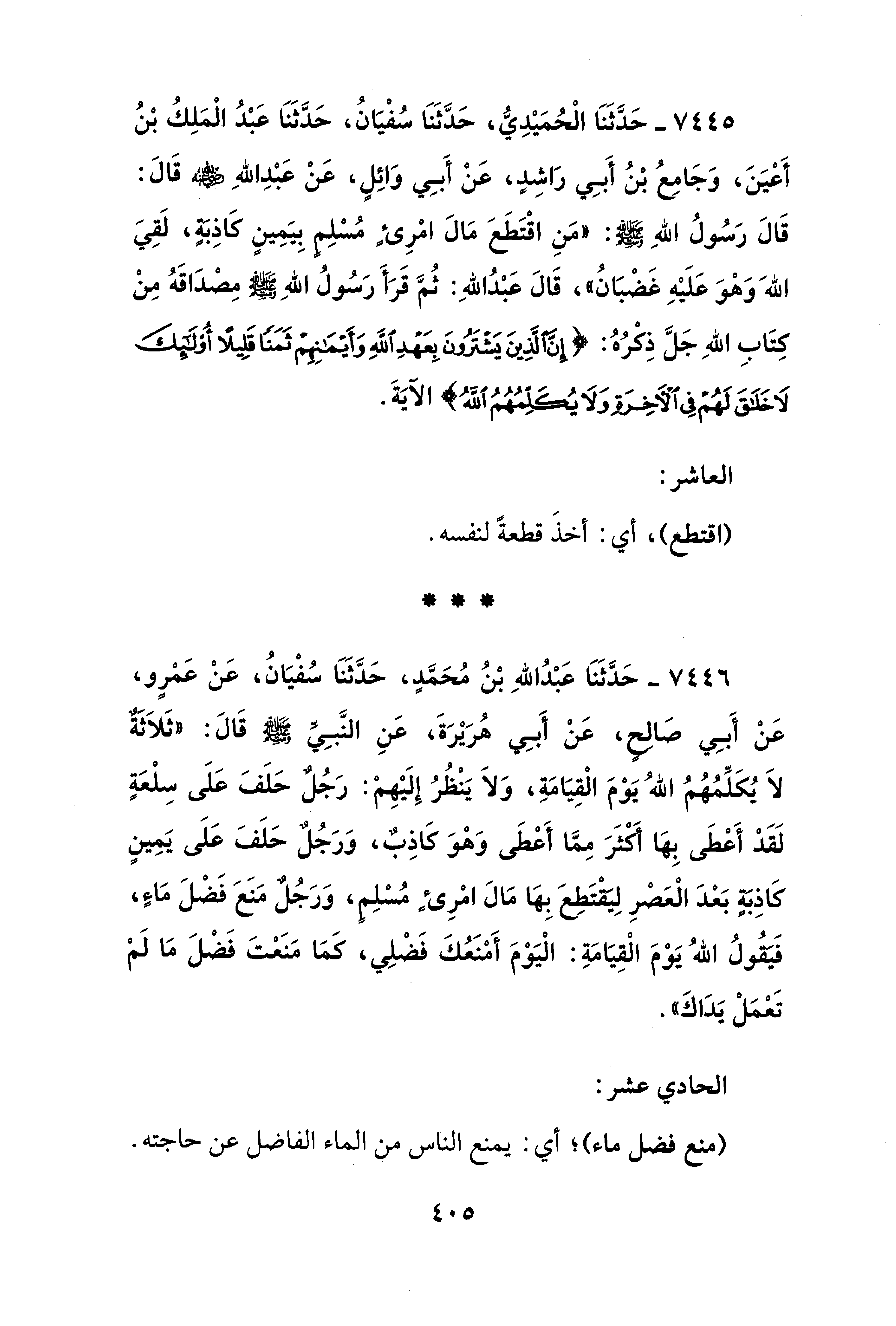 7445 - حَدَّثَنَا الْحُمَيْدِيُّ، حَدَّثَنَا سُفْيَانُ، حَدَّثَنَا عَبْدُ الْمَلِكُ بْنُ أَعْيَنَ، وَجَامِعُ بْنُ أَبِي رَاشِدٍ، عَنْ أَبِي وَائِلٍ، عَنْ عَبْدِ اللهِ - رضي الله عنه - قَالَ: قَالَ رَسُولُ اللهِ - صلى الله عليه وسلم -: "مَنِ اقْتَطَعَ مَالَ امْرِئٍ مُسْلِمٍ بِيَمِينٍ كَاذِبَةٍ، لَقِيَ اللهَ وَهْوَ عَلَيْهِ غَضْبَانُ"، قَالَ عَبْدُ اللهِ: ثُمَّ قَرَأَ رَسُولُ اللهِ - صلى الله عليه وسلم - مِصْدَاقَهُ مِنْ كِتَابِ اللهِ جَلَّ ذِكْرُهُ: {إِنَّ الَّذِينَ يَشْتَرُونَ بِعَهْدِ اللَّهِ وَأَيْمَانِهِمْ ثَمَنًا قَلِيلًا أُولَئِكَ لَا خَلَاقَ لَهُمْ فِي الْآخِرَةِ وَلَا يُكَلِّمُهُمُ اللَّهُ} الآيَةَ.