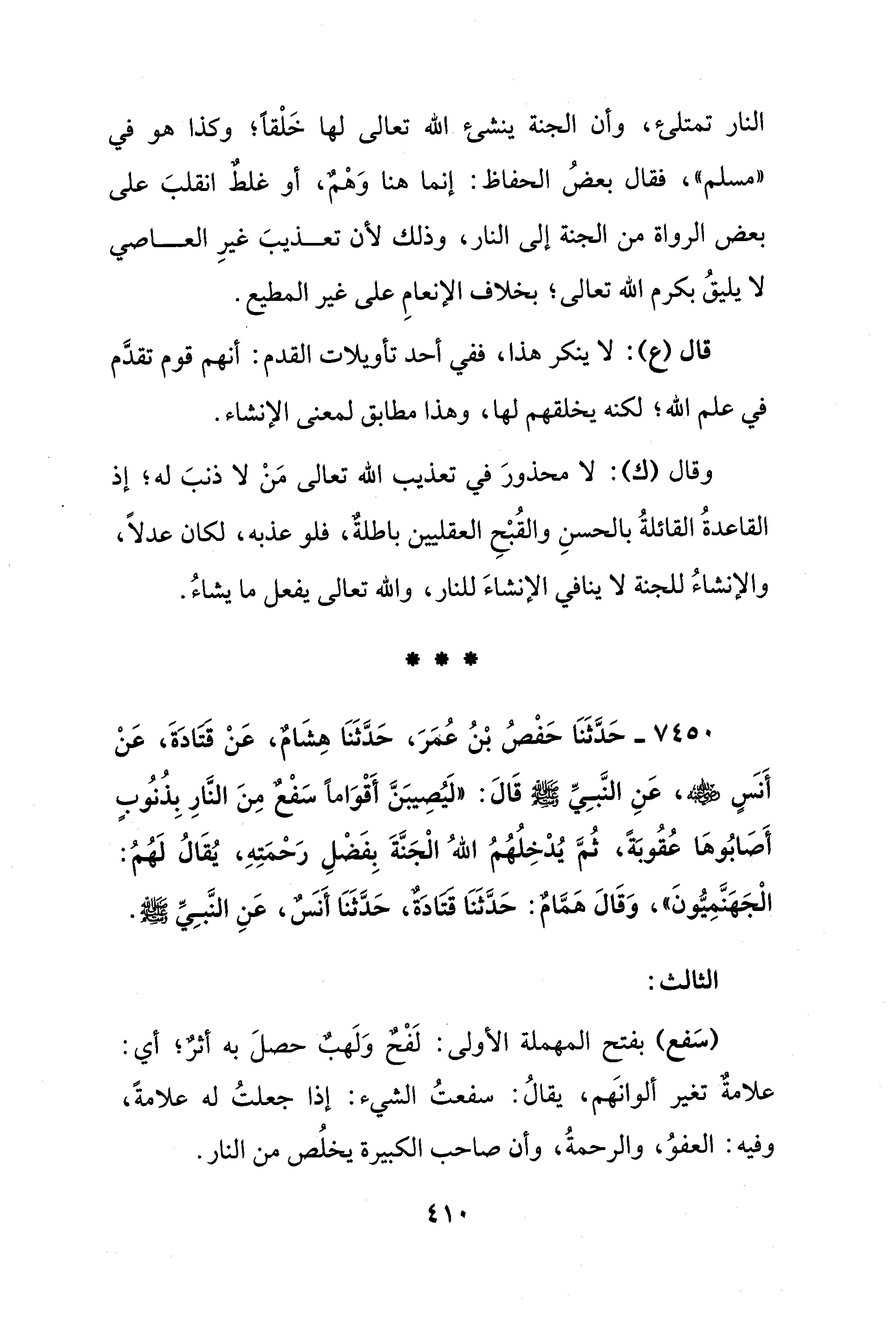 7450 - حَدَّثَنَا حَفْصُ بْنُ عُمَرَ، حَدَّثَنَا هِشَامٌ، عَنْ قتادَةَ، عَنْ أَنس - رضي الله عنه -، عَنِ النَّبِيِّ - صلى الله عليه وسلم - قَالَ: "لَيُصِيبَنَّ أَقْوَامًا سَفْعٌ مِنَ النَّارِ بِذُنُوبٍ أَصَابُوهَا عُقُوبَةً، ثُمَّ يُدْخِلُهُمُ اللهُ الْجَنَّةَ بِفَضْلِ رَحْمَتِهِ، يُقَالُ لَهُمُ: الْجَهَنَّمِيُّونَ"، وَقَالَ هَمَّامٌ: حَدَّثَنَا قتادَةٌ، حَدَّثَنَا أَنَسٌ، عَنِ النَّبِيِّ - صلى الله عليه وسلم -.