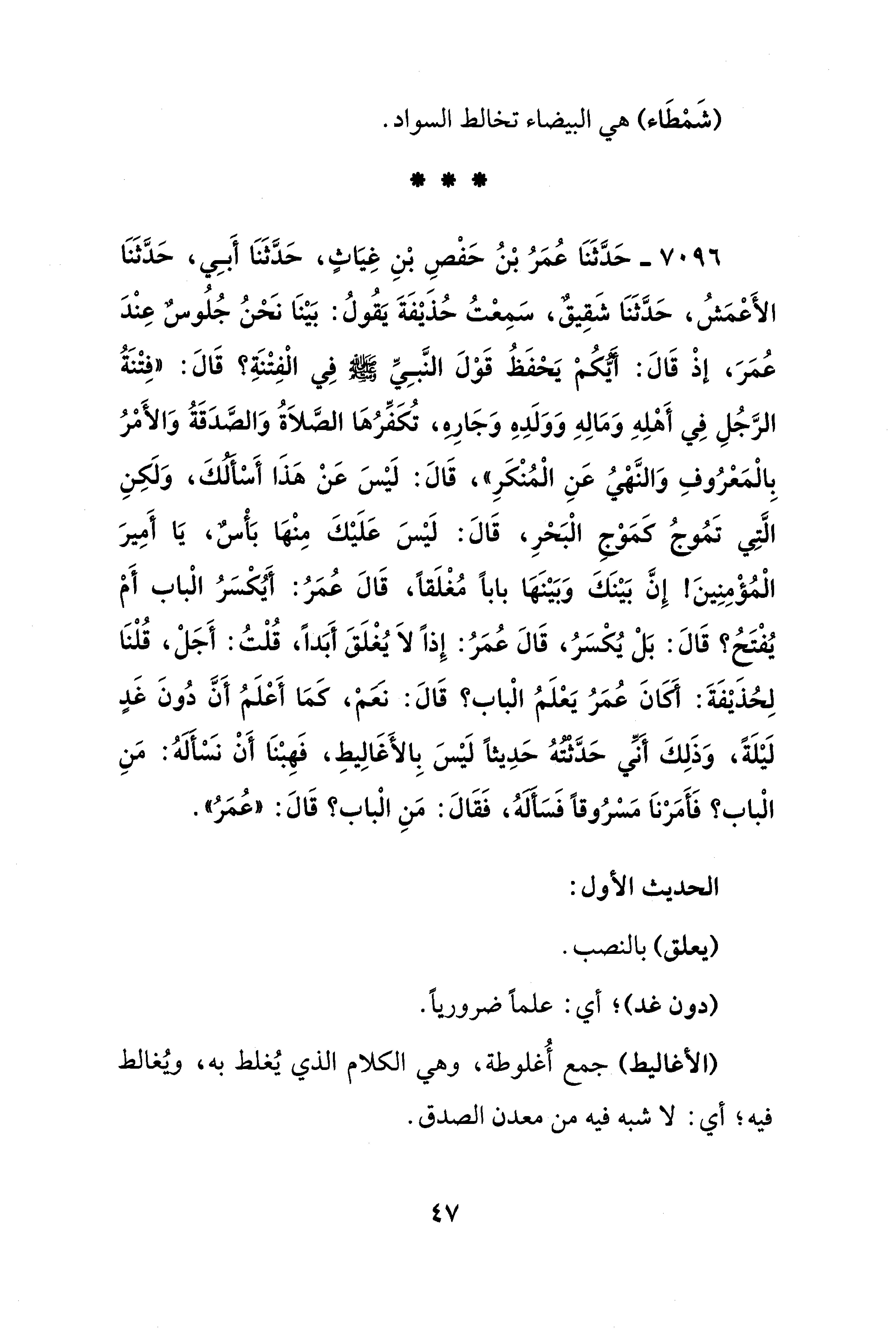 7096 - حَدَّثَنَا عُمَرُ بْنُ حَفْصِ بْنِ غِيَاثٍ، حَدَّثَنَا أَبِي، حَدَّثَنَا الأَعْمَشُ، حَدَّثَنَا شَقِيقٌ، سَمِعْتُ حُذَيْفَةَ يَقُولُ: بَيْنَا نَحْنُ جُلُوسٌ عِنْدَ عُمَرَ، إذْ قَالَ: أيُّكُمْ يَحْفَظُ قَوْلَ النَّبِيِّ - صلى الله عليه وسلم - فِي الْفِتْنَةِ؟ قَالَ: "فِتْنَةُ الرَّجُلِ فِي أَهْلِهِ وَمَالِهِ وَوَلَدِهِ وَجَارِه، تُكَفِّرُهَا الصَّلاَةُ وَالصَّدَقَةُ وَالأَمْرُ بِالْمَعْرُوفِ وَالنَّهْيُ عَنِ الْمُنْكَرِ"، قَالَ: لَيْسَ عَنْ هَذَا أَسْألكَ، وَلَكِنِ الَّتِي تَمُوجُ كَمَوْجِ الْبَحْرِ، قَالَ: لَيْسَ عَلَيْكَ مِنْهَا بَأسٌ، يَا أَمِيرَ الْمُؤْمِنِينَ إِنَّ بَيْنَكَ وَبَيْنَهَا بابًا مُغْلَقًا، قَالَ عُمَرُ: أَيُكْسَرُ الْباب أَمْ يُفْتَحُ؟ قَالَ: بَلْ يُكْسَرُ، قَالَ عُمَرُ: إِذا لَا يُغْلَقَ أَبَدًا، قُلْتُ: أَجَلْ، قُلْنَا لِحُذَيْفَةَ: كًانَ عُمَرُ يَعْلَمُ الْباب؟ قَالَ: نعمْ، كَمَا أَعْلَمُ أَنَّ دُونَ غَد لَيْلَةً، وَذَلِكَ أَنِّي حَدَّثْتُهُ حَدِيثًا لَيْسَ بِالأَغَالِيطِ، فَهِبْنَا أَنْ نسألهُ: مَنِ الْباب؟ فَأَمَرْنَا مَسْرُوقًا فَسَألهُ، فَقَالَ: مَنِ الْباب؟ قَالَ: "عُمَرُ".