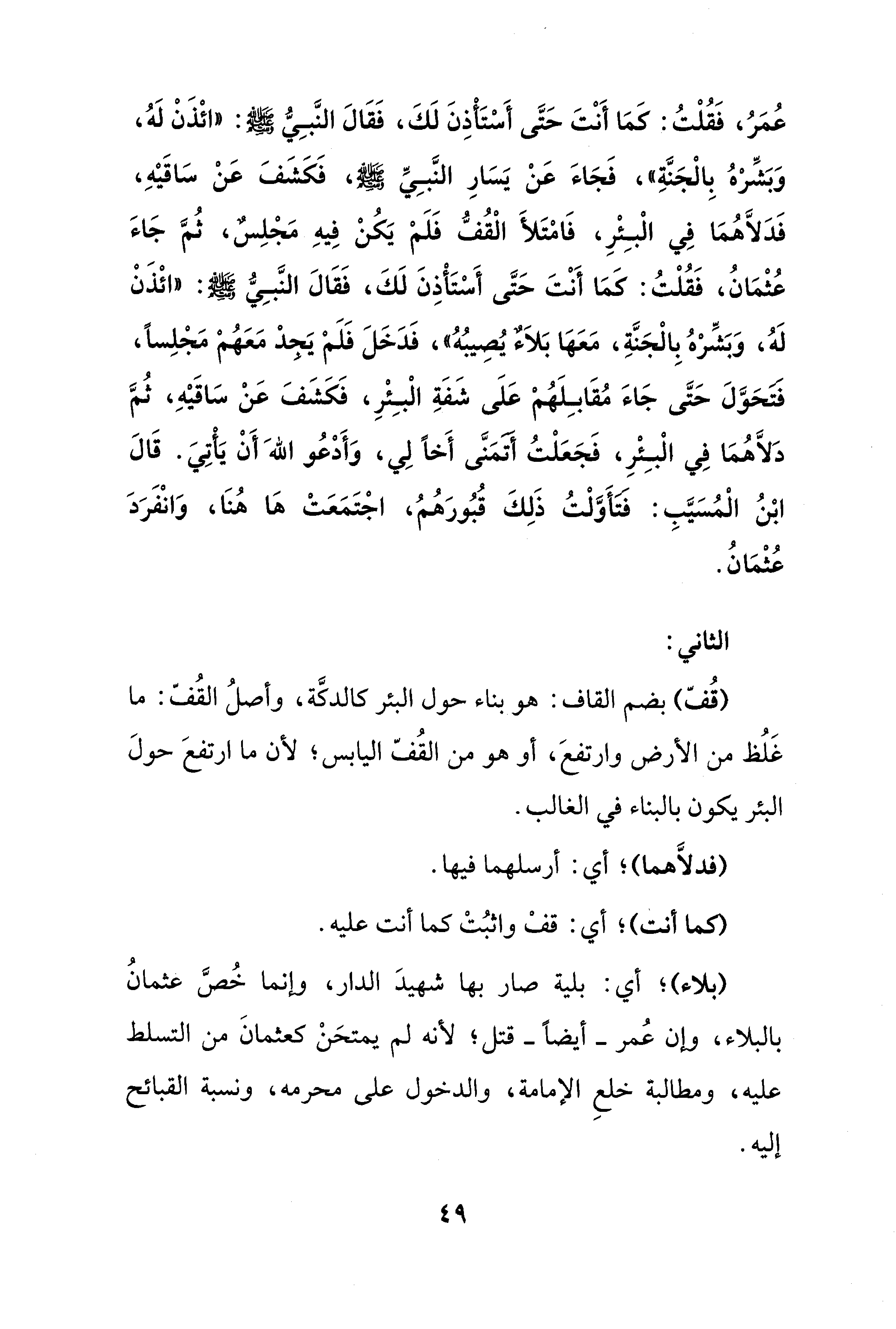 عُمَرُ، فَقُلْتُ: كَمَا أَنْتَ حَتَّى أَسْتَأْذِنَ لَكَ، فَقَالَ النَّبِيُّ - صلى الله عليه وسلم -: "ائْذَنْ لَهُ، وَبَشِّرْهُ بِالْجَنَّةِ"، فَجَاءَ عَنْ يَسَارِ النَّبِيِّ - صلى الله عليه وسلم -، فَكَشَفَ عَنْ سَاقَيْهِ، فَدَلَّاهُمَا فِي الْبِئْرِ، فَامْتَلأَ الْقُفُّ فَلَمْ يَكُنْ فِيهِ مَجْلِسٌ، ثُمَّ جَاءَ عُثْمَانُ، فَقُلْتُ: كَمَا أَنْتَ حَتَّى أَسْتَأْذِنَ لَكَ، فَقَالَ النَّبِيُّ - صلى الله عليه وسلم -: "ائْذَنْ لَهُ، وَبَشِّرْهُ بِالْجَنَّةِ، مَعَهَا بَلاَءٌ يُصِيبُهُ"، فَدَخَلَ فَلَمْ يَجدْ مَعَهُمْ مَجْلِسًا، فتحَوَّلَ حَتَّى جَاءَ مُقَابِلَهُمْ عَلَى شَفَةِ الْبِئْرِ، فَكَشَفَ عَنْ سَاقَيْهِ، ثُمَّ دَلَّاهُمَا فِي الْبِئْرِ، فَجَعَلْتُ أتمَنَّى أَخًا لِي، وَأَدْعُو اللهَ أَنْ يَأتِيَ. قَالَ ابْنُ الْمُسَيَّبِ: فتأوَّلْتُ ذَلِكَ قُبُورَهُمُ، اجْتَمَعَتْ هَا هُنَا، وَانْفَرَدَ عُثْمَانُ.