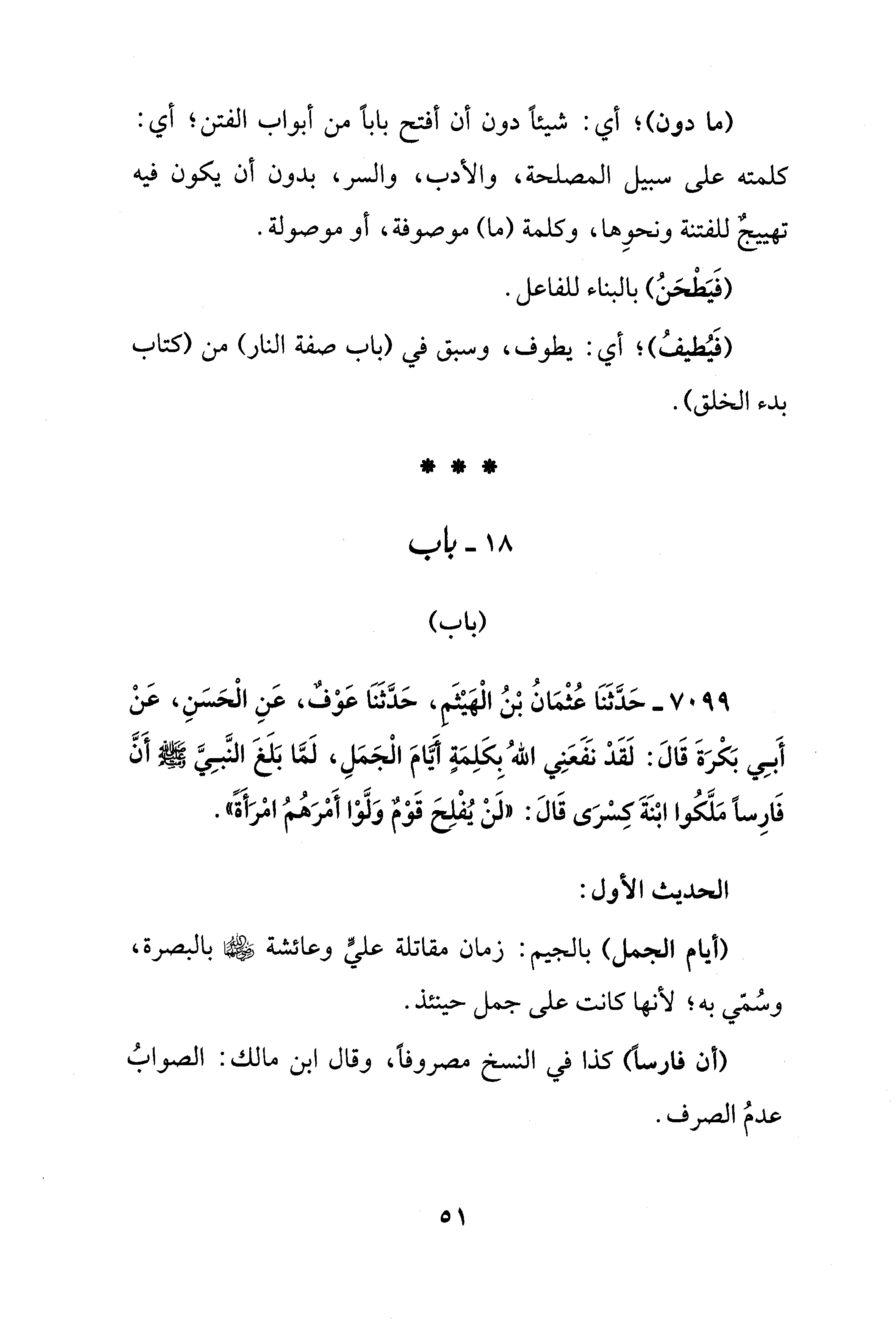 7099 - حَدَّثَنَا عُثْمَانُ بْنُ الْهَيْثَم، حَدَّثَنَا عَوْف، عَنِ الْحَسَنِ، عَنْ أَبِي بَكْرَةَ قَالَ: لَقَدْ نَفَعَنِي اللهُ بِكَلِمَةٍ أيامَ الْجَمَلِ، لَمَّا بَلَغَ النَّبِيَّ - صلى الله عليه وسلم - أَنَّ فَارِسًا مَلَّكُوا ابْنَةَ كِسْرَى قَالَ: "لَنْ يُفْلِحَ قَوْئم وَلَّوْا أَمْرَهُمُ امْرَأةً".