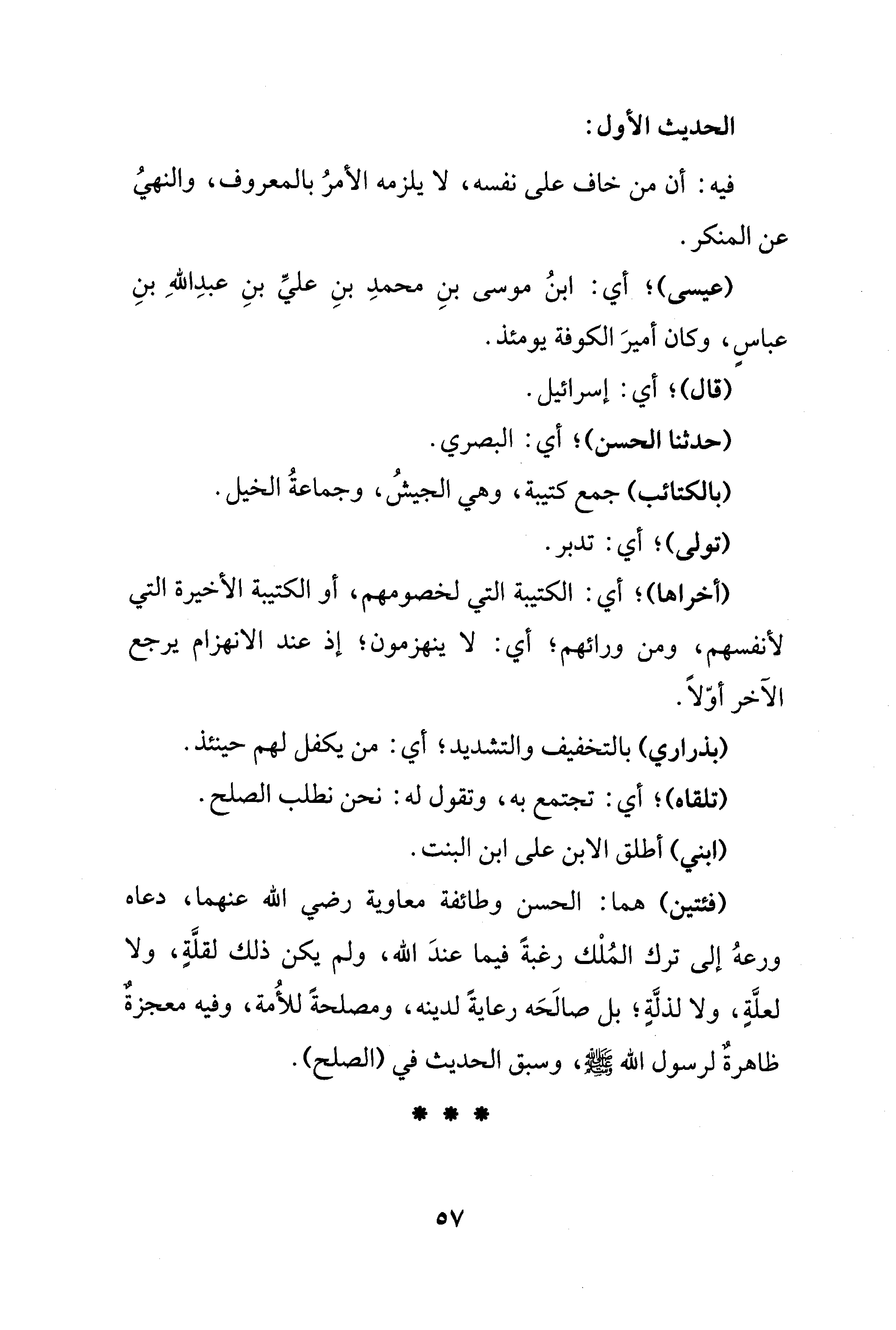 (فئتين) هما: الحسن وطائفة معاوية رضي الله عنهما، دعاه ورعهُ إلى ترك المُلْك رغبةً فيما عندَ الله، ولم يكن ذلك لقلَّةٍ، ولا لعلَّةٍ، ولا لذلَّةٍ؛ بل صالَحَه رعايةً لدينه، ومصلحةً للأُمة، وفيه معجزةٌ ظاهرةٌ لرسول الله - صلى الله عليه وسلم -، وسبق الحديث في (الصلح).