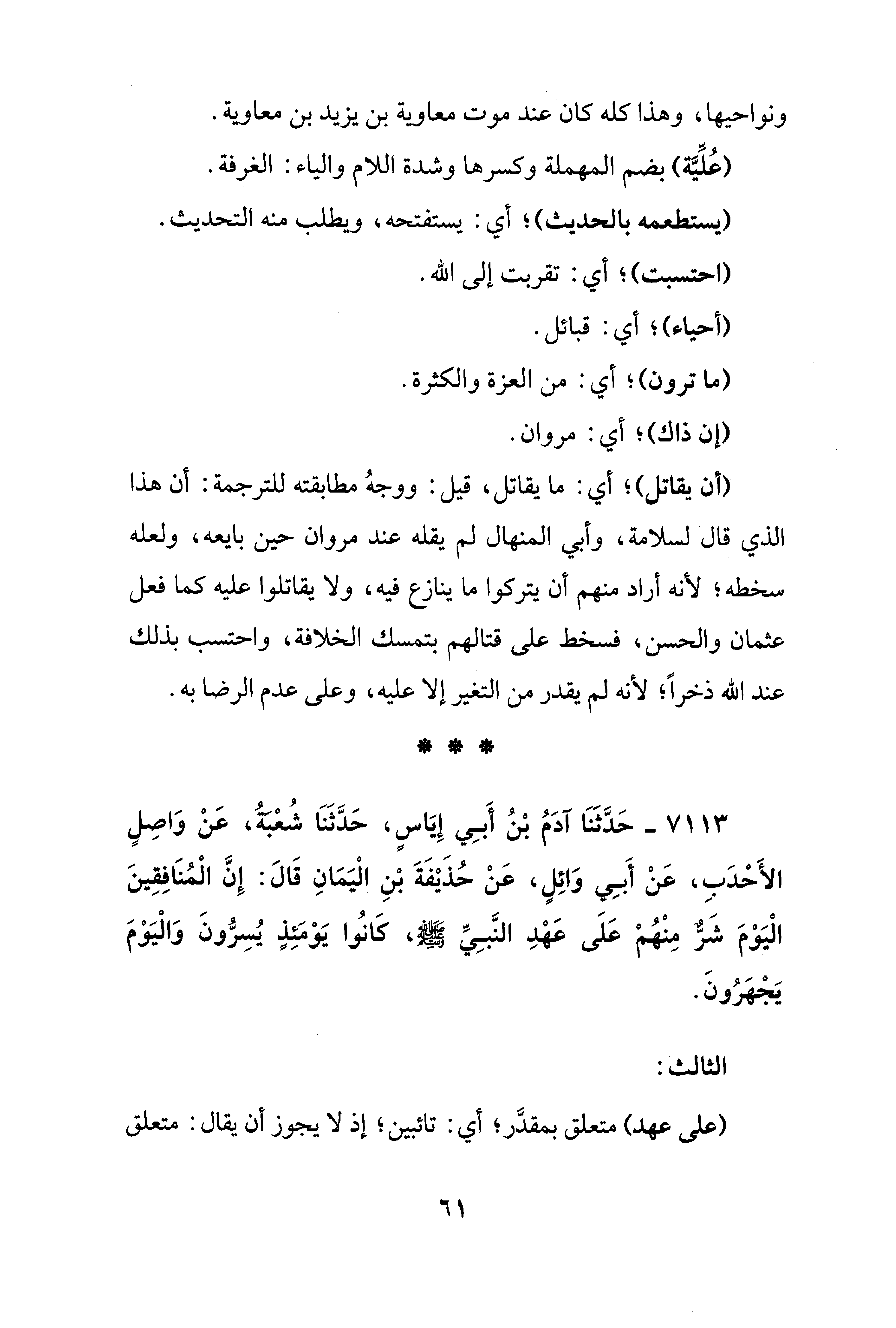 7113 - حَدَّثَنَا آدَمُ بْنُ أَبِي إِيَاسٍ، حَدَّثَنَا شُعْبةُ، عَنْ وَاصِلٍ الأَحْدَبِ، عَنْ أَبِي وَائِلٍ، عَنْ حُذَيْفَةَ بْنِ الْيَمَانِ قَالَ: إِنَّ الْمُنَافِقِينَ الْيَوْمَ شَرٌّ مِنْهُمْ عَلَى عَهْدِ النَّبِيِّ - صلى الله عليه وسلم -، كَانُوا يَوْمَئِذٍ يُسِرُّونَ وَالْيَوْمَ يَجْهَرُونَ.