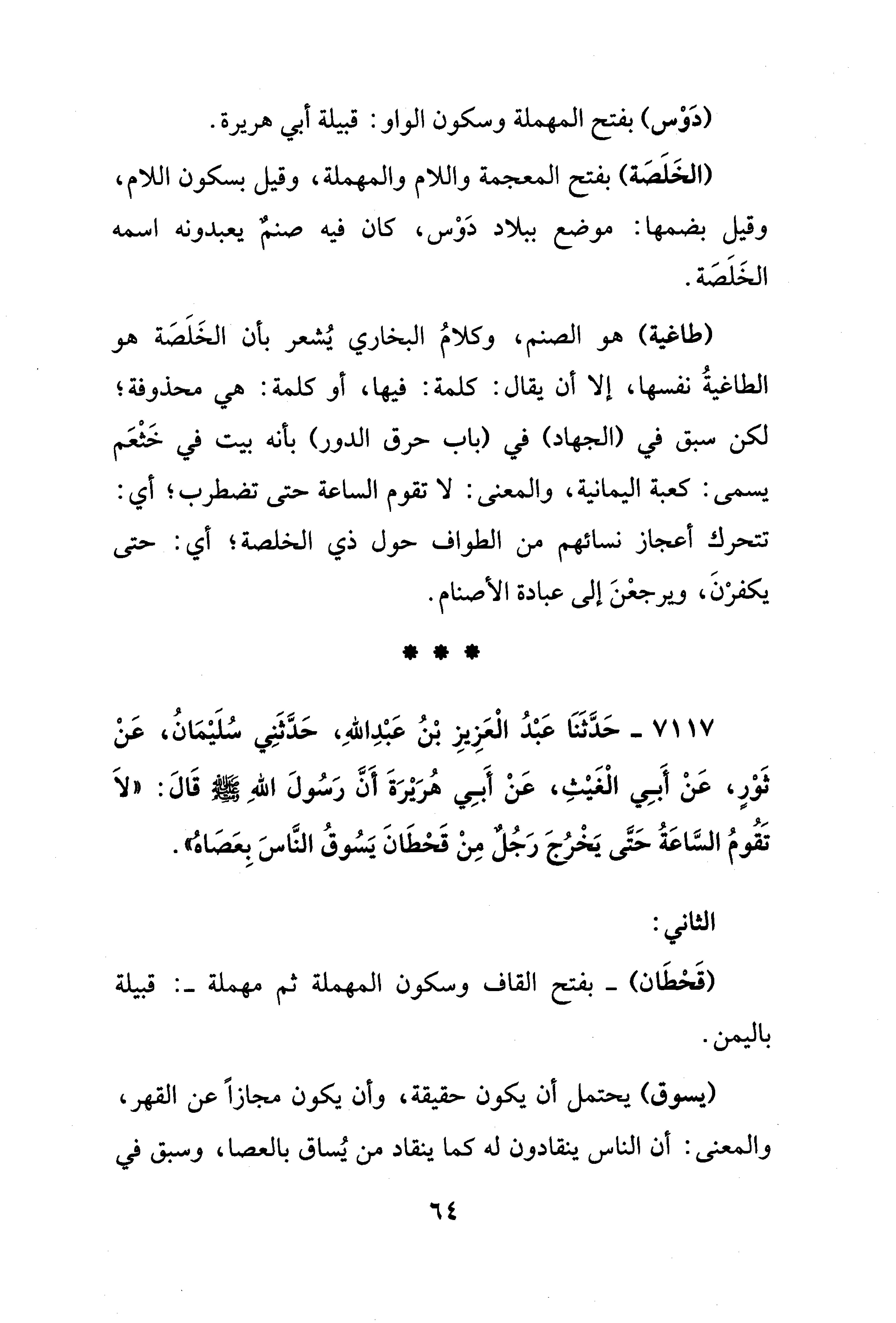 7117 - حَدَّثَنَا عَبْدُ الْعَزِيزِ بْنُ عَبْدِ اللهِ، حَدَّثَنِي سُلَيْمَانُ، عَنْ ثَوْرٍ، عَنْ أَبِي الْغَيْثِ، عَنْ أَبِي هُرَيْرَةَ أَنَّ رَسُولَ اللهِ - صلى الله عليه وسلم - قَالَ: "لَا تَقُومُ السَّاعَةُ حَتَّى يَخْرُجَ رَجُلٌ مِنْ قَحْطَانَ يَسُوقُ النَّاسَ بِعَصَاه".