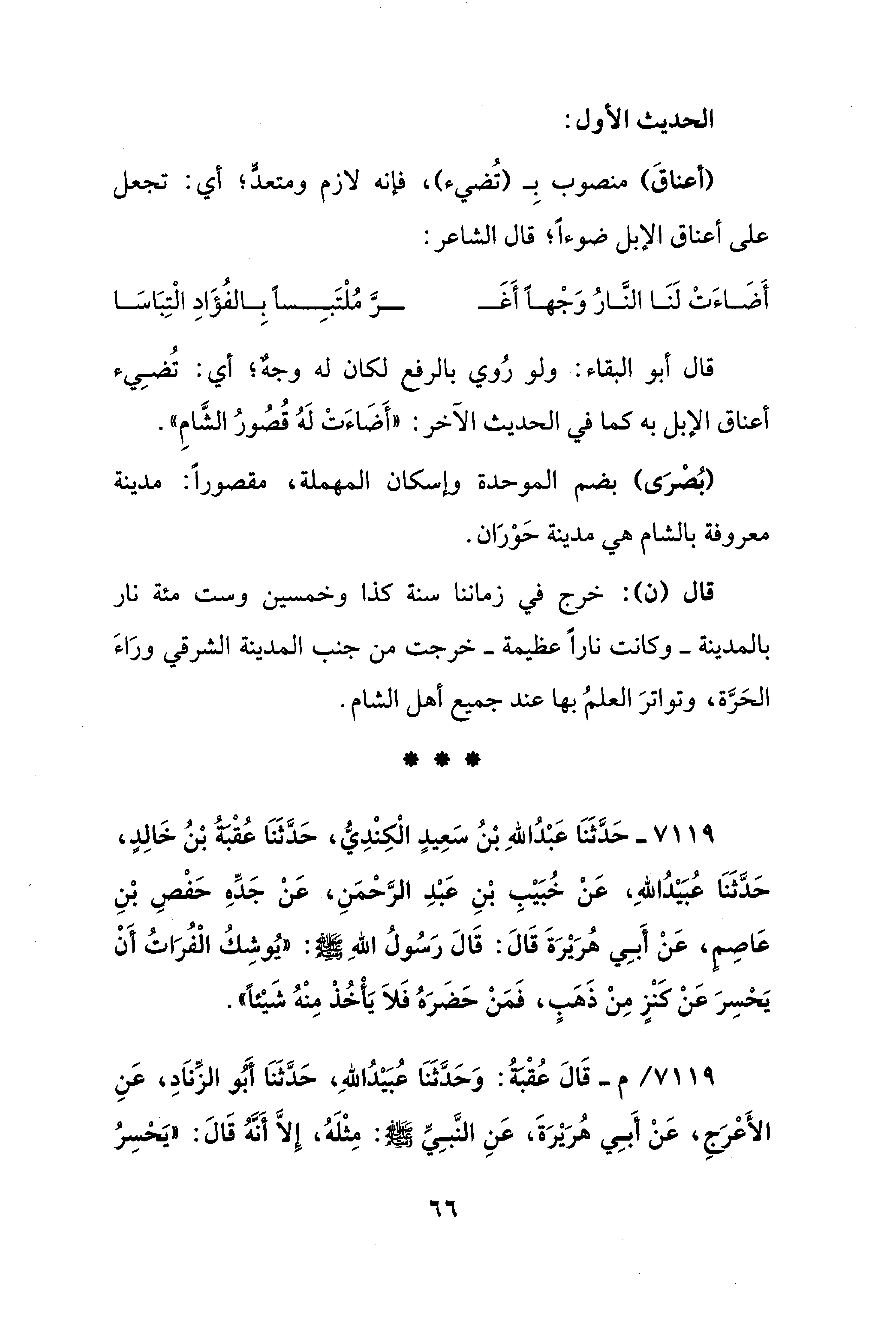 قال (ن): خرج في زماننا سنة كذا وخمسين وست مئة نار بالمدينة -وكانت نارًا عظيمة- خرجت من جنب المدينة الشرقي ورَاءَ الحَرَّة، وتواترَ العلمُ بها عند جميع أهل الشام.