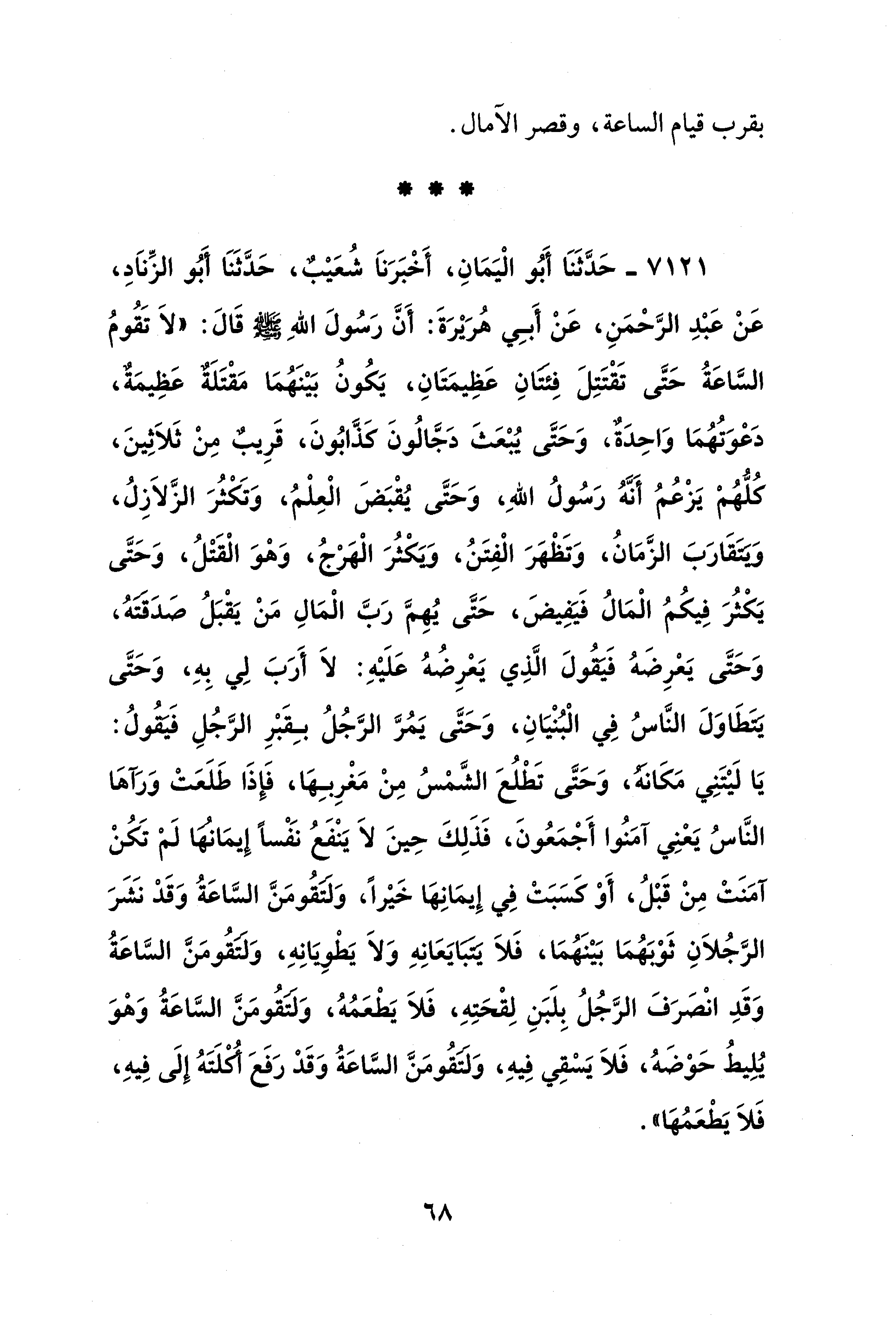 7121 - حَدَّثَنَا أَبُو الْيَمَانِ، أَخْبَرَنَا شُعَيْب، حَدَّثَنَا أَبُو الزِّنَادِ، عَنْ عَبْدِ الرَّحْمَنِ، عَنْ أَبِي هُرَيْرَةَ: أَنَّ رَسُولَ اللهِ - صلى الله عليه وسلم - قَالَ: "لَا تَقُومُ السَّاعَةُ حَتَّى تَقْتَتِلَ فِئتَانِ عَظِيمَتَانِ، يَكُونُ بَيْنَهُمَا مَقْتَلَة عَظِيمَةٌ، دَعْوَتُهُمَا وَاحِدَةٌ، وَحَتَّى يُبْعَثَ دَجَّالُونَ كَذَّابُونَ، قَرِيب مِنْ ثَلاَثِينَ، كُلُّهُمْ يَزْعُمُ أَنَّهُ رَسُولُ اللهِ، وَحَتَّى يُقْبَضَ الْعِلْمُ، وَتَكْثُرَ الزَّلاَزِلُ، وَيتقَارَبَ الزَّمَانُ، وَتَظْهَرَ الْفِتَنُ، وَيَكْثُرَ الْهَرْجُ، وَهْوَ الْقَتْلُ، وَحَتَّى يَكْثُرَ فِيكُمُ الْمَالُ فَيَفِيض، حَتَّى يُهِمَّ رَبَّ الْمَالِ مَنْ يَقْبَلُ صَدَقتَهُ، وَحَتَّى يَعْرِضَهُ فَيقُولَ الَّذِي يَعْرِضُهُ عَلَيْهِ: لَا أَرَبَ لِي بِهِ، وَحَتَّى يتطَاوَلَ النَّاسُ فِي الْبُنْيَانِ، وَحَتَّى يَمُرَّ الرَّجُلُ بِقَبْرِ الرَّجُلِ فَيقُولُ: يَا لَيْتَنِي مَكَانه، وَحَتَّى تَطْلُعَ الشَّمْسُ مِنْ مَغْرِبِهَا، فَإِذَا طَلَعَتْ وَرَآهَا النَّاسُ يَعْنِي آمَنُوا أَجْمَعُونَ، فَذَلِكَ حِينَ لَا يَنْفَعُ نَفْسًا إِيمَانها لَمْ تَكُنْ آمَنَتْ مِنْ قَبْلُ، أَوْ كسَبَتْ فِي إِيمَانِهَا خَيْرًا، وَلتقُومَنَّ السَّاعَةُ وَقَدْ نَشَرَ الرَّجُلاَنِ ثَوْبَهُمَا بَيْنَهُمَا، فَلَا يتبَايَعَانِهِ وَلَا يَطْوِيانِهِ، وَلتقُومَنَّ السَّاعَةُ وَقَدِ انْصَرَفَ الرَّجُلُ بِلَبَنِ لِقْحَتِهِ، فَلَا يَطْعَمُهُ، وَلتقُومَنَّ السَّاعَةُ وَهْوَ يُلِيطُ حَوْضَهُ، فَلَا يَسْقِي فِيهِ، وَلتقُومَنَّ السَّاعَةُ وَقَدْ رَفَعَ أكلَتَهُ إِلَى فِيهِ، فَلَا يَطْعَمُهَا".