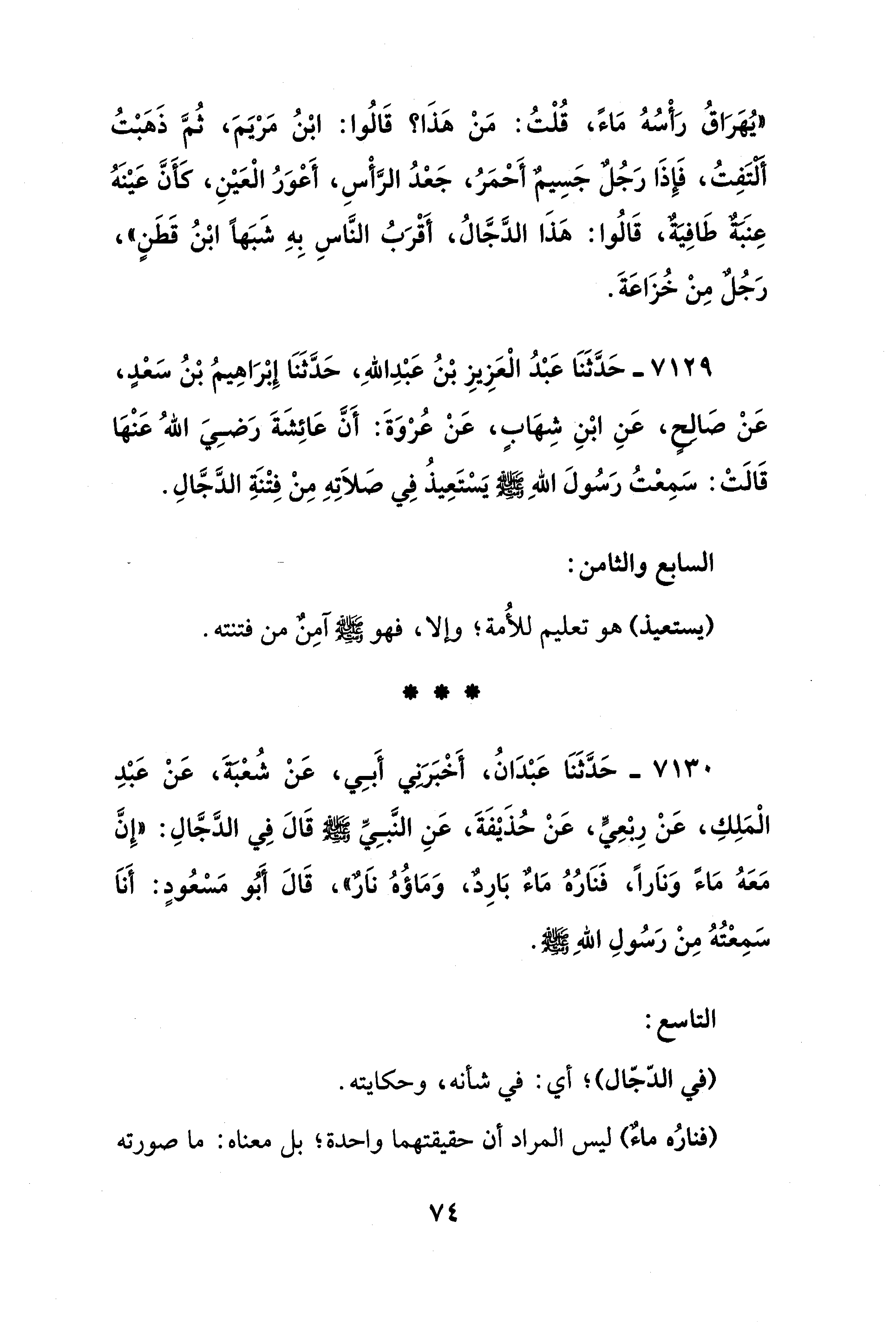 7129 - حَدَّثَنَا عَبْدُ الْعَزِيزِ بْنُ عَبْدِ اللهِ، حَدَّثَنَا إِبْرَاهِيمُ بْنُ سَعْدٍ، عَنْ صَالحٍ، عَنِ ابْنِ شِهَابٍ، عَنْ عُرْوَةَ: أَنَّ عَائِشَةَ رَضِيَ اللهُ عَنْهَا قَالَتْ: سَمِعْتُ رَسُولَ اللهِ - صلى الله عليه وسلم - يسْتَعِيذُ فِي صَلاَتِهِ مِنْ فِتْنَةِ الدَّجَّالِ.
