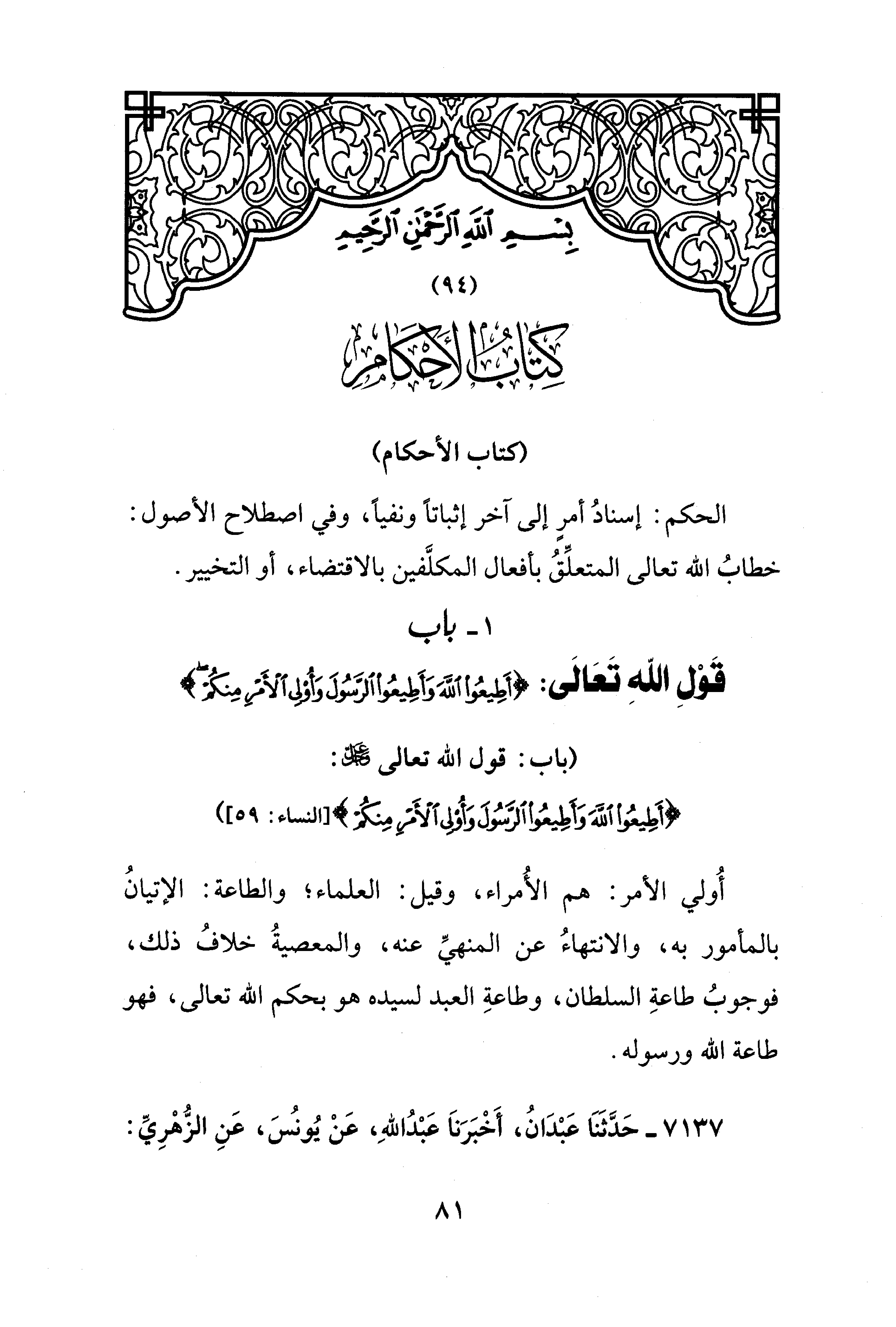 1 - باب قولِ اللهِ تَعَالى: {أَطِيعُوا اللَّهَ وَأَطِيعُوا الرَّسُولَ وَأُولِي الْأَمْرِ مِنْكُمْ}