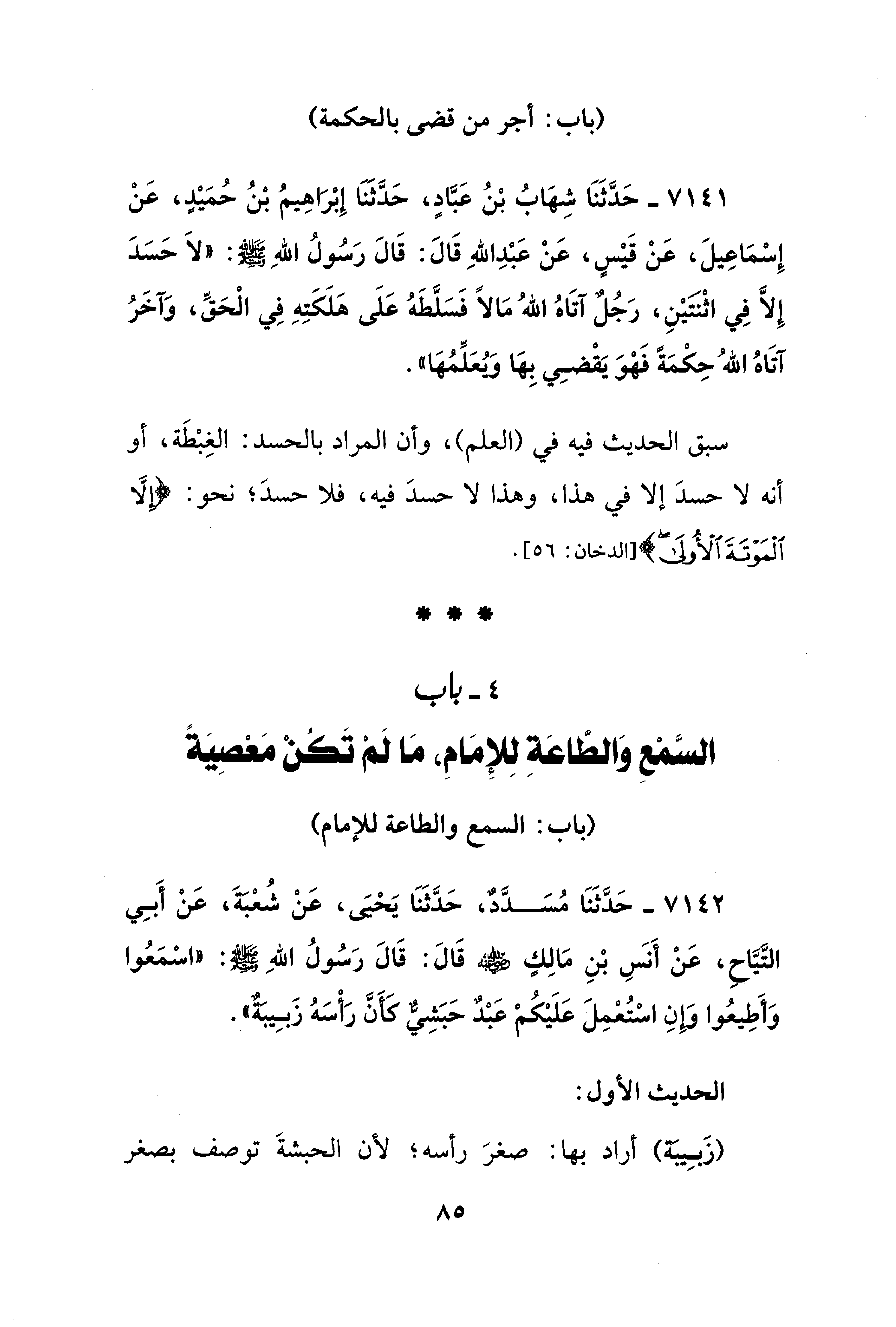 7141 - حَدَّثَنَا شِهَابُ بْنُ عَبَّادٍ، حَدَّثَنَا إِبْرَاهِيمُ بْنُ حُمَيْد، عَنْ إِسْمَاعِيلَ، عَنْ قَيْسٍ، عَنْ عَبْدِ اللهِ قَالَ: قَالَ رَسُولُ اللهِ - صلى الله عليه وسلم -: "لَا حَسَدَ إِلَّا فِي اثْنتَيْنِ، رَجُلٌ آتَاهُ اللهُ مَالًا فَسَلَّطَهُ عَلَى هَلَكَتِهِ فِي الْحَقِّ، وَآخَرُ آتَاهُ اللهُ حِكْمَةً فَهْوَ يَقْضِي بِهَا وَيُعَلِّمُهَا".