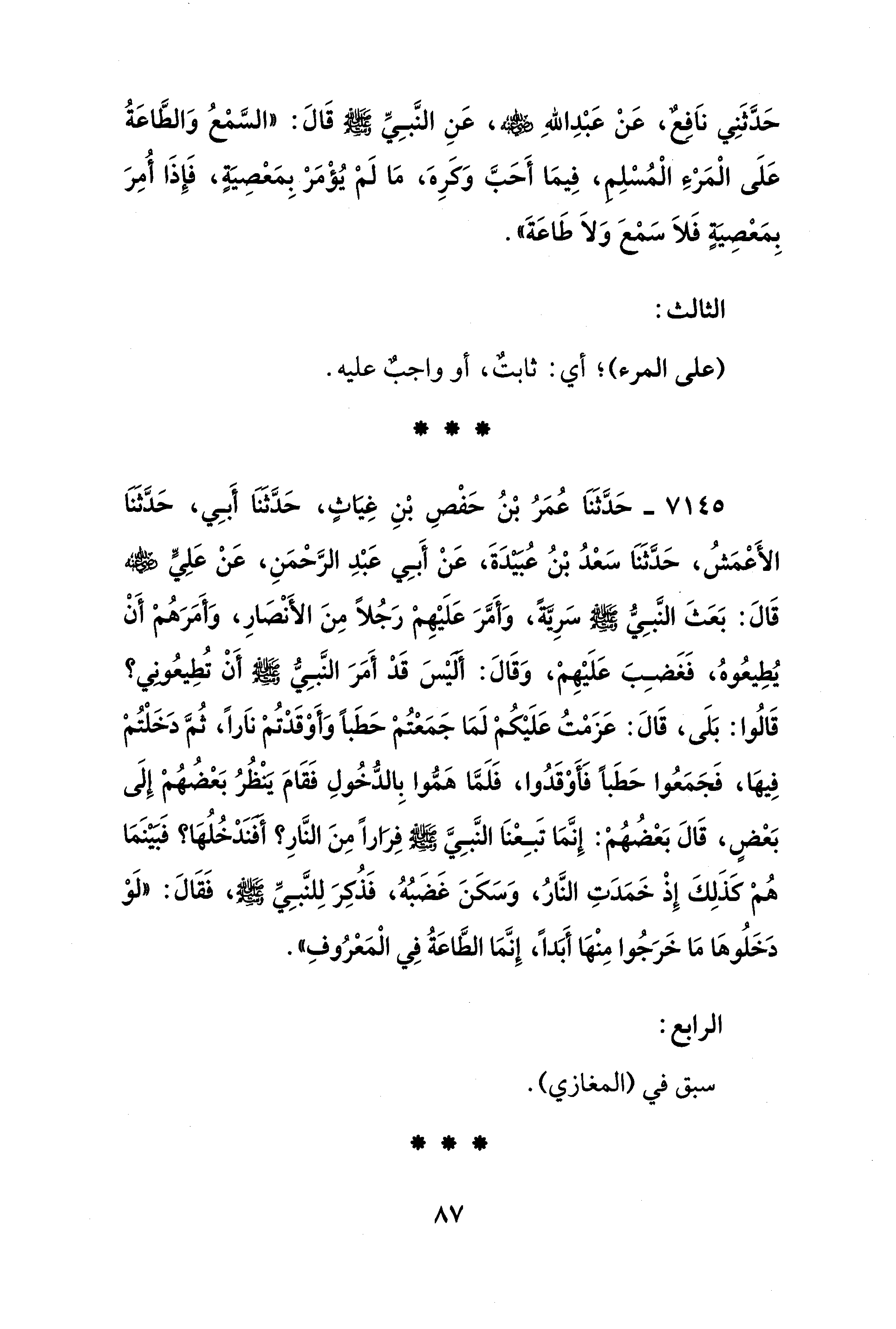 حَدَّثَنِي نَافِعٌ، عَنْ عَبْدِ الله - رضي الله عنه -، عَنِ النَّبِيِّ - صلى الله عليه وسلم - قَالَ: "السَّمْعُ وَالطَّاعَةُ عَلَى الْمَرْءِ الْمُسْلِم، فِيمَا أَحَبَّ وَكَرِهَ، مَا لَمْ يُؤْمَرْ بِمَعْصِية، فَإِذَا أُمِرَ بِمَعْصِيَةٍ فَلَا سَمعَ وَلَا طَاعَةَ".