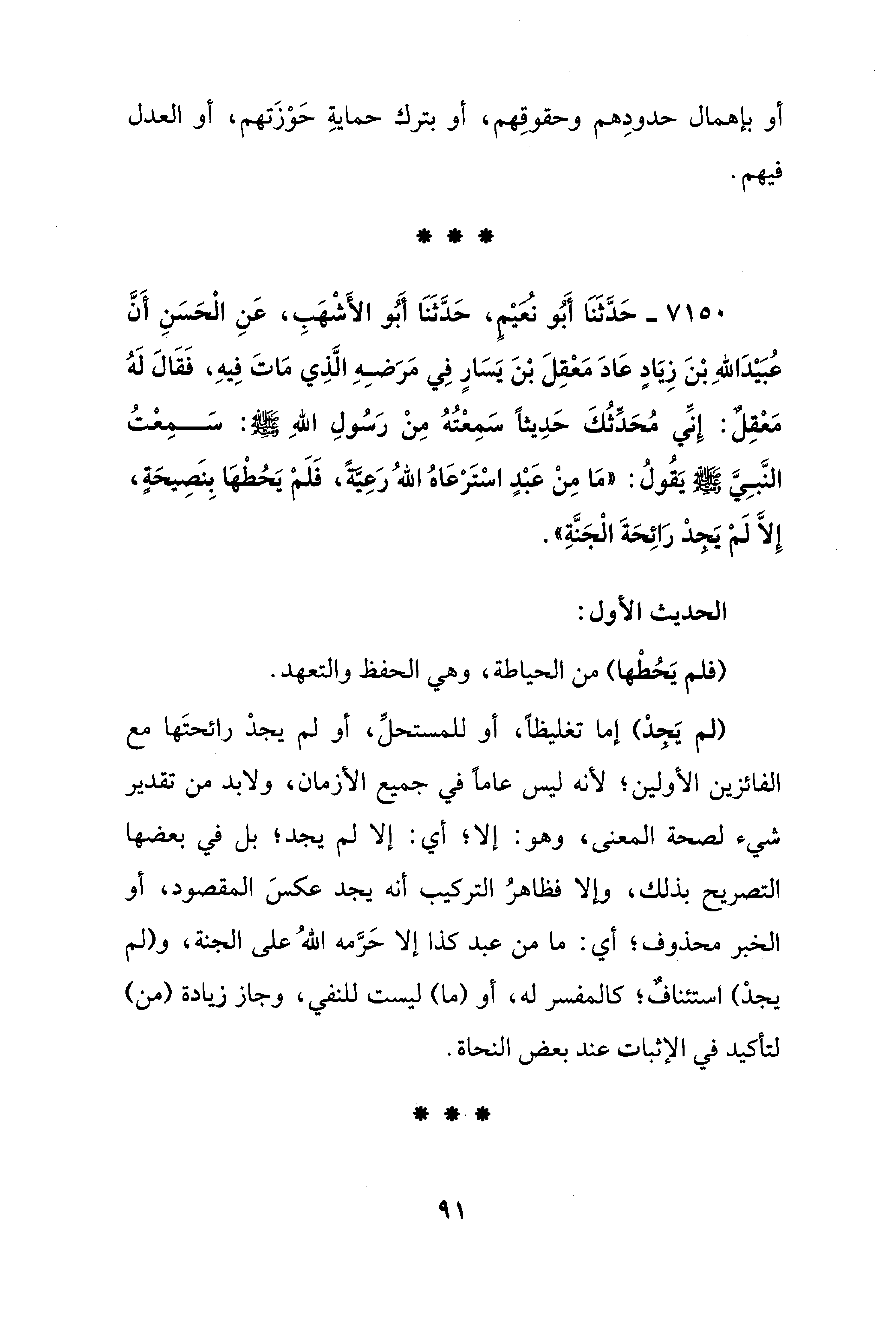 7150 - حَدَّثَنَا أَبُو نُعَيْمٍ، حَدَّثَنَا أَبُو الأَشْهَبِ، عَنِ الْحَسَنِ أَنَّ عُبَيْدَ اللهِ بْنَ زِيَادٍ عَادَ مَعْقِلَ بْنَ يَسَارٍ فِي مَرَضِهِ الَّذِي مَاتَ فِيهِ، فَقَالَ لَهُ مَعْقِلٌ: إِنِّي مُحَدِّثُكَ حَدِيثًا سَمِعْتُهُ مِنْ رَسُولِ اللهِ - صلى الله عليه وسلم -: سَمِعْتُ النَّبِيَّ - صلى الله عليه وسلم - يَقُولُ: "مَا مِنْ عَبْدٍ اسْتَرْعَاهُ اللهُ رَعِيةً، فَلَمْ يَحُطْهَا بِنَصِيحَةٍ، إِلَّا لَمْ يَجدْ رَائِحَةَ الْجَنَّةِ".