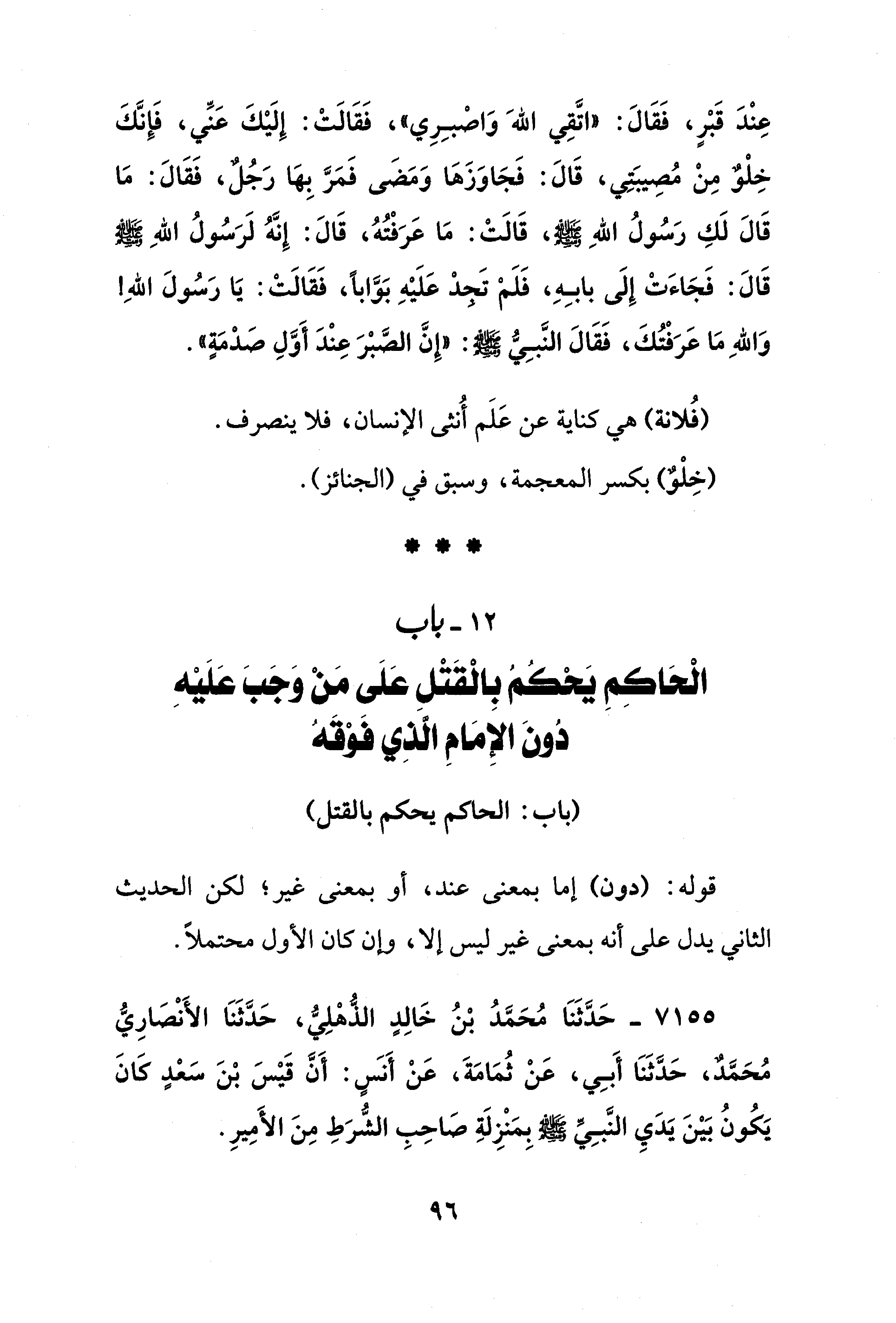 عِنْدَ قَبْرٍ، فَقَالَ: "اتَّقِي اللهَ وَاصْبِرِي"، فَقَالَتْ: إِلَيْكَ عَنّي، فَإِنَّكَ خِلْو مِنْ مُصِيبَتِي، قَالَ: فَجَاوَزَهَا وَمَضَى فَمَرَّ بِهَا رَجُل، فَقَالَ: مَا قَالَ لَكِ رَسُولُ اللهِ - صلى الله عليه وسلم -، قَالَتْ: مَا عَرَفْتُهُ، قَالَ: إِنَّهُ لَرَسُولُ اللهِ - صلى الله عليه وسلم - قَالَ: فَجَاءَتْ إِلَى بابِهِ، فَلَمْ تَجدْ عَلَيْهِ بَوَّابًا، فَقَالَتْ: يَا رَسُولَ اللهِ وَاللهِ مَا عَرَفْتُكَ، فَقَالَ النَّبِي - صلى الله عليه وسلم -: "إِنَّ الصَّبرَ عِنْدَ أَوَّلِ صَدْمَةٍ".