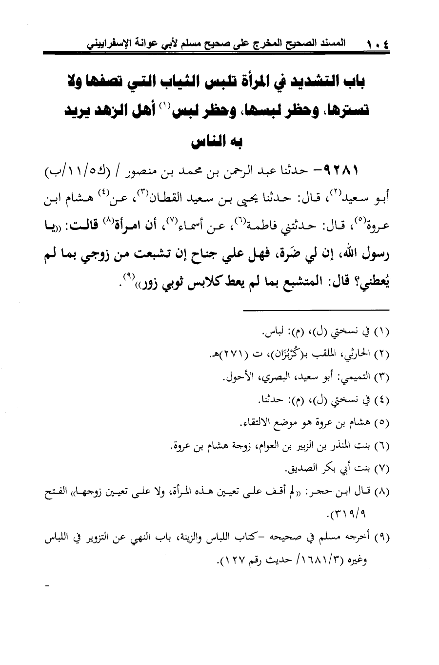9281 - حدثنا عبد الرحمن بن محمد بن منصور أبو سعيد (¬1)، قال: حدثنا يحيى بن سعيد القطان (¬2)، عن (¬3) هشام ابن عروة (¬4)، قال: حدثتني فاطمة (¬5)، عن أسماء (¬6)، أن امرأة (¬7) قالت: "يا رسول الله، إن لي ضَرة، فهل علي جناح إن تشبعت من زوجي بما لم يُعطني؟ قال: المتشبع بما لم يعط كلابس ثوبي زور" (¬8).