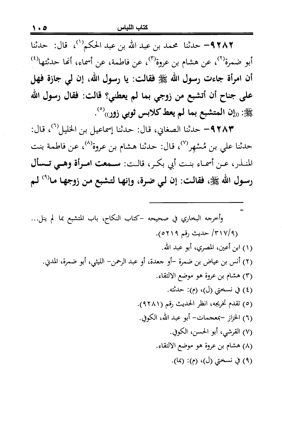 9282 - حدثنا محمد بن عبد الله بن عبد الحكم (¬1)، قال: حدثنا أبو ضمرة (¬2)، عن هشام بن عروة (¬3)، عن فاطمة، عن أسماء، أنها حدثتها (¬4) أن امرأة جاءت رسول الله -صلى الله عليه وسلم- فقالت: يا رسول الله، إن لي جازة فهل على جناح أن أتشبع من زوجي بما لم يعطني؟ قالت: فقال رسول الله -صلى الله عليه وسلم-: "إن المتشبع بما لم يعط كلابس ثوبي زور" (¬5).