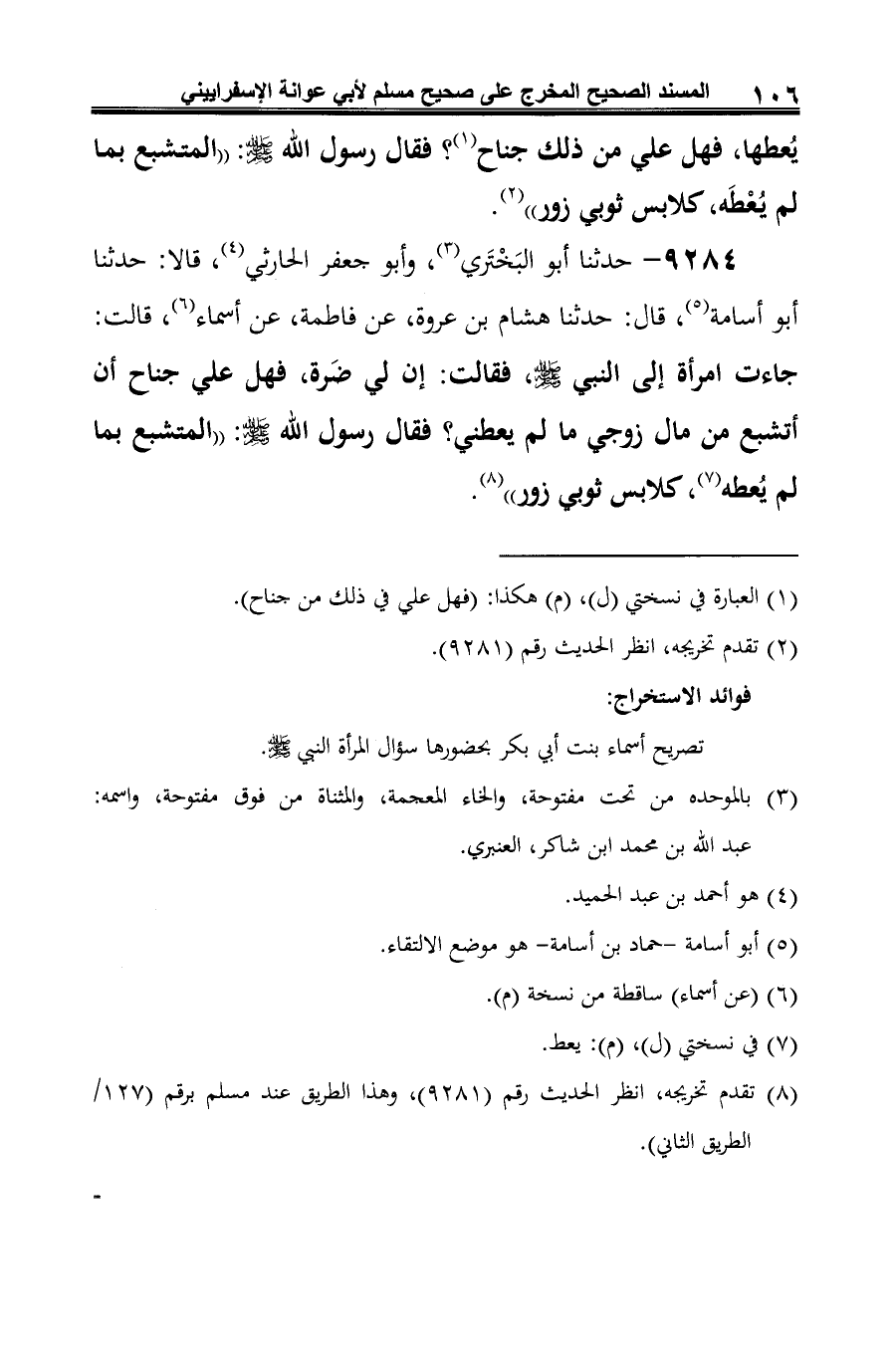 -ذكر متن رواية أبي أسامة -حماد بن أسامة- ومسلم ساق إسنادها دون المتن. تنبيه: في نسختي (ل)، (م) جاء حديث الواصلة والمستوصلة، بعد هذا الحديث، وليس هنا موضعه وسيأتي برقم (9294).