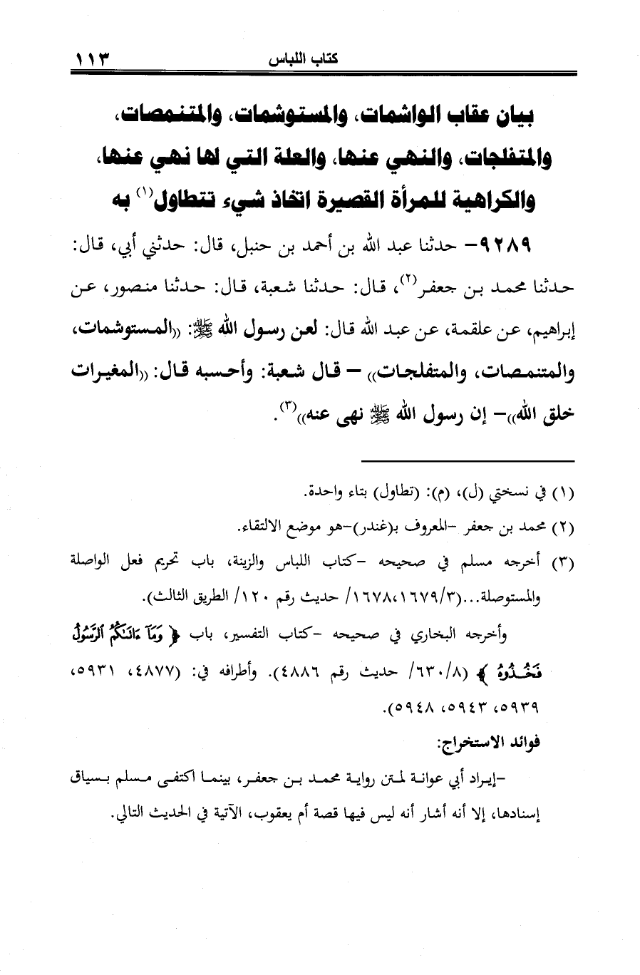 9289 - حدثنا عبد الله بن أحمد بن حنبل، قال: حدثني أبي، قال: حدثنا محمد بن جعفر (¬1)، قال: حدثنا شعبة، قال: حدثنا منصور، عن إبراهيم، عن علقمة، عن عبد الله قال: لعن رسول الله -صلى الله عليه وسلم-: "المستوشمات، والمتنمصات، والمتفلجات" -قال شعبة: وأحسبه قال: "المغيرات خلق الله"- إن رسول الله -صلى الله عليه وسلم- نهى عنه" (¬2).