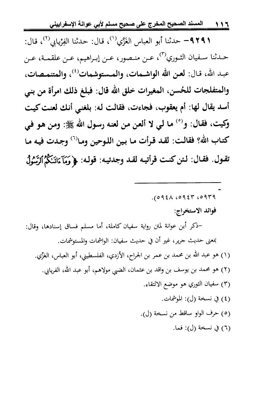 9291 - حدثنا أبو العباس الغَزِّي (¬1)، قال: حدثنا الفِرْيابي (¬2)، قال: حدثنا سفيان الثوري (¬3)، عن منصور، عن إبراهيم، عن علقمة، عن عبد الله، قال: لعن الله الواشمات، والمستوشمات (¬4)، والمتنمصات، والمتفلجات للحُسن، المغيرات خلق الله قال: فبلغ ذلك امرأة من بني أسد يقال لها: أم يعقوب، فجاءت، فقالت له: بلغني أنك لعنت كيت وكيت، فقال: و (¬5) ما لي لا ألعن من لعنه رسول الله -صلى الله عليه وسلم-: ومن هو في كتاب الله؟ فقالت: لقد قرأت ما بين اللوحين وما (¬6) وجدت فيه ما تقول. فقال: لئن كنت قرأتيه لقد وجدتيه: قوله: {وَمَا آتَاكُمُ الرَّسُولُ
